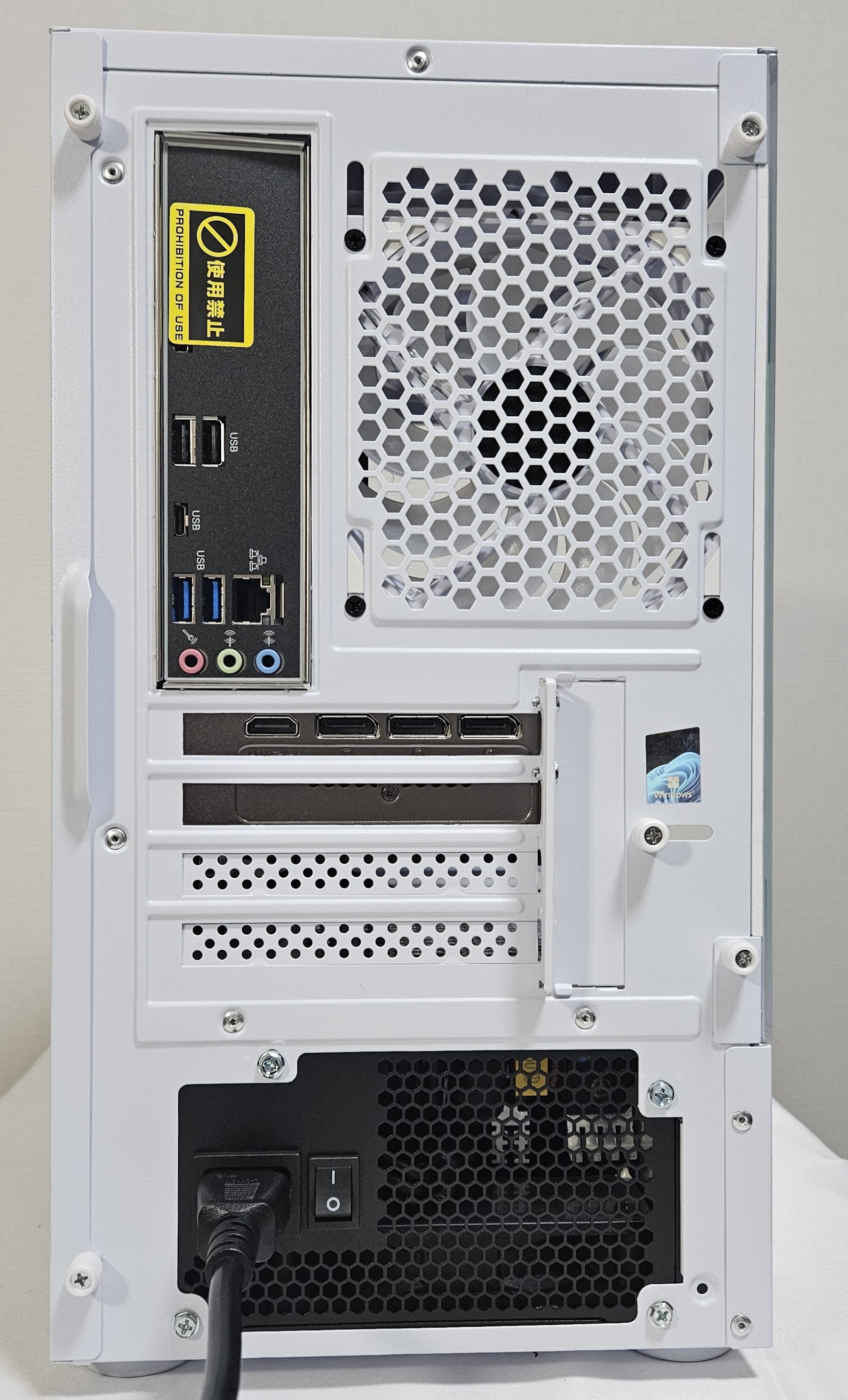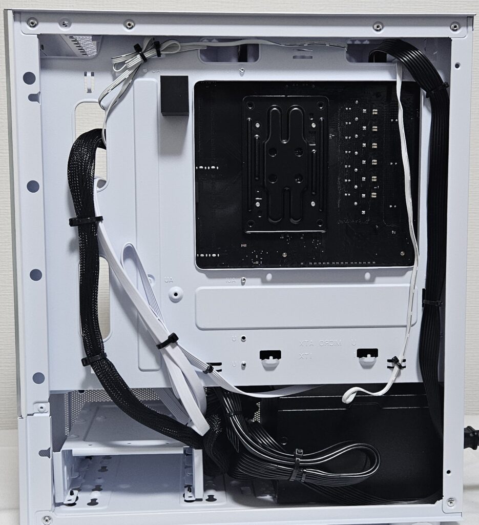 背部もすべてホワイト色になっていますが、電源やマザボードまではホワイトになっていませんので、白黒という見た目になります。