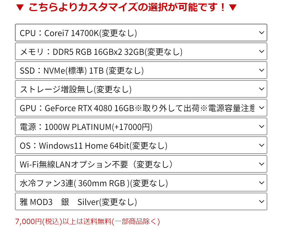 パーツ選択でRTX 4080にアップグレードしたゲーミングPCです。