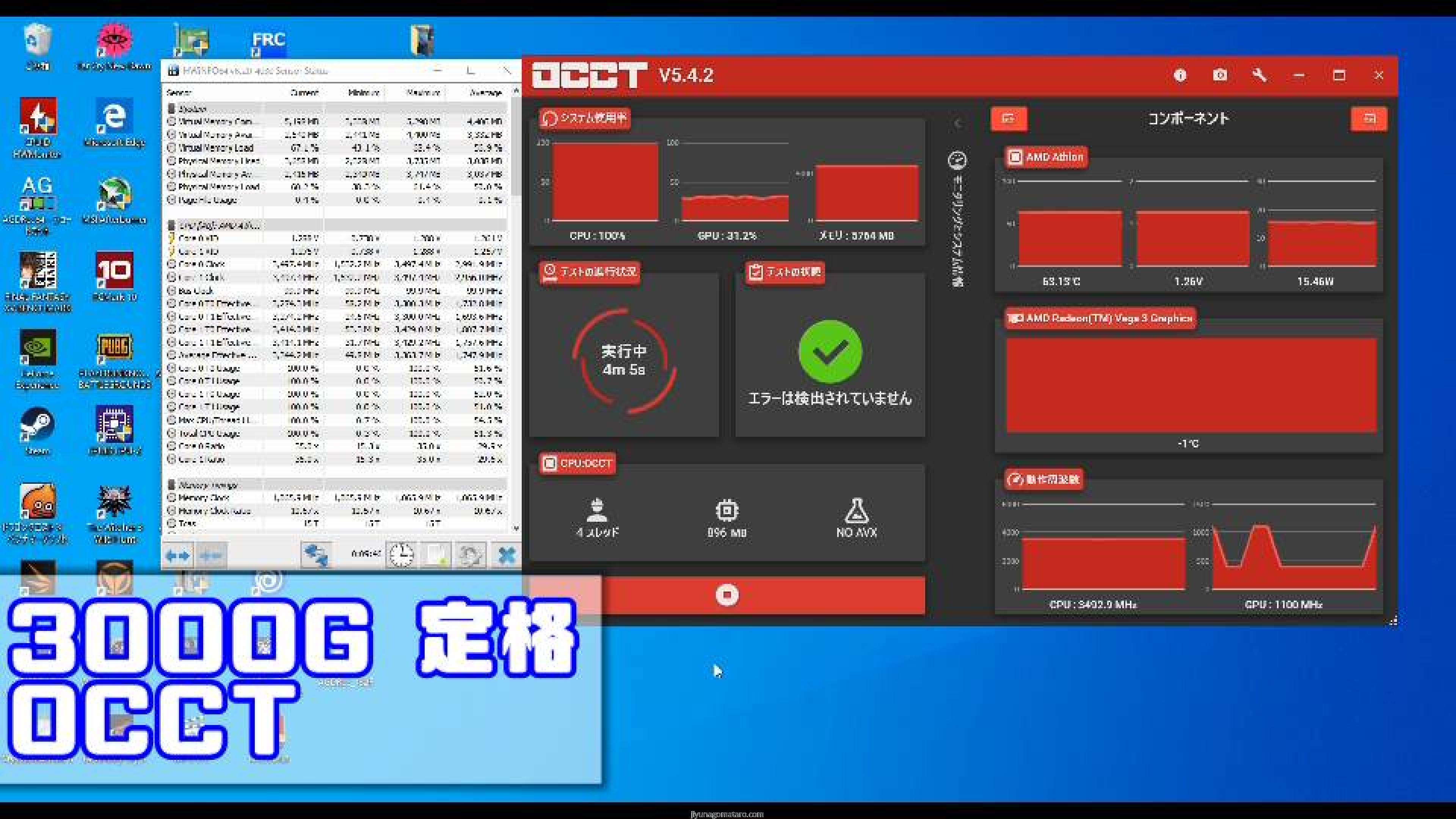 そこでOCCTソフトを使いCPUに100%負荷をかけ、温度の測定しました。