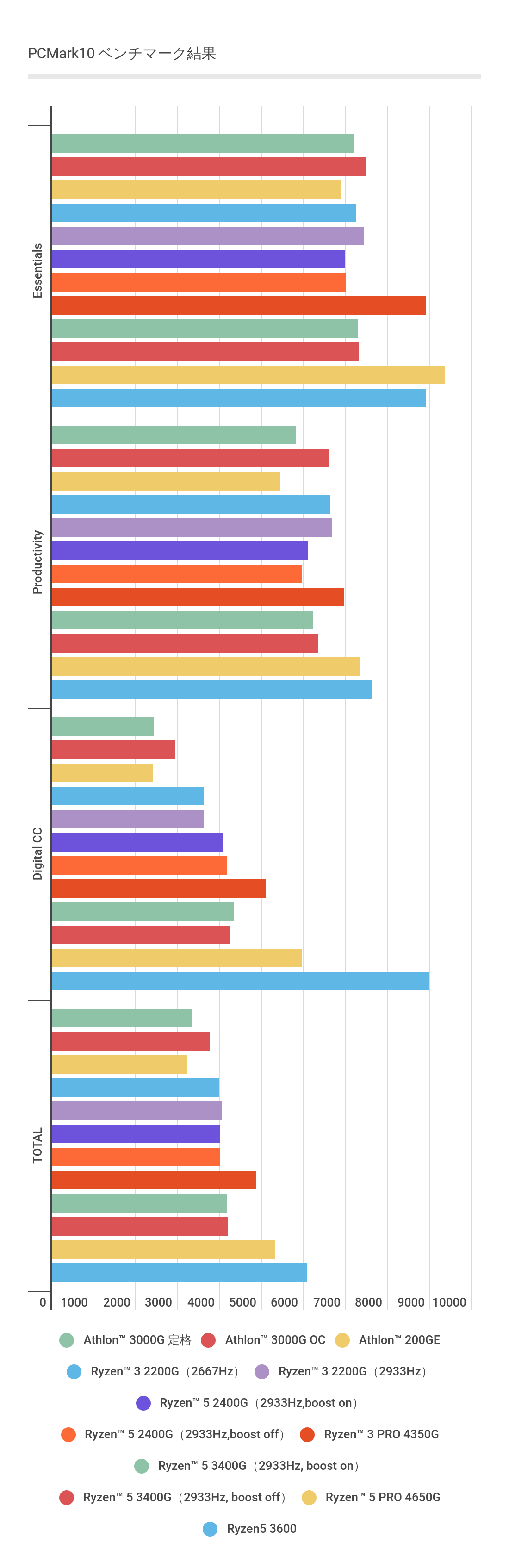 次に日常的なPCの快適さを測るべく、PC Mark10を比較します。