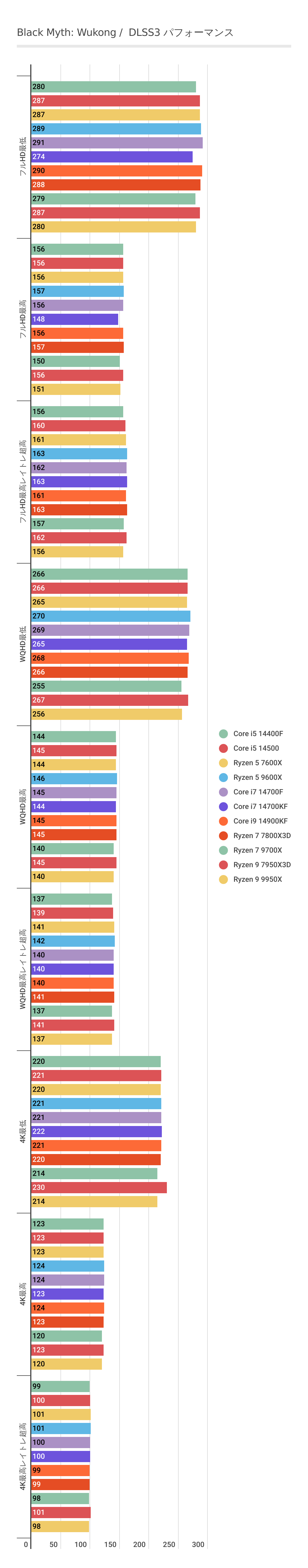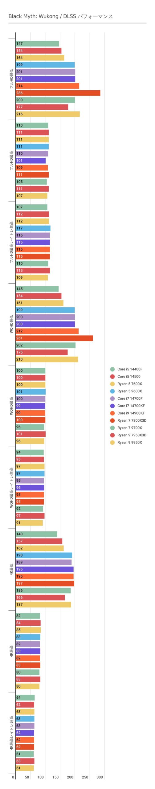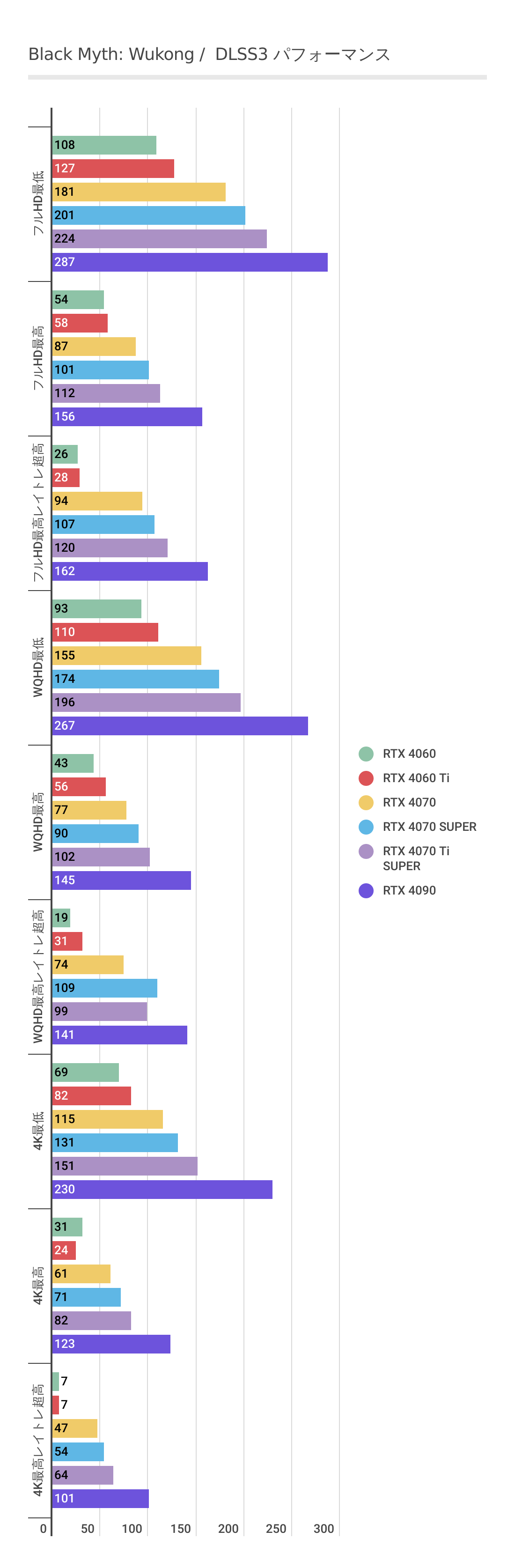 黒神話:悟空のDLSS3利用時の各グラフィックボードのフレームレート結果