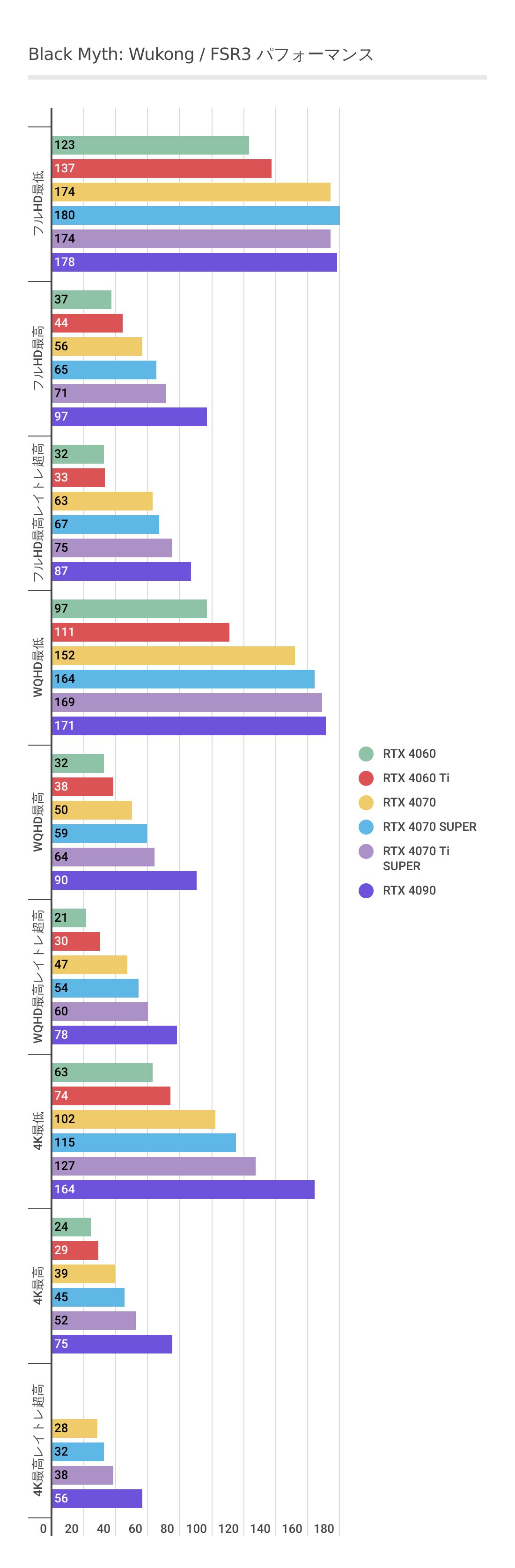 黒神話:悟空のFSR3利用時の各グラフィックボードのフレームレート結果
