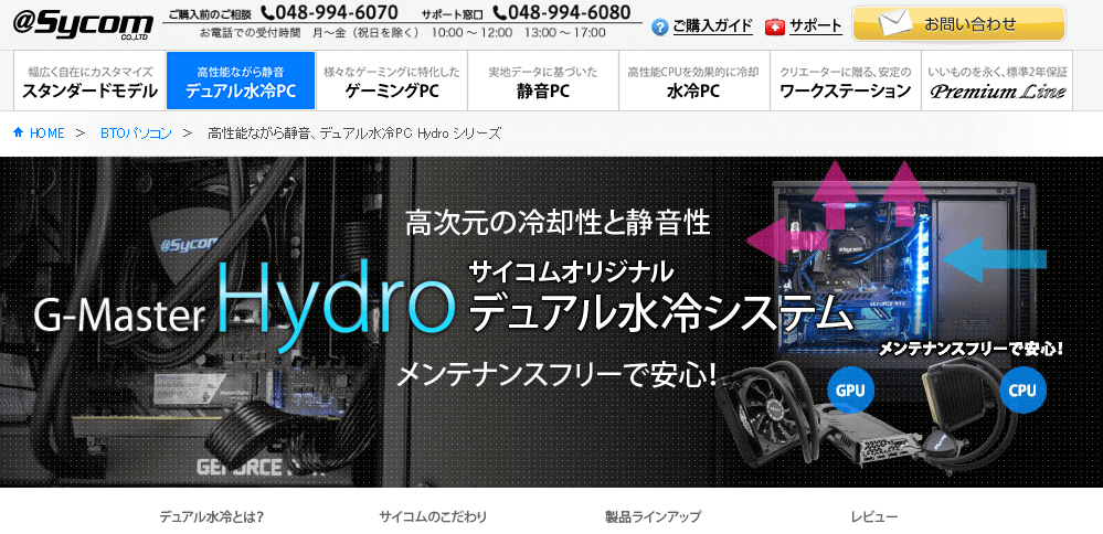 サイコム | 中上級者 | 中価格~最高価格 | ★2 | ★3 | ★5 | ★5 | ★4 | 少ない | ない | 最短2日 | 平日10:00-17:00 (12-13除) | 1年間(3年間) 一部2年間(3年間) | 水冷・静音PC |