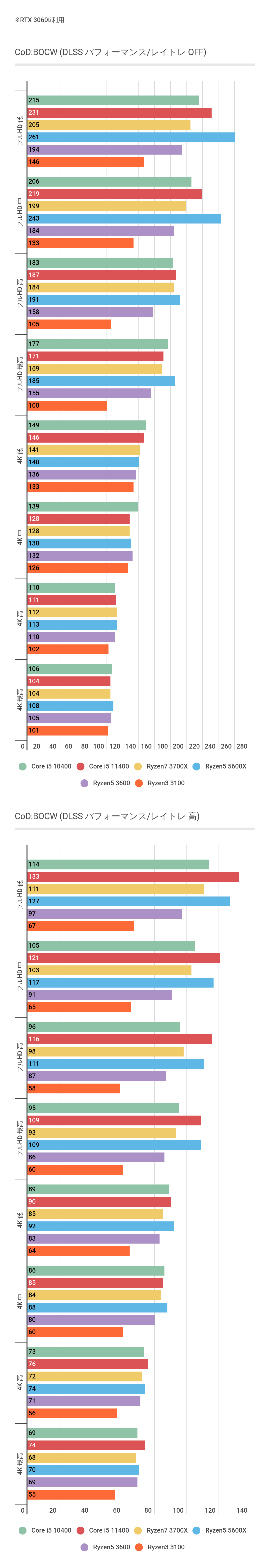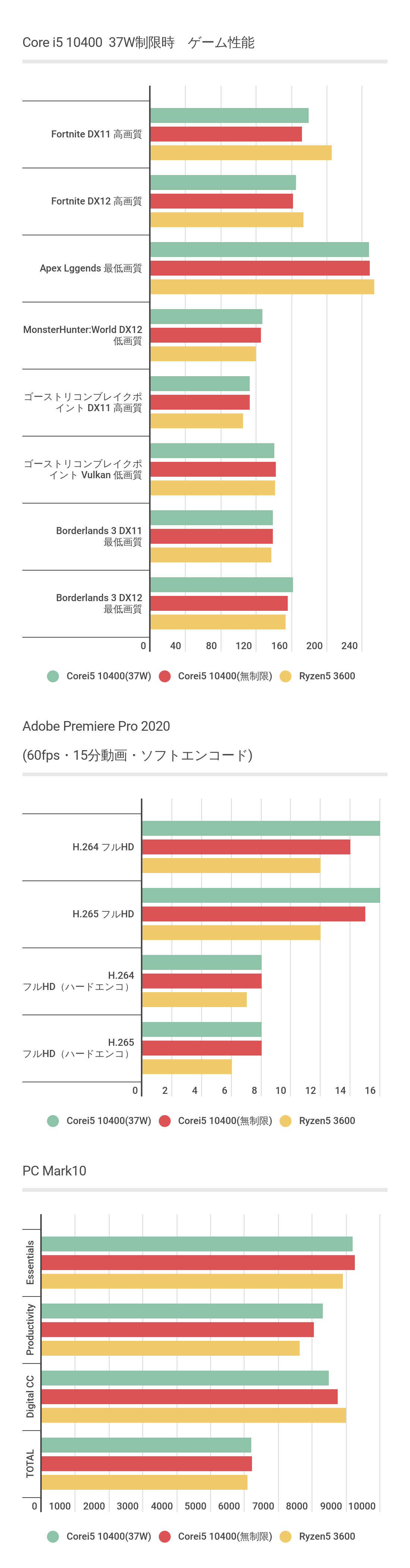 Ryzen 5 3600に対してCore i5 10400のほうが安定して高性能な結果となっています。