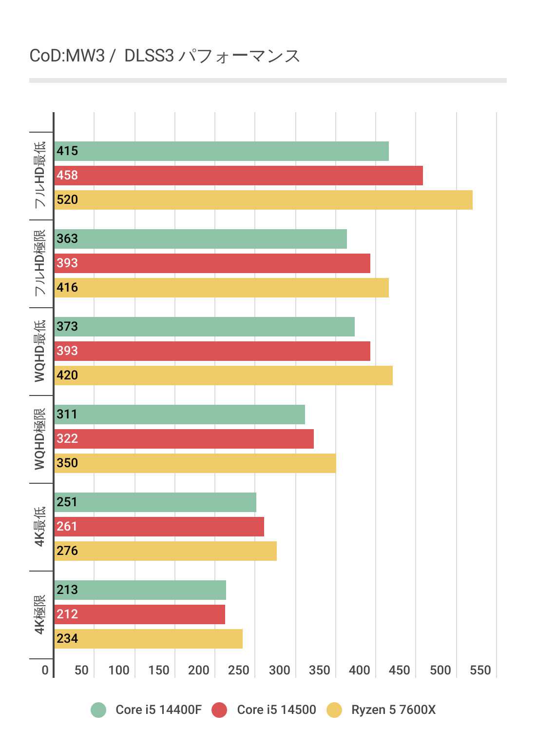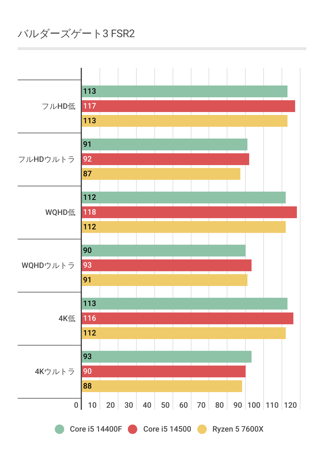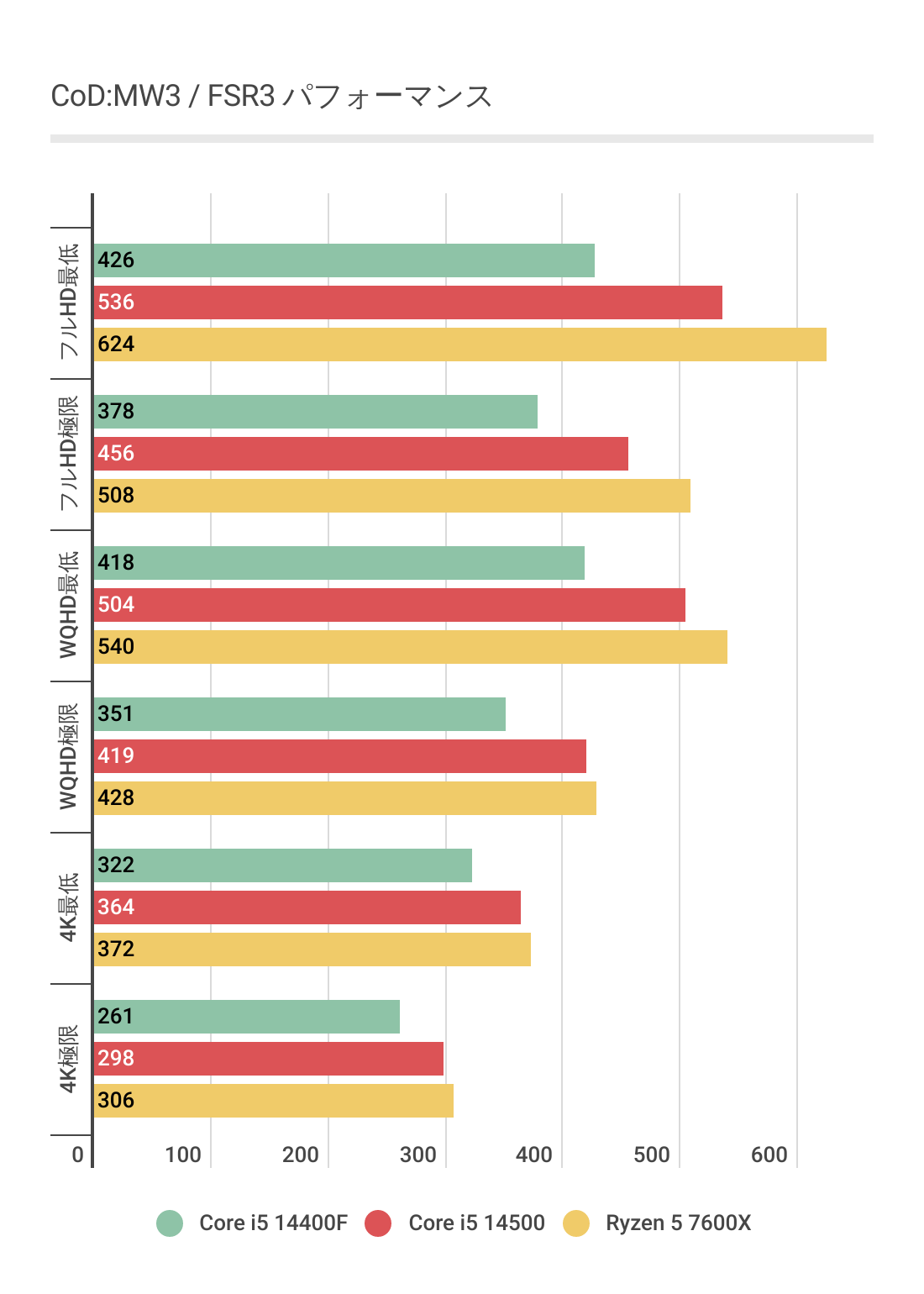 今度はCore i5 14400Fが最も劣後しており、Core i5 14500とRyzen 5 7600Xのフレームレートはほぼ互角となっています。