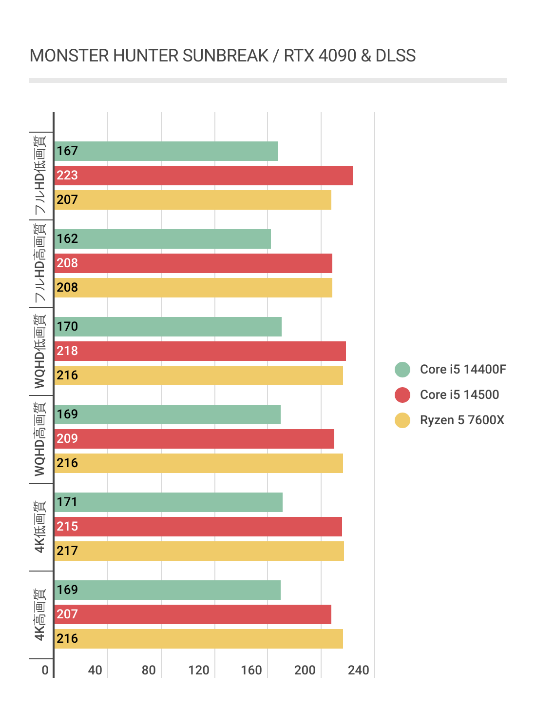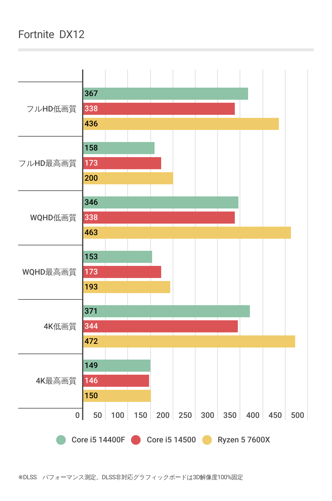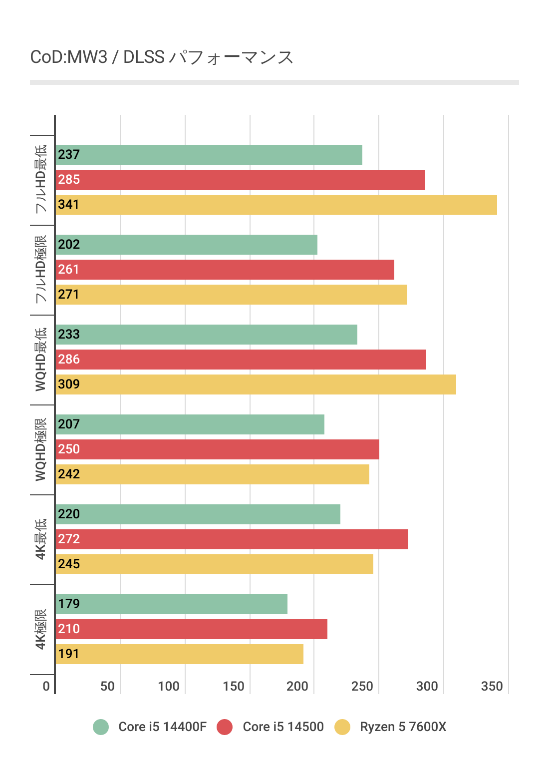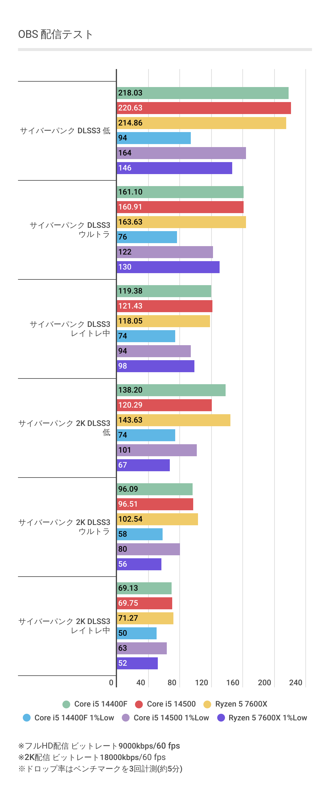 今度はCore i5 14400Fが最も劣後しており、Core i5 14500とRyzen 5 7600Xのフレームレートはほぼ互角となっています。