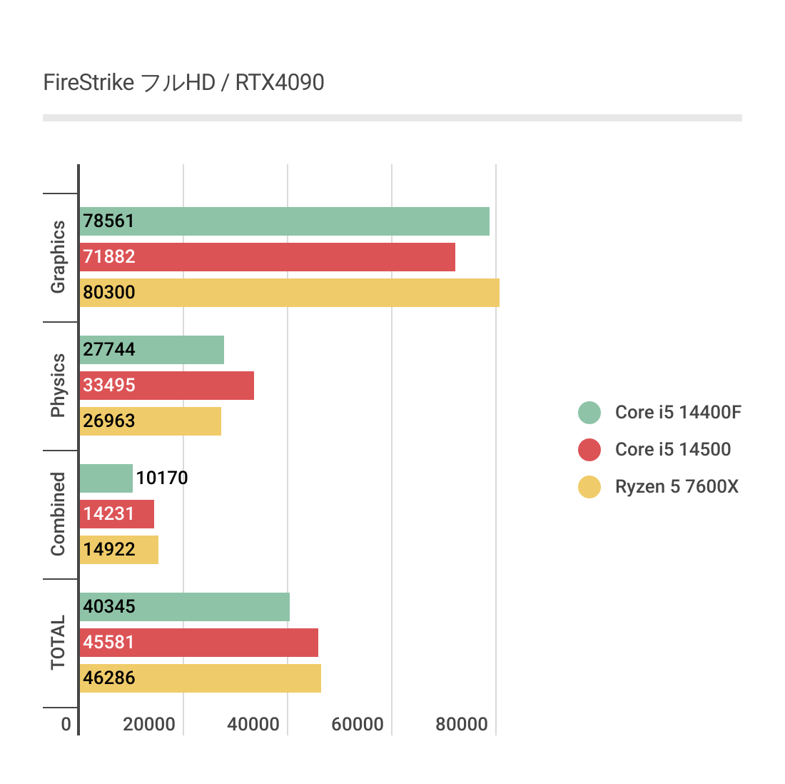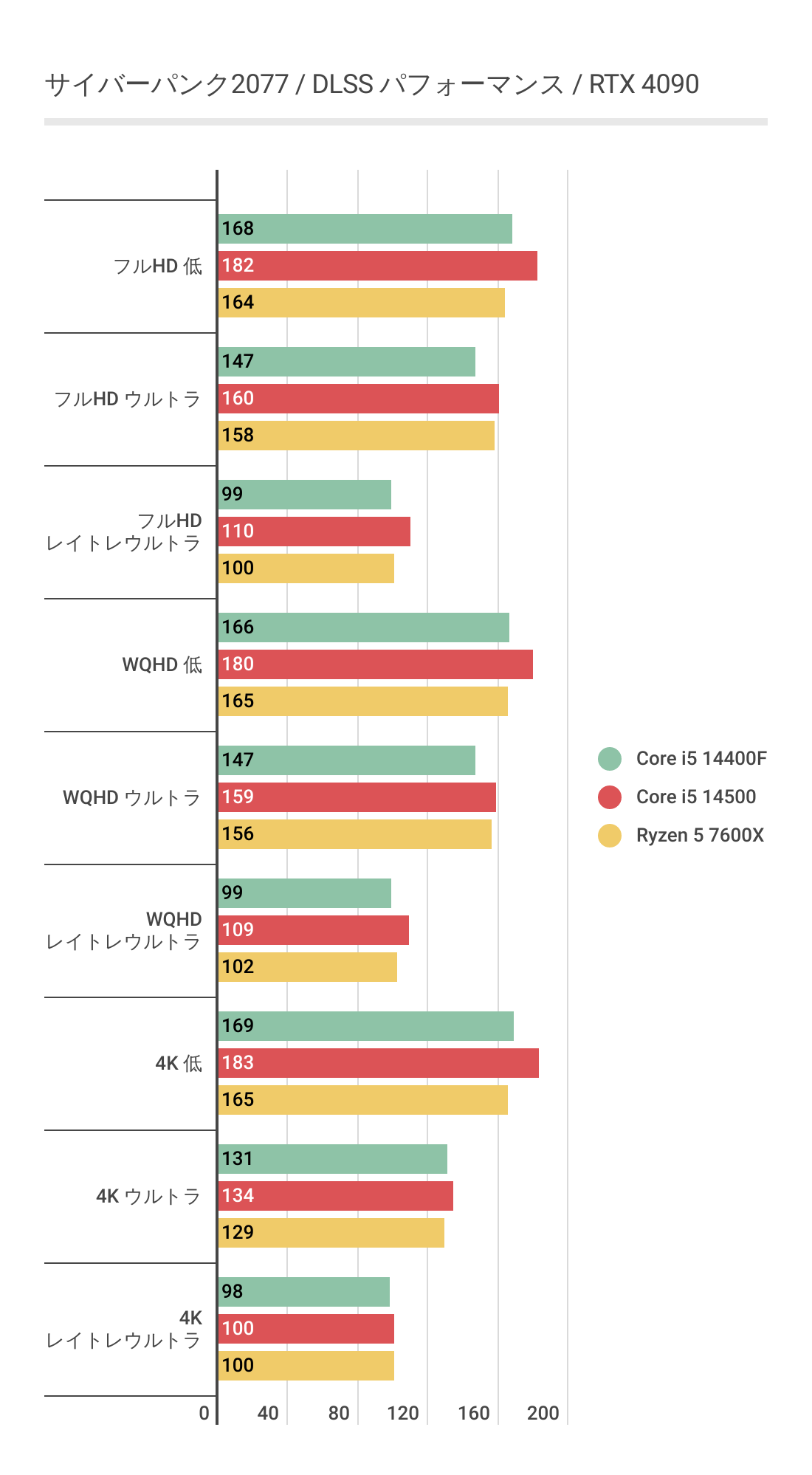 4KでもCore i5 14500が最もスコアが高い傾向は変わらず、特にRyzen 5 7600Xとはかなり差がでています。