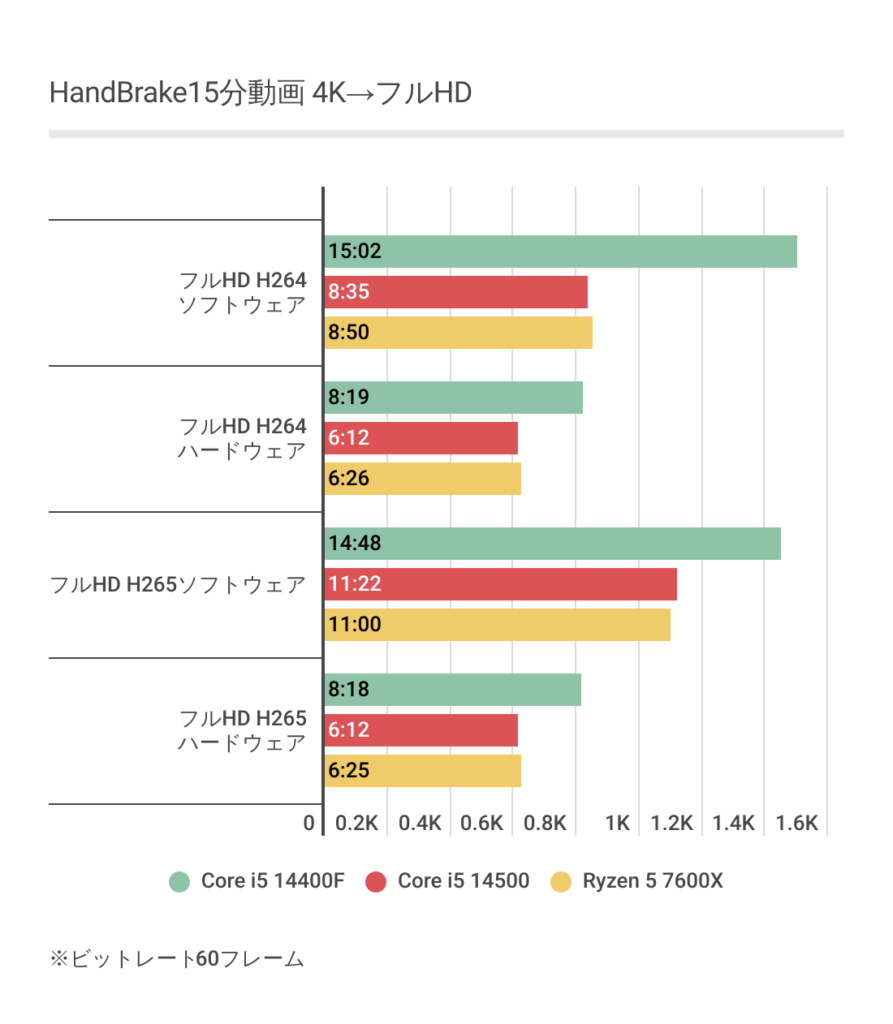 基本的にはソフトもハードウェアエンコードも概ねCore i5 14500がわずかに優位ですが、