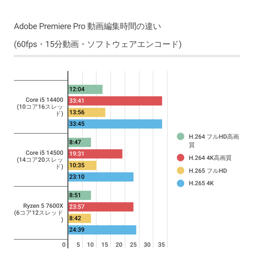 明らかにRyzen 5 7600Xが最も優位な結果になっており、Core i5 14500は全体的に3分ほど遅いです。