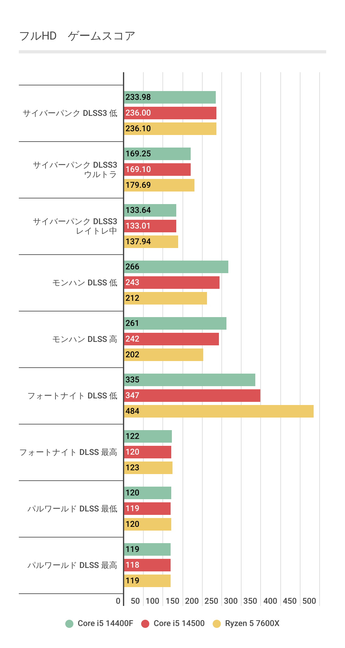 フルHDではCore i5 14500が最もパフォーマンスが高い結果に。