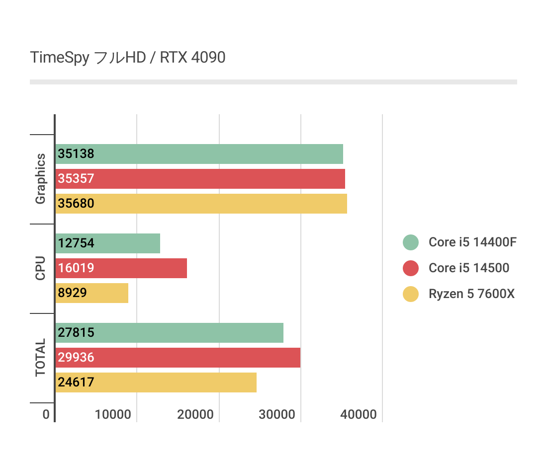 TOTALスコアではCore i5 14400Fに対して約13%もCore i5 14500が高く、これは結構な差。