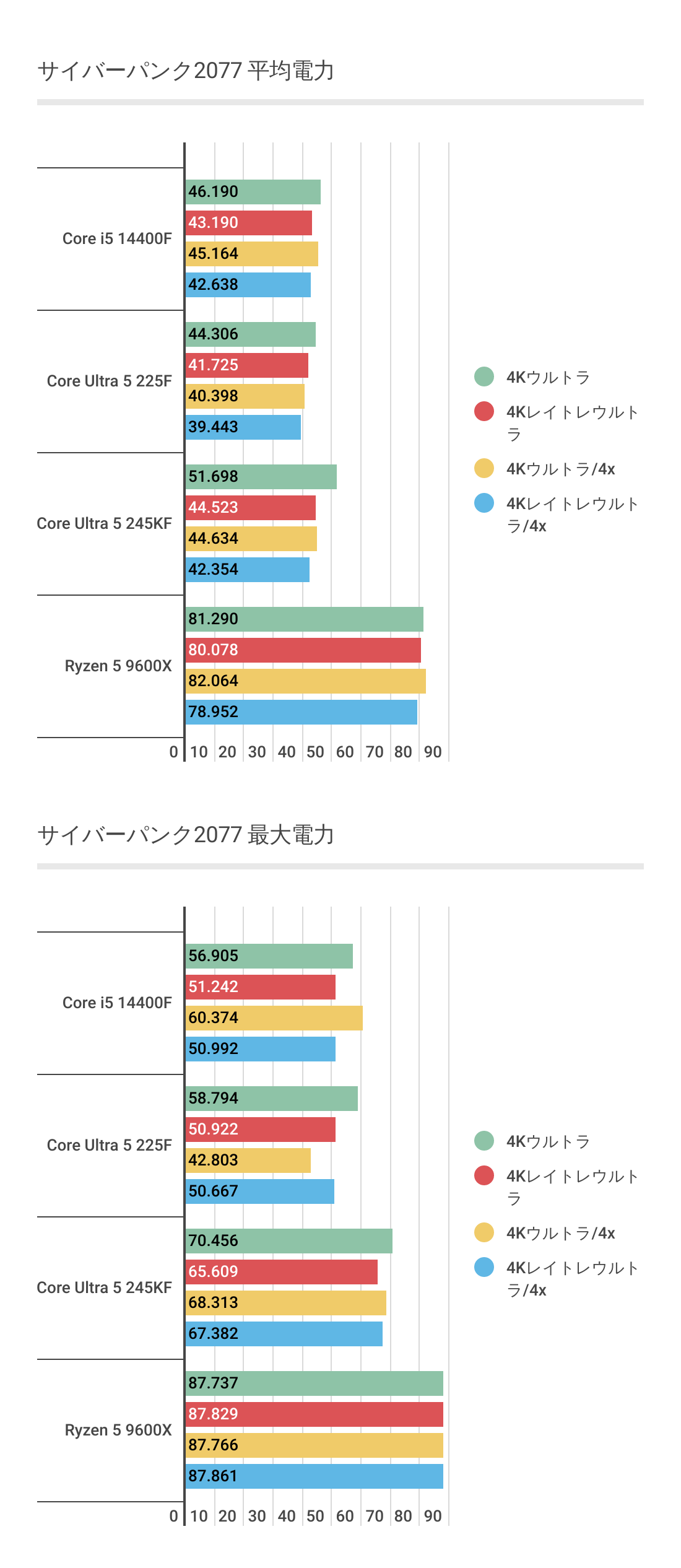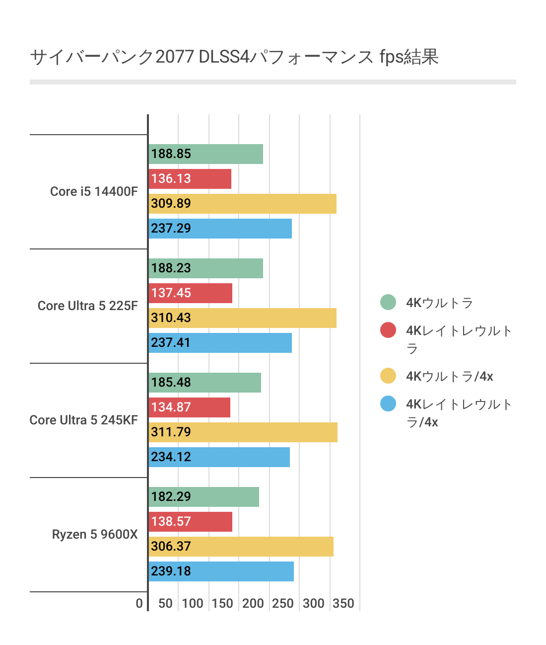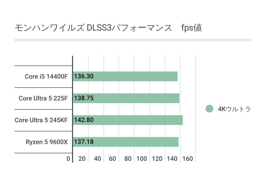 ただ4Kになると少し結果が変わっており、Core Ultra 5 225FがRyzen 5 9600Xに勝っているのはもちろんですが、Core i5 14400Fも上回る結果となっており、かなり上々です。