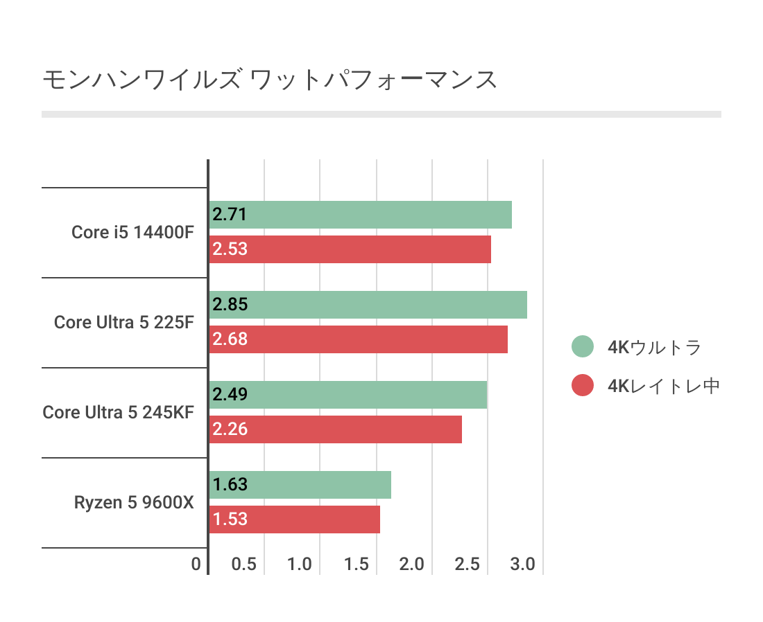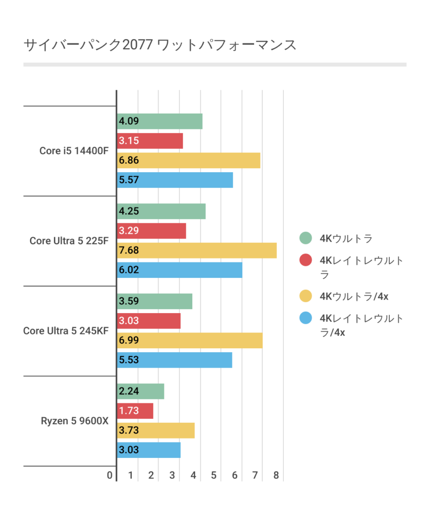 結果的にワットパフォーマンスはCore Ultra 5 225Fが一番優秀な結果となっています。