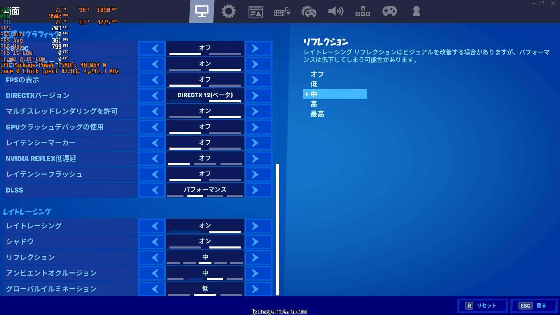 上記のように特に処理が重くなるフォートナイトの場面では、