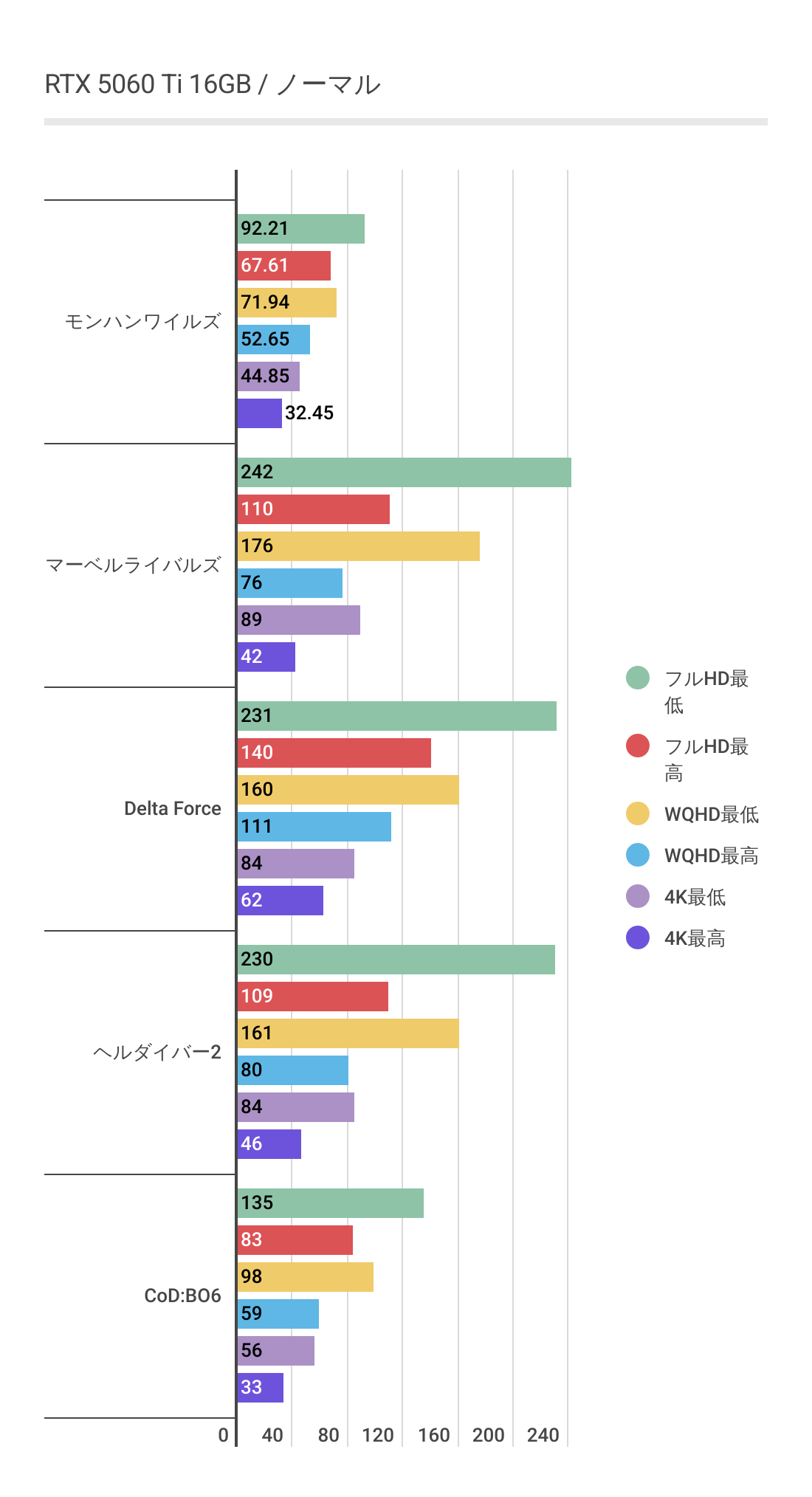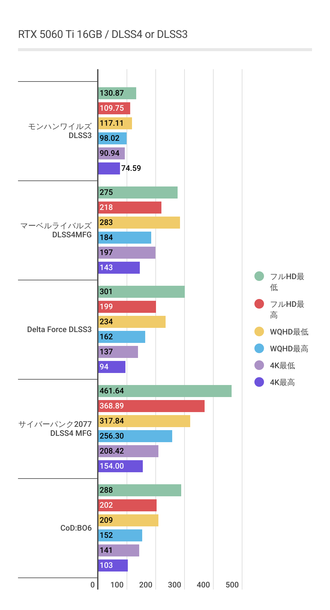 下記は実際にRTX 5060 Ti 16GBを利用し主要なゲームをベンチマークした結果です。ただしあくまで参考値としてご参照ください。
