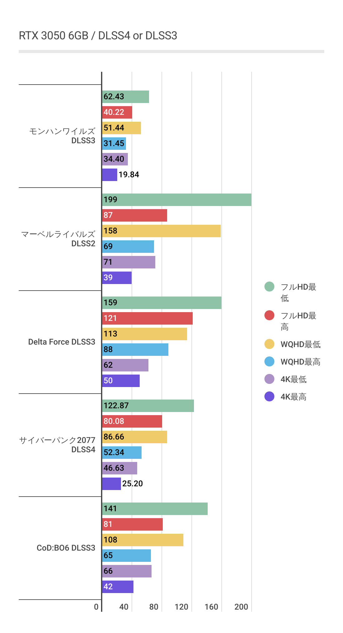 モンハンワイルズ DLSS3 | マーベルライバルズ DLSS2 | Delta Force DLSS3 | サイバーパンク2077 DLSS4 | CoD:BO6 DLSS3 | |