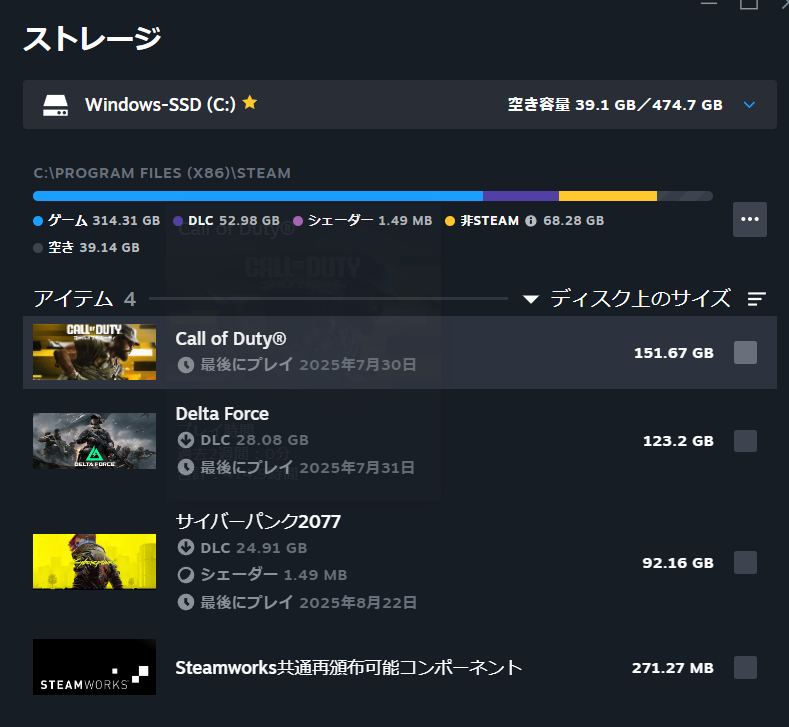 例えば上記は私が今回利用したゲームソフトの容量の一覧ですが、御覧のように最近では100GBクラスは当たり前で、中には200GBを超えることも。