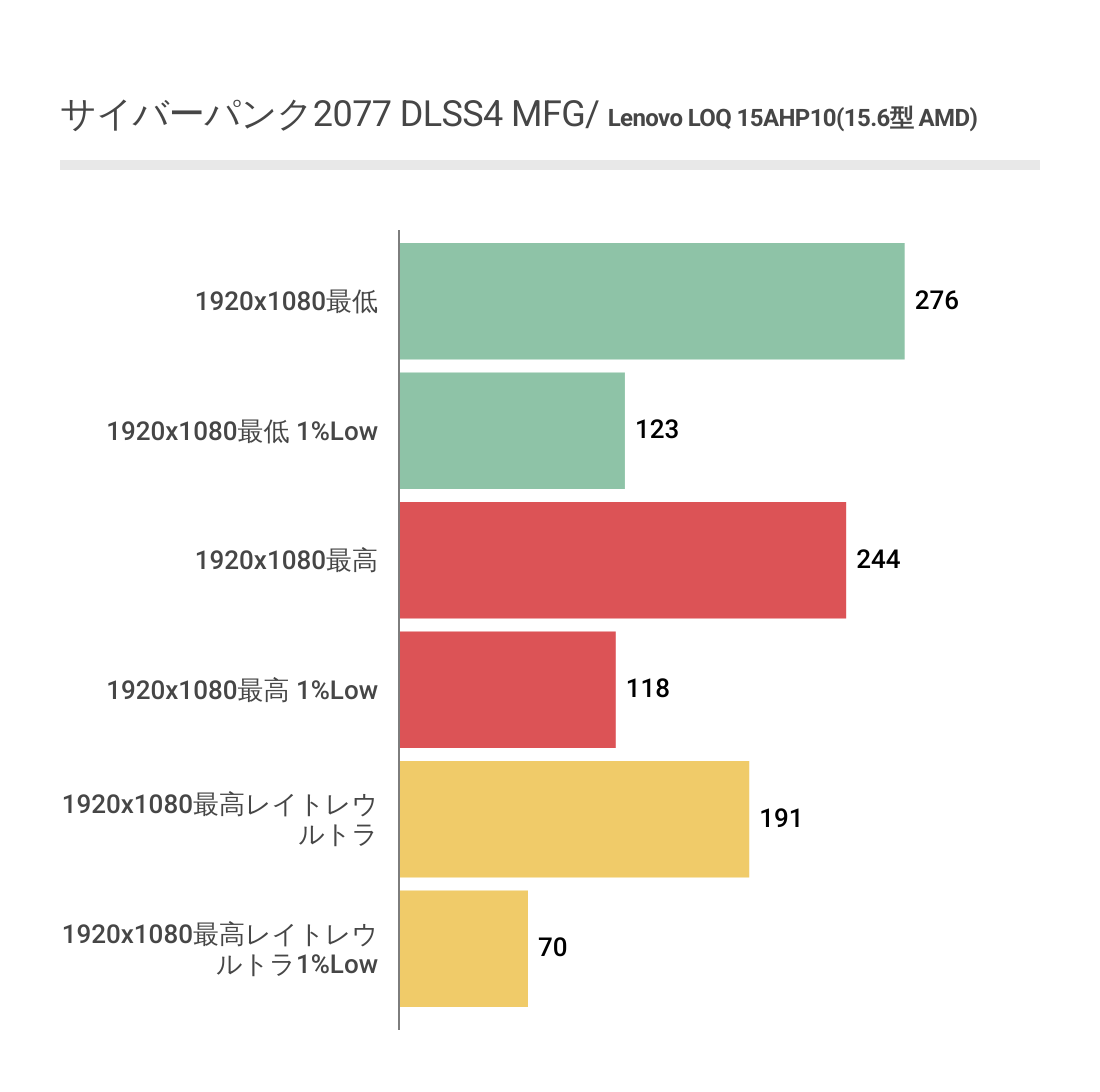 フレームレート | 276 | 123 | 244 | 118 | 191 | 70 |