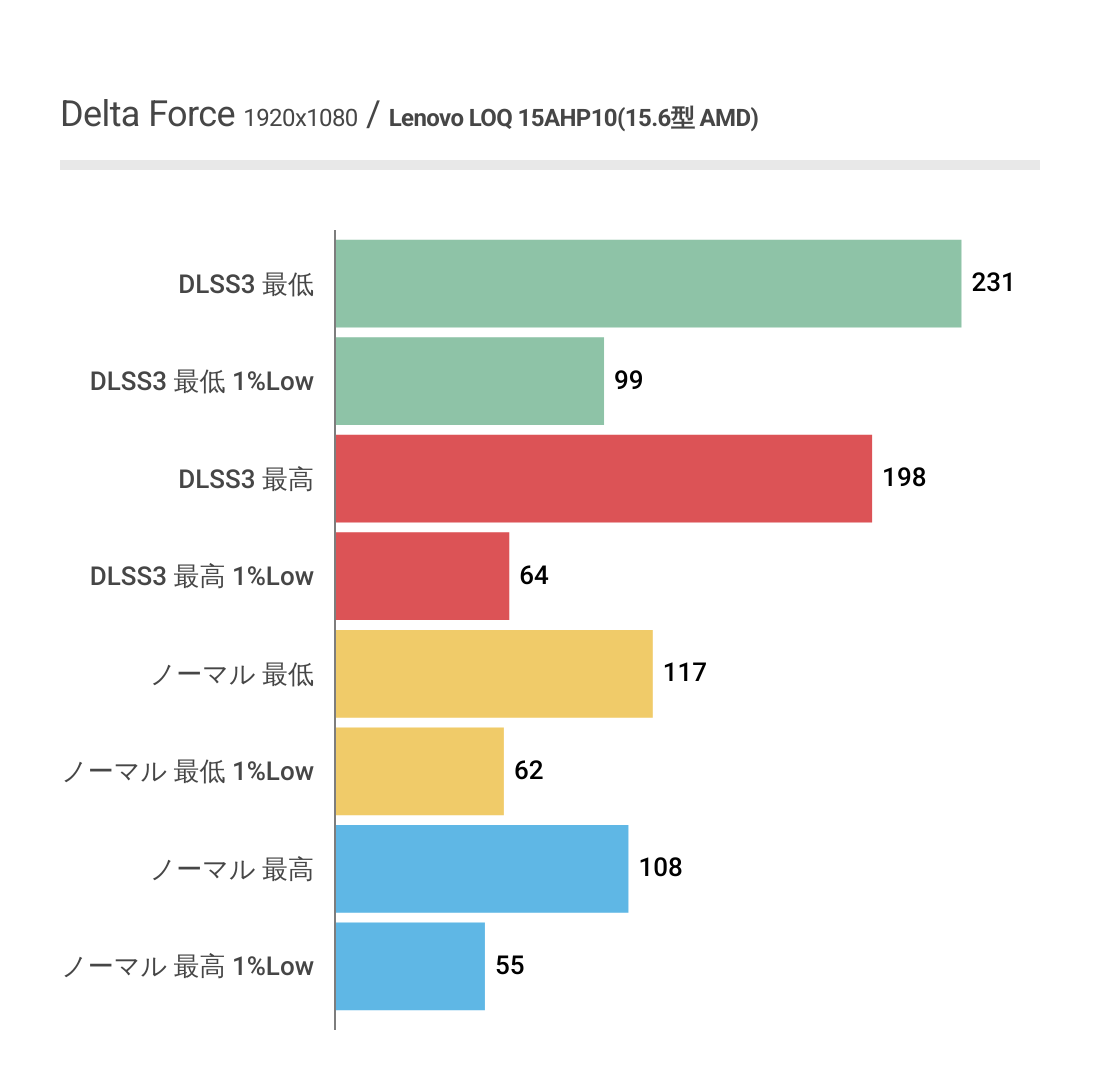 続いてはユーザー数も多く人気継続中のDeltaForceです。DLSSに対応していますので、利用して計測します。併せて不使用時の結果も掲載しました。