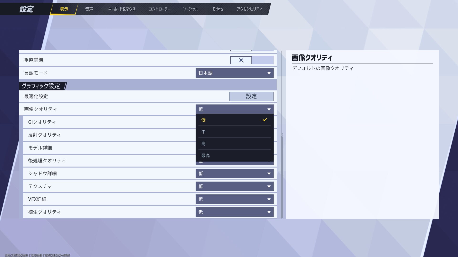 グラフィック設定は最近の中ではかなりシンプルになっており、細かく調整するというよりは大雑把にやっていく感じのよう。