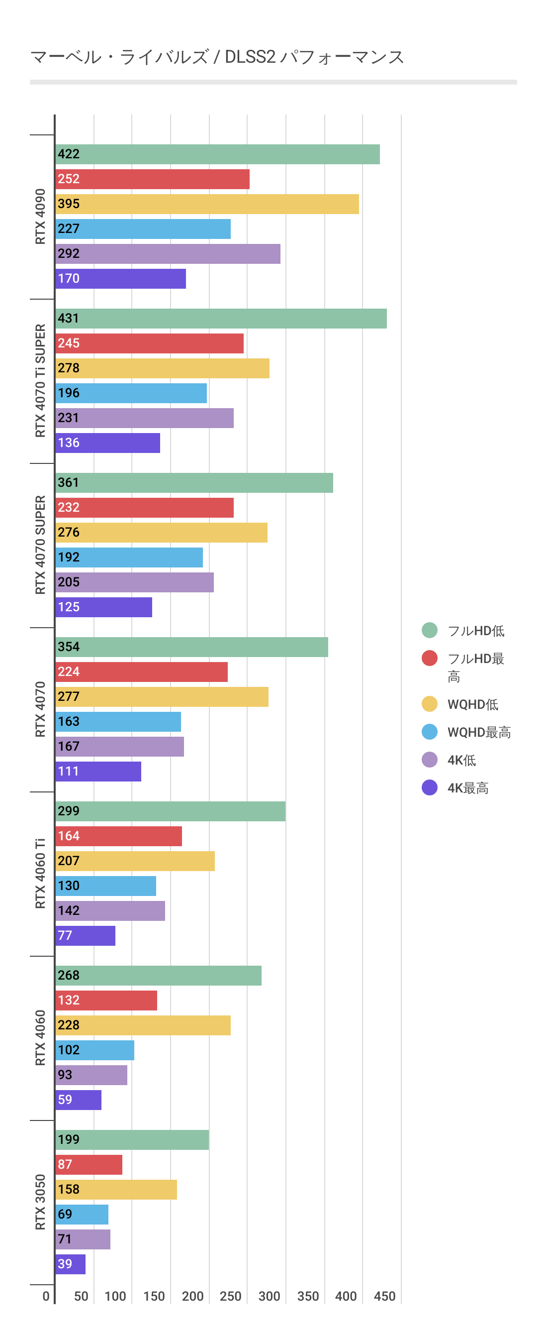 WQHDならRTX 4070 SUPER、4KならRTX 4090は必要になるため、アップスケーリングを利用したほうが良さそうです。