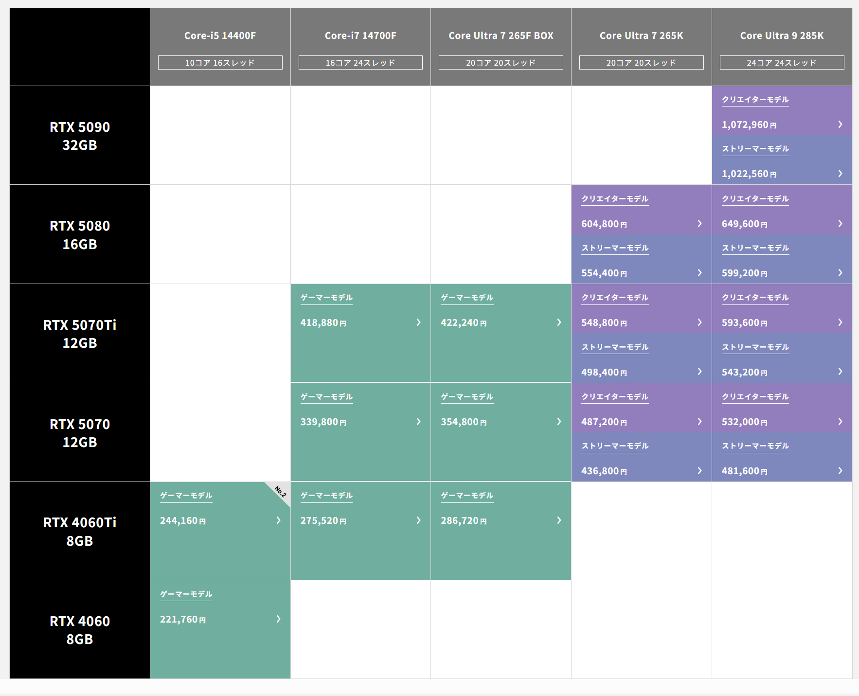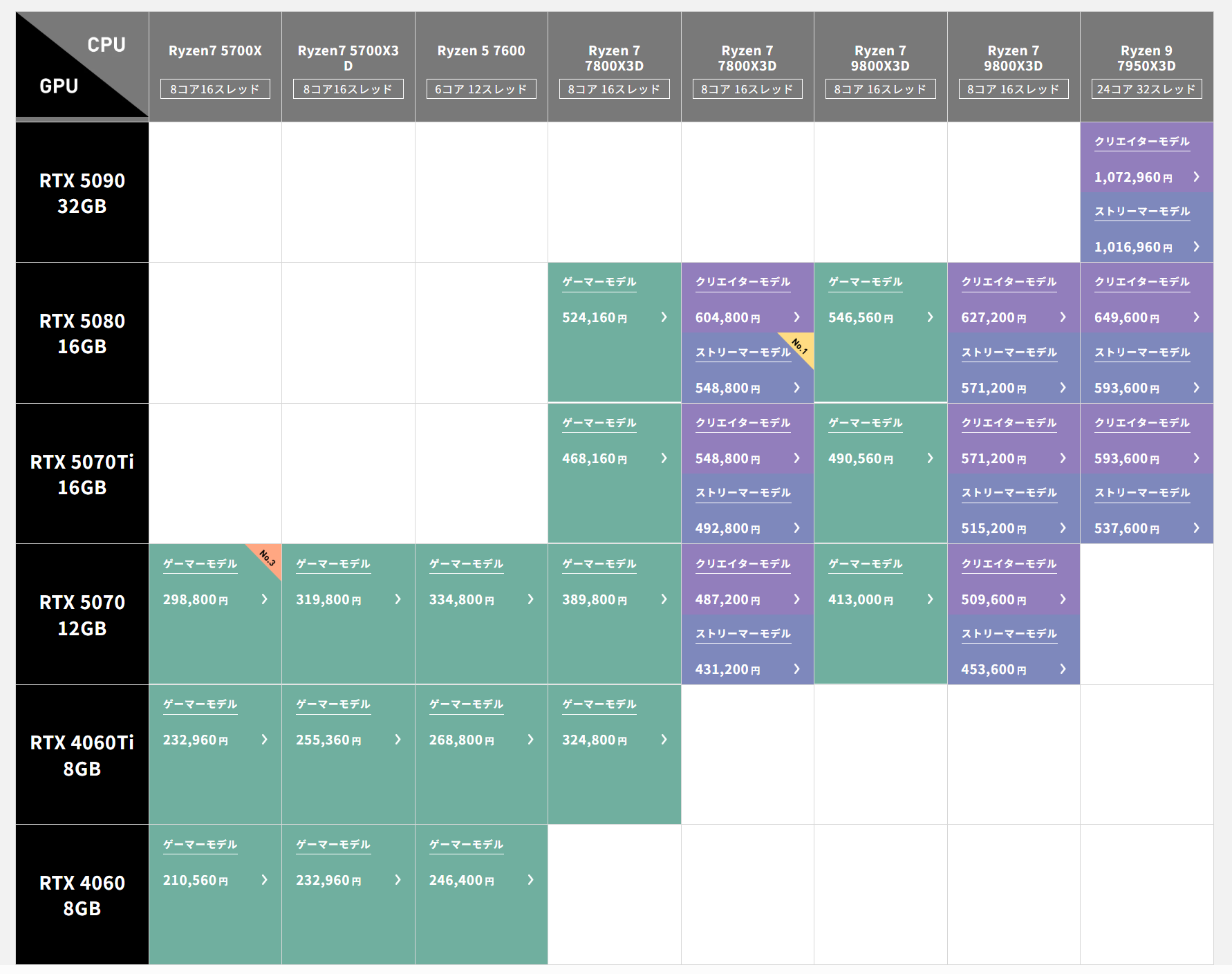 全て上記のラインナップに統一されており、ミドル~ハイクラスをゲーミングPC、
