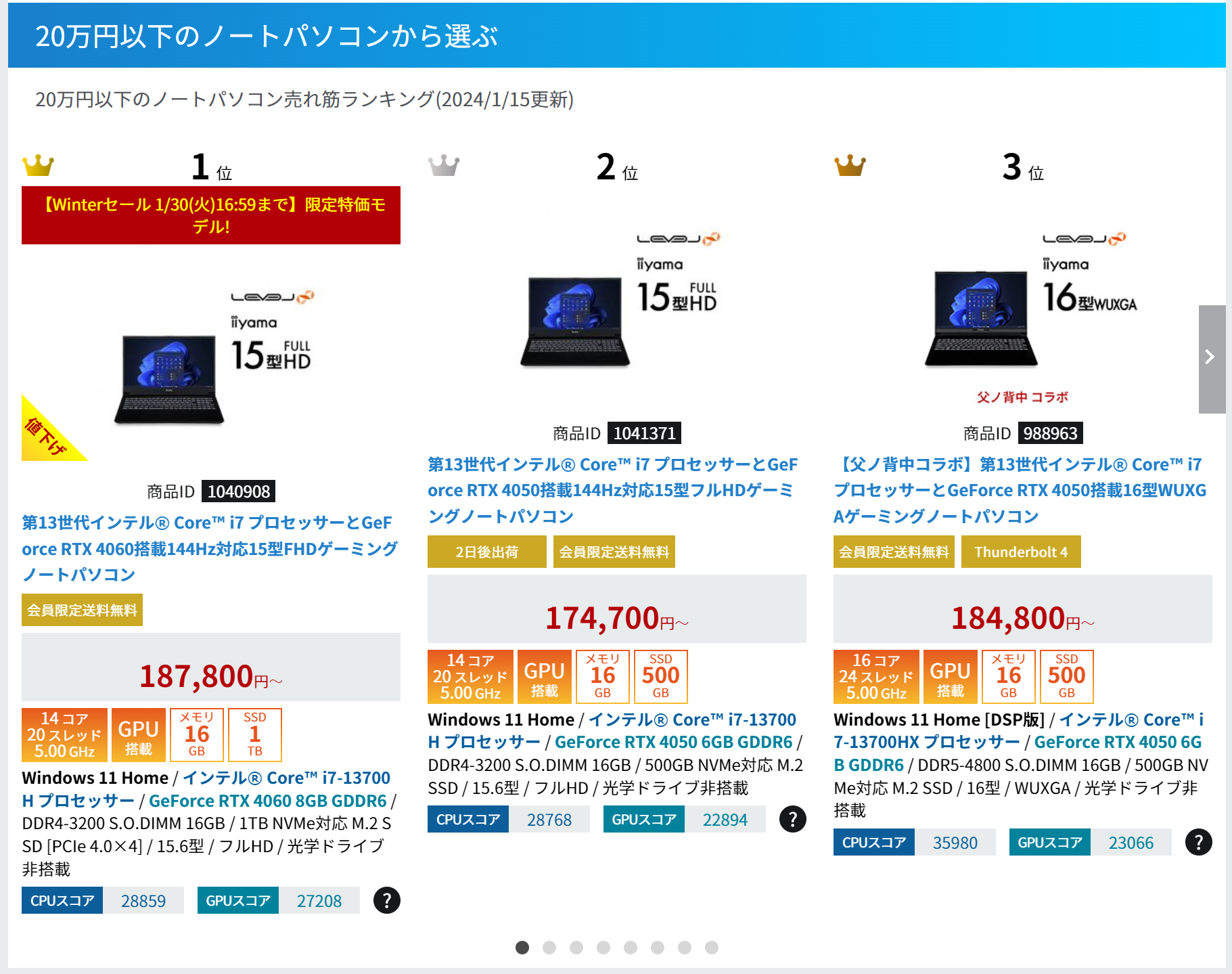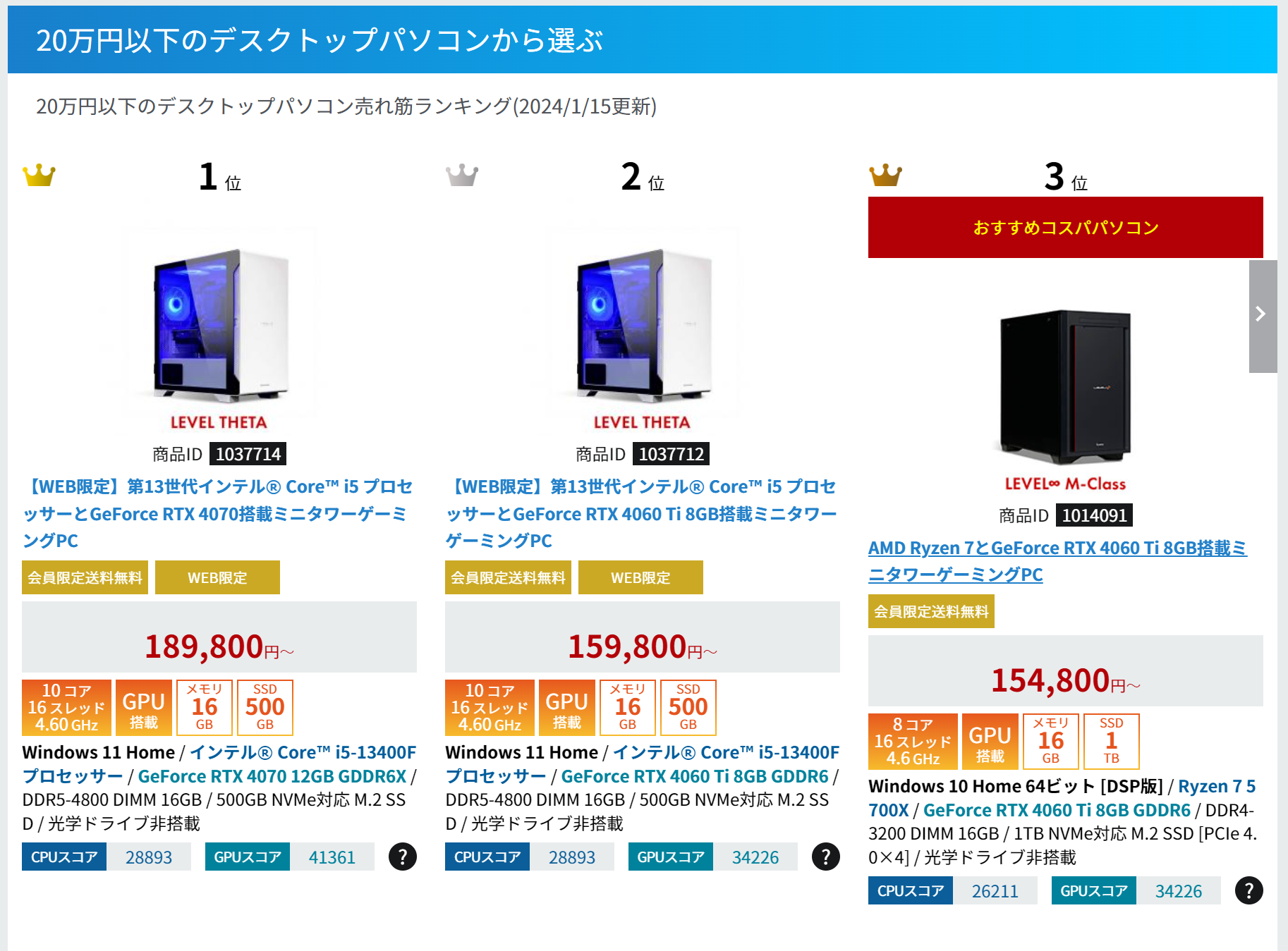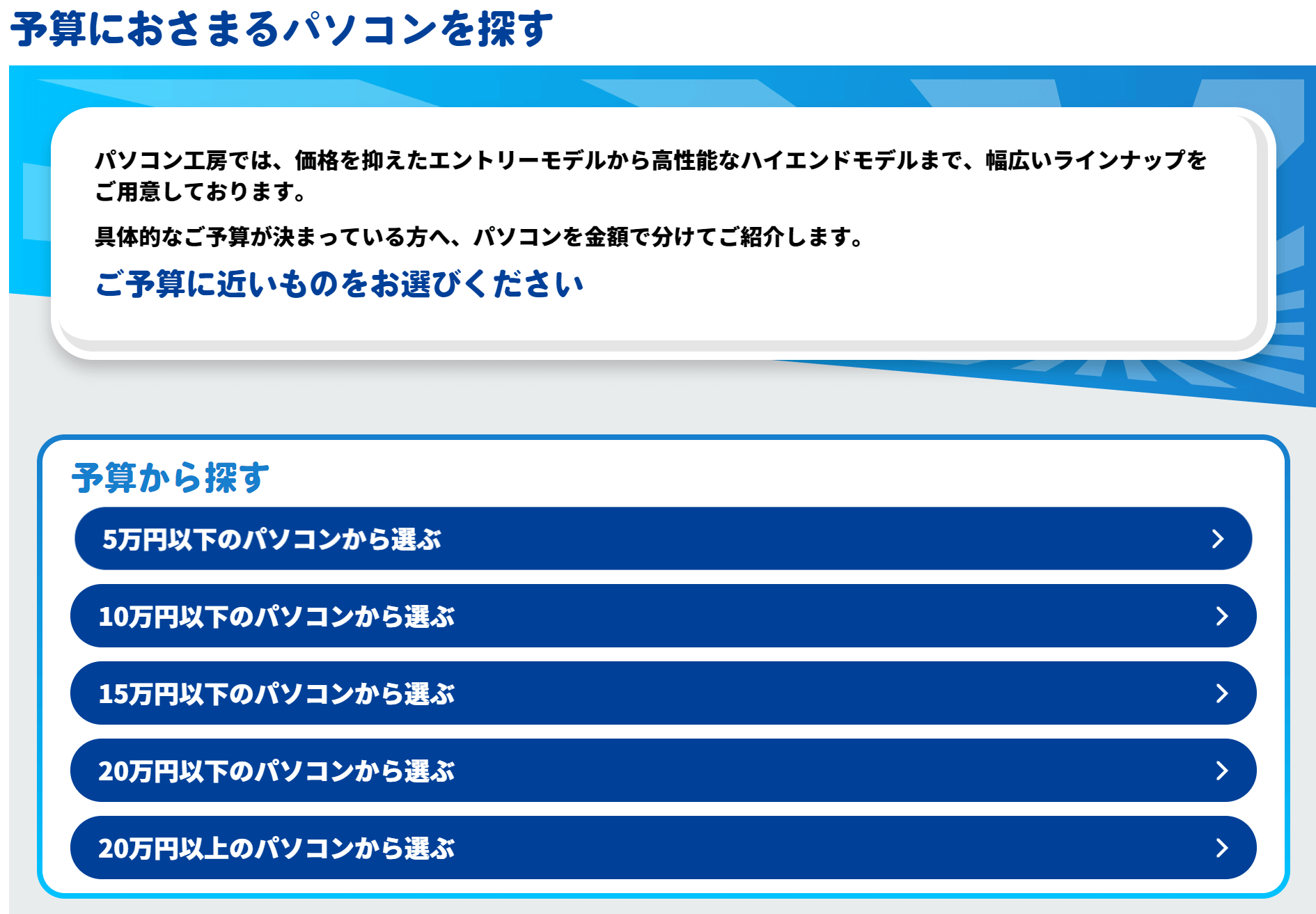 その予算で人気のBTOパソコン、おすすめのBTOパソコンを一目で確認できます。