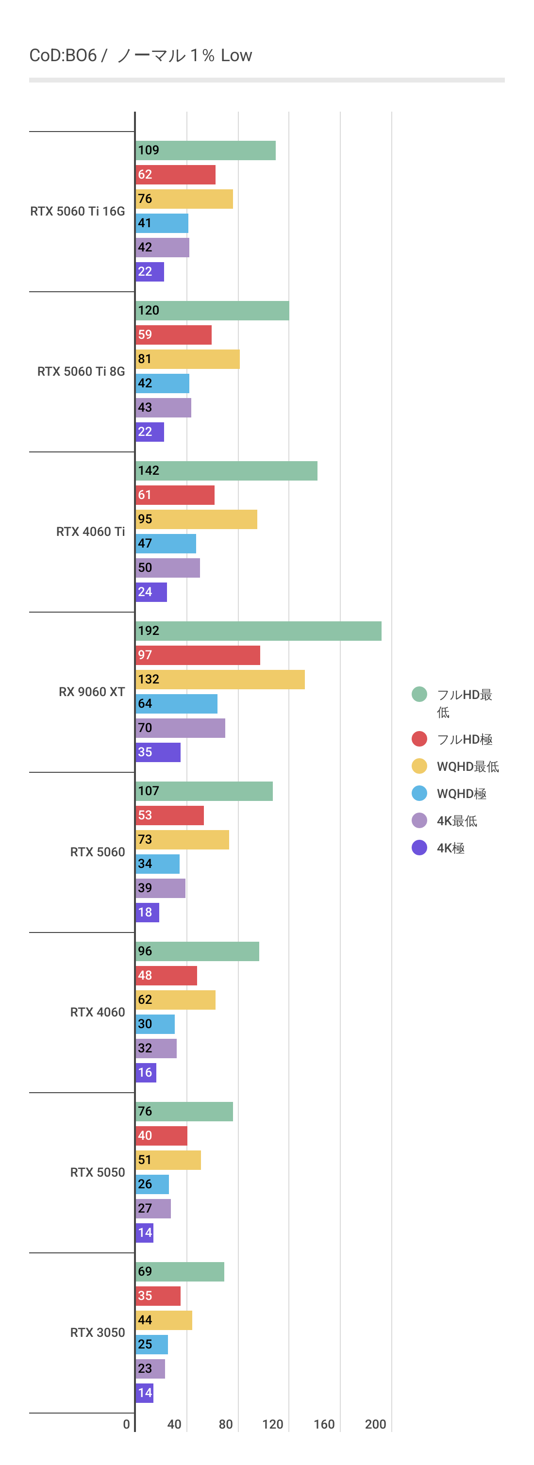 数値的にはRTX 3050のほうがRTX 5050より低いですが、そもそも平均フレームレートがそんなにでていませんので、RTX 5050のほうが安定性面でも良いです。