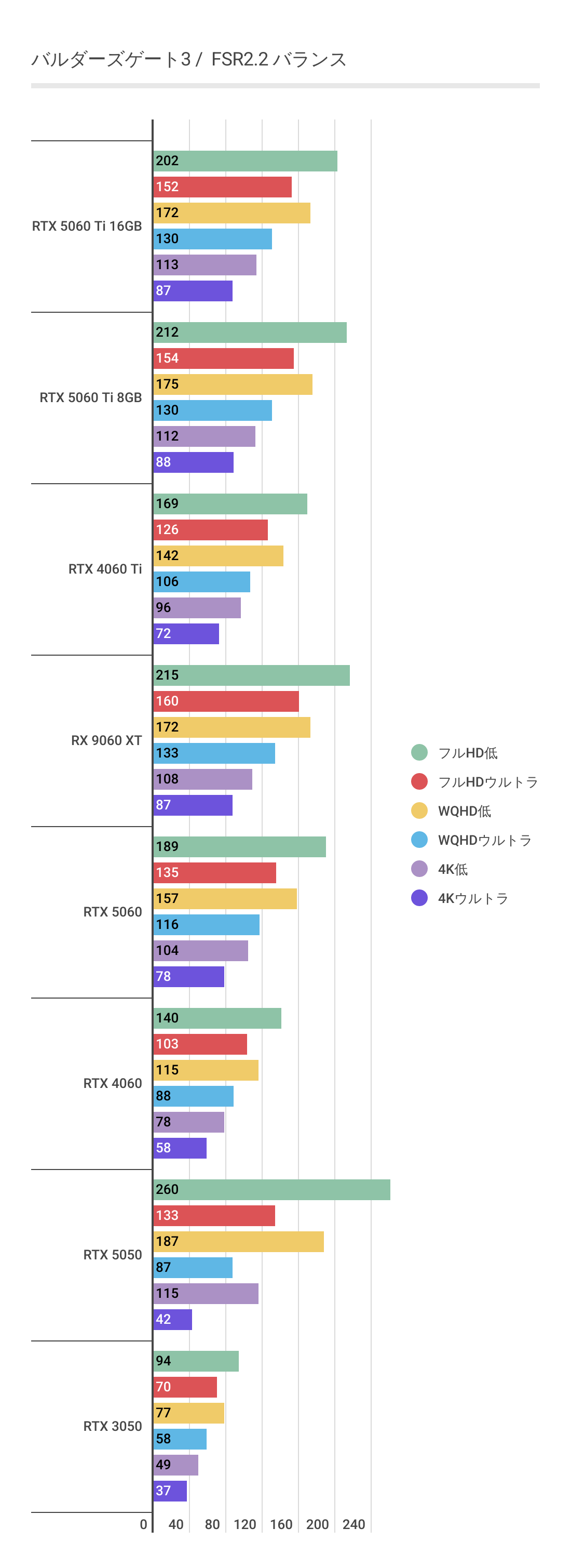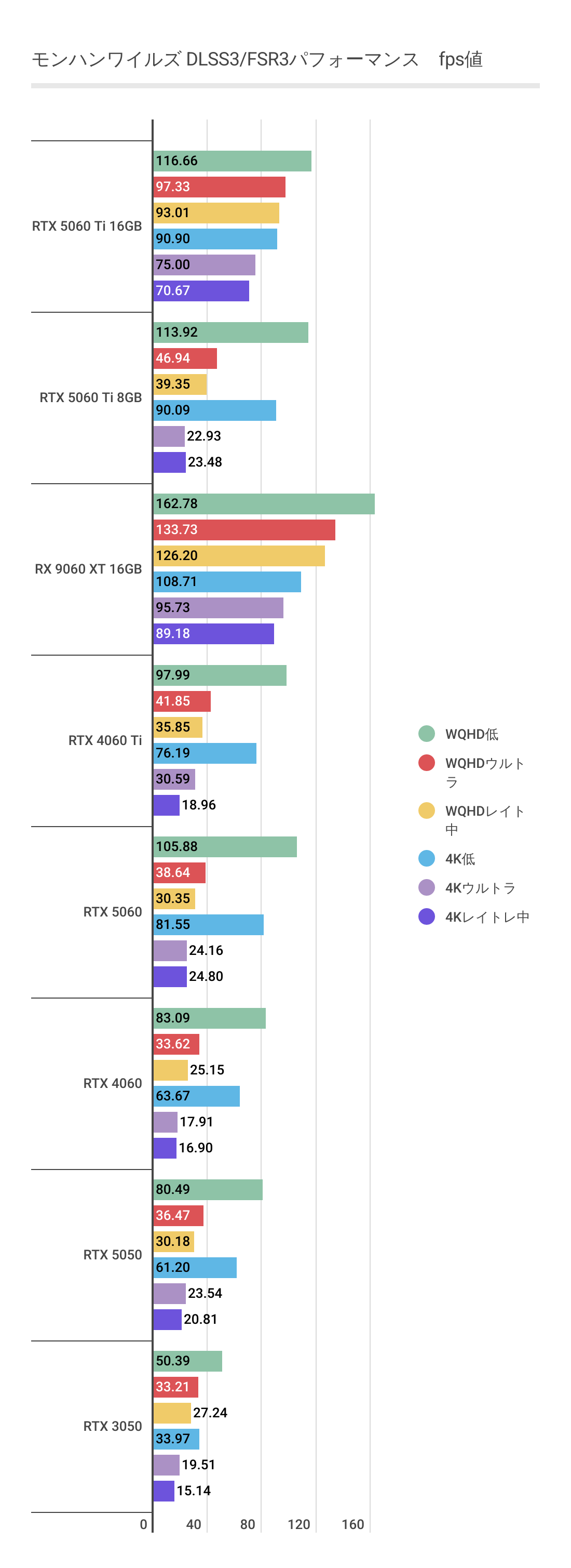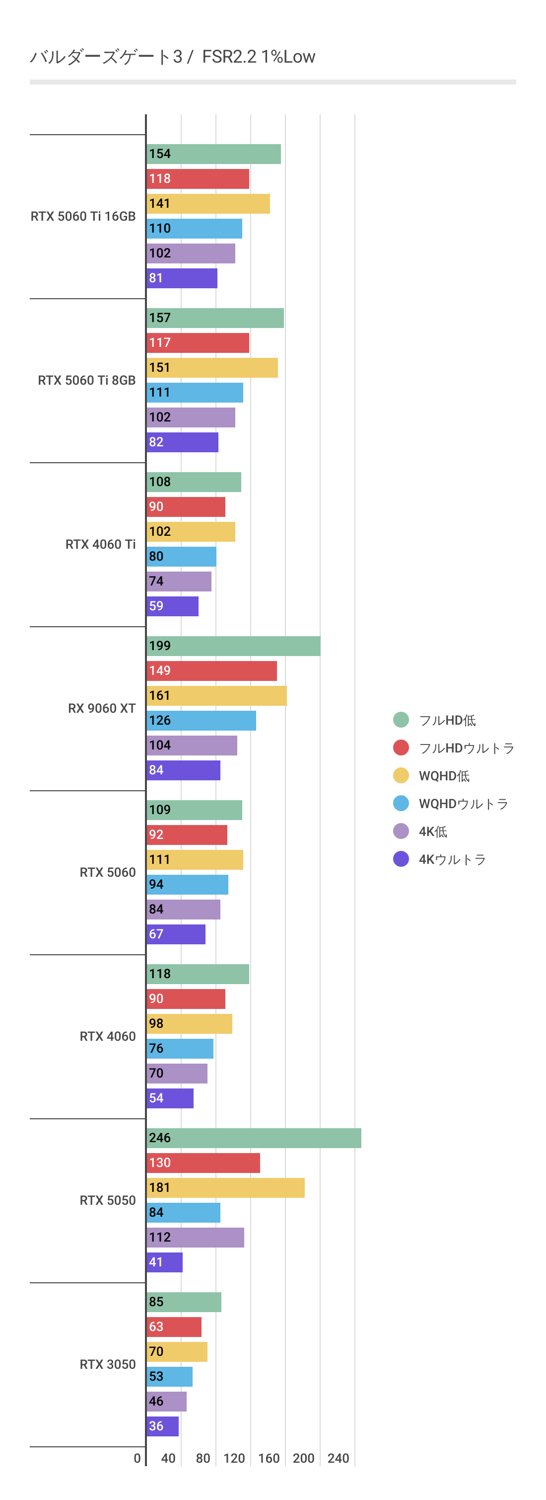 なのでフレーム生成を使えるRTX 5050がRTX 3050よりかなりフレームレートが出ています。低画質だけ見ればWQHDでも十分遊べそうなフレームレートが出ています。