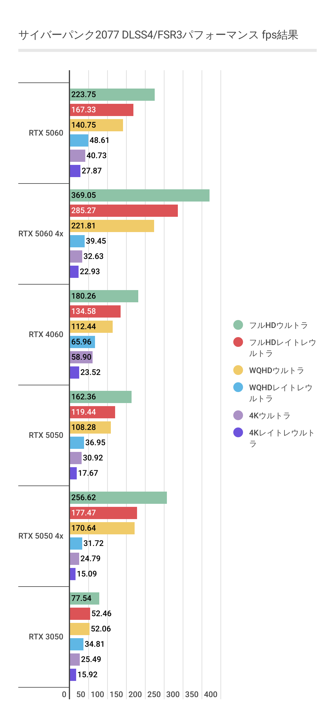 フレーム生成を使えるDLSS3はRTX 4000以降の対応なので、RTX 3050は使えません。なのでこの結果はRTX 3050はDLSS2ということになります。