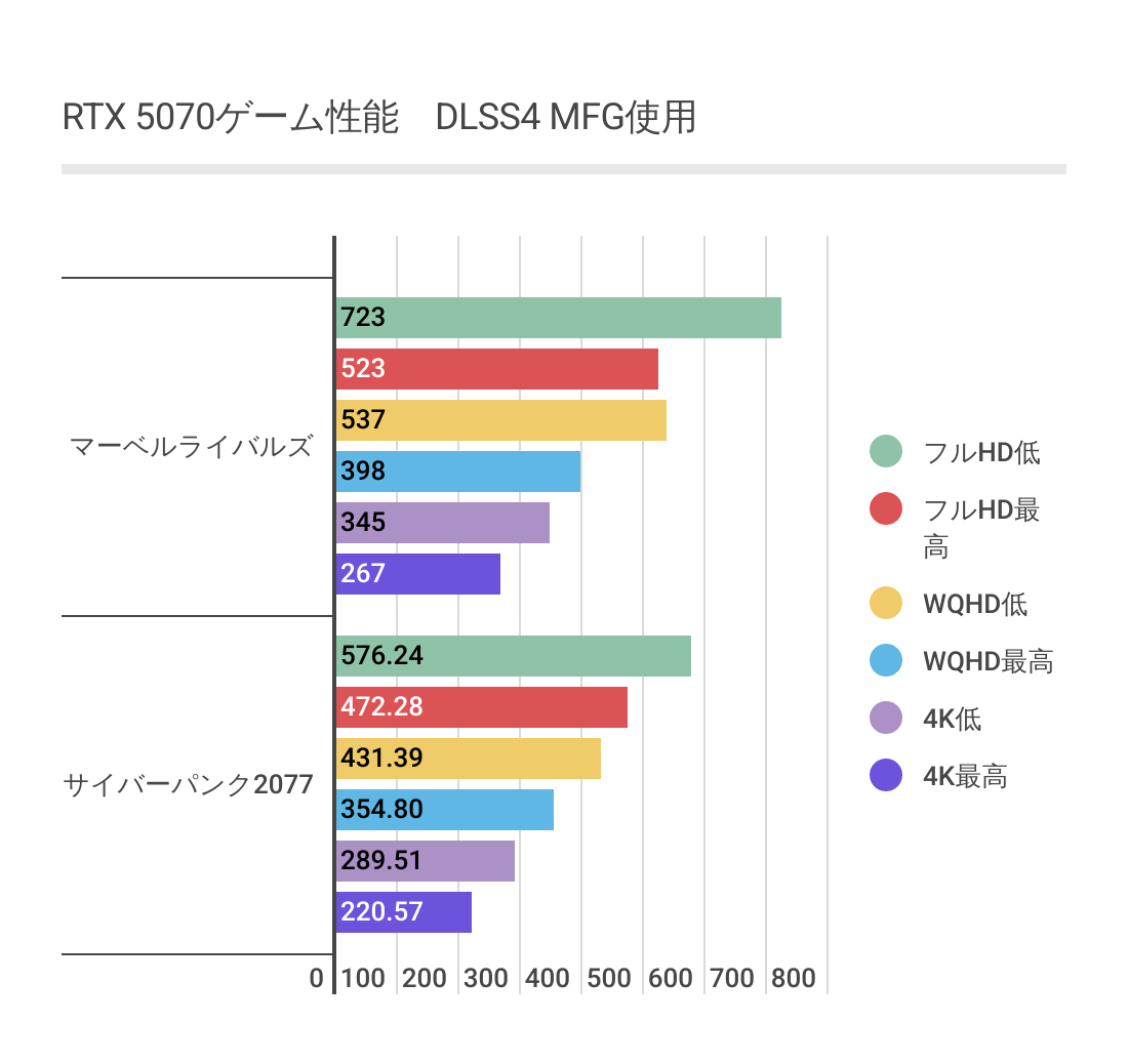RTX 5070におけるDLSSマルチフレーム生成利用時の各ゲームのフレームレート