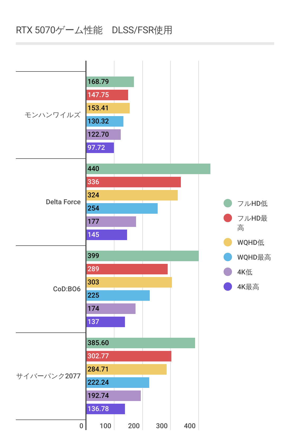 RTX 5070におけるDLSS利用時の各ゲームのフレームレート
