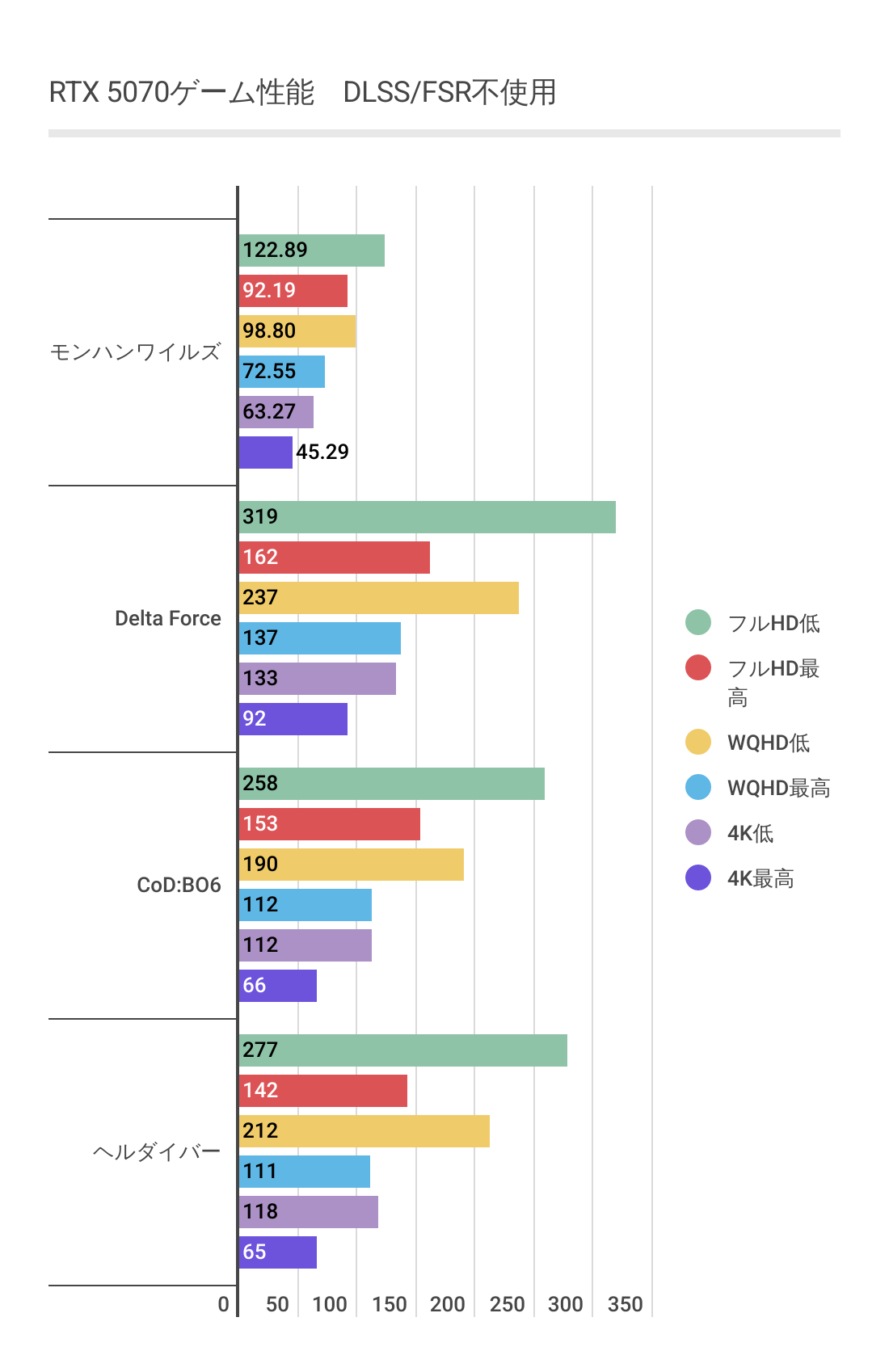 RTX 5070におけるDLSS不使用時の各ゲームのフレームレート
