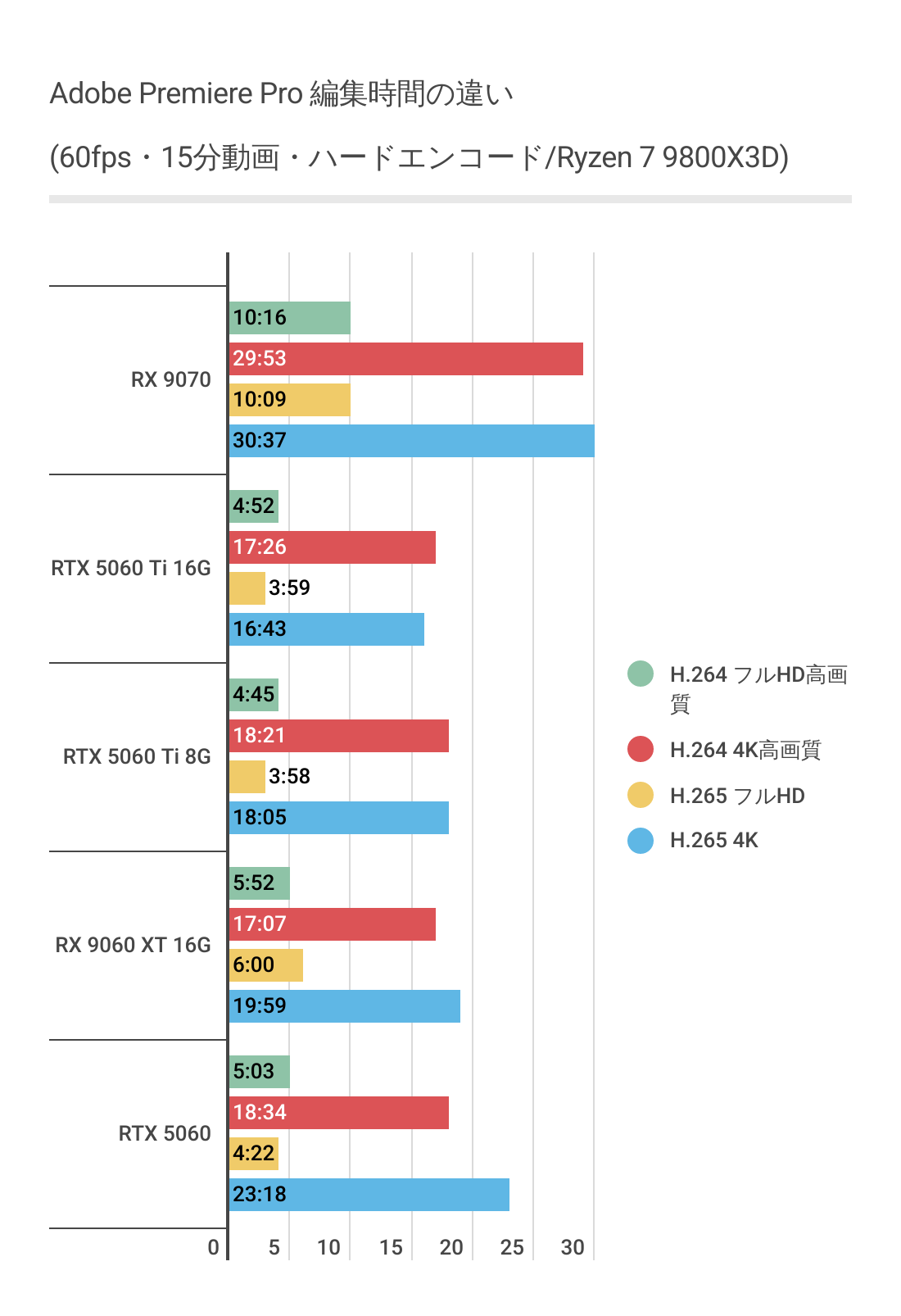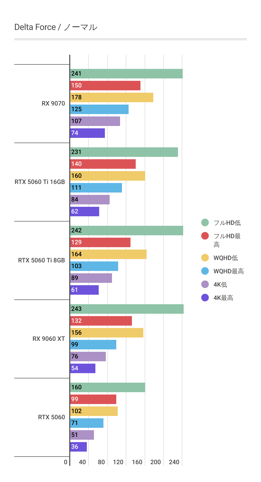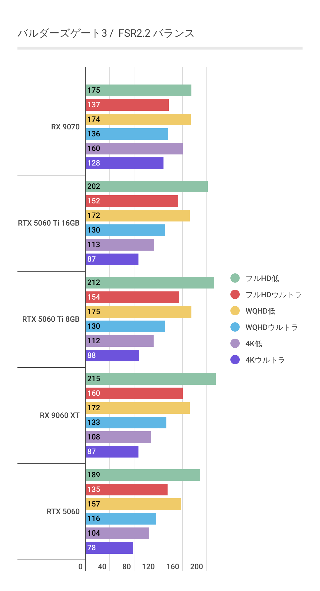 一目瞭然。RX 9060 XTのフレームレートが大きく伸びており、RTX 5060 Ti 16GBを圧倒しています。