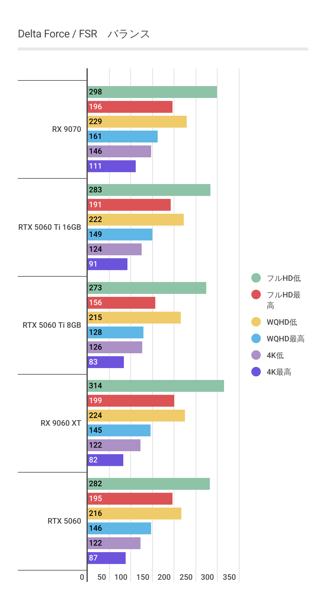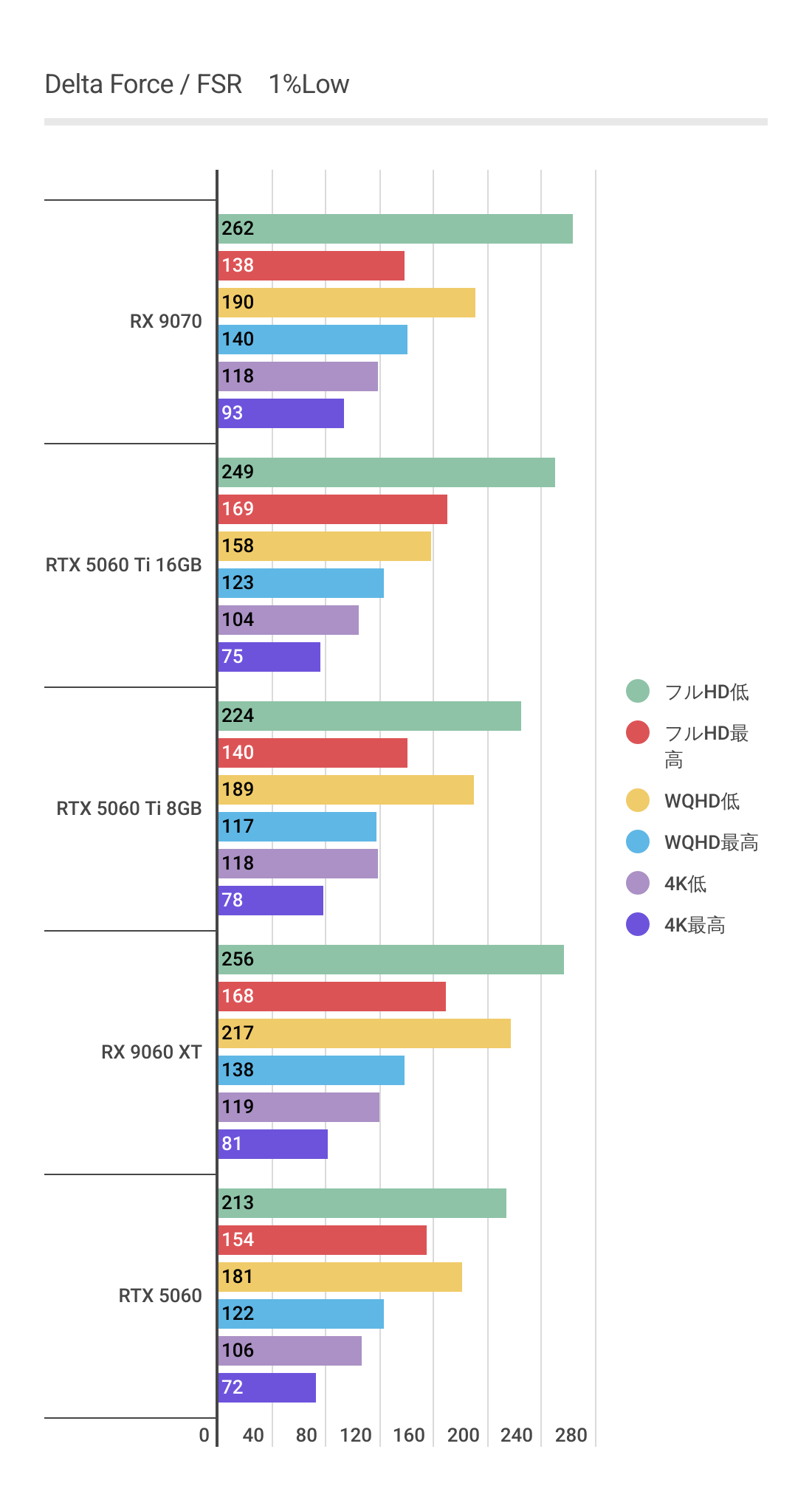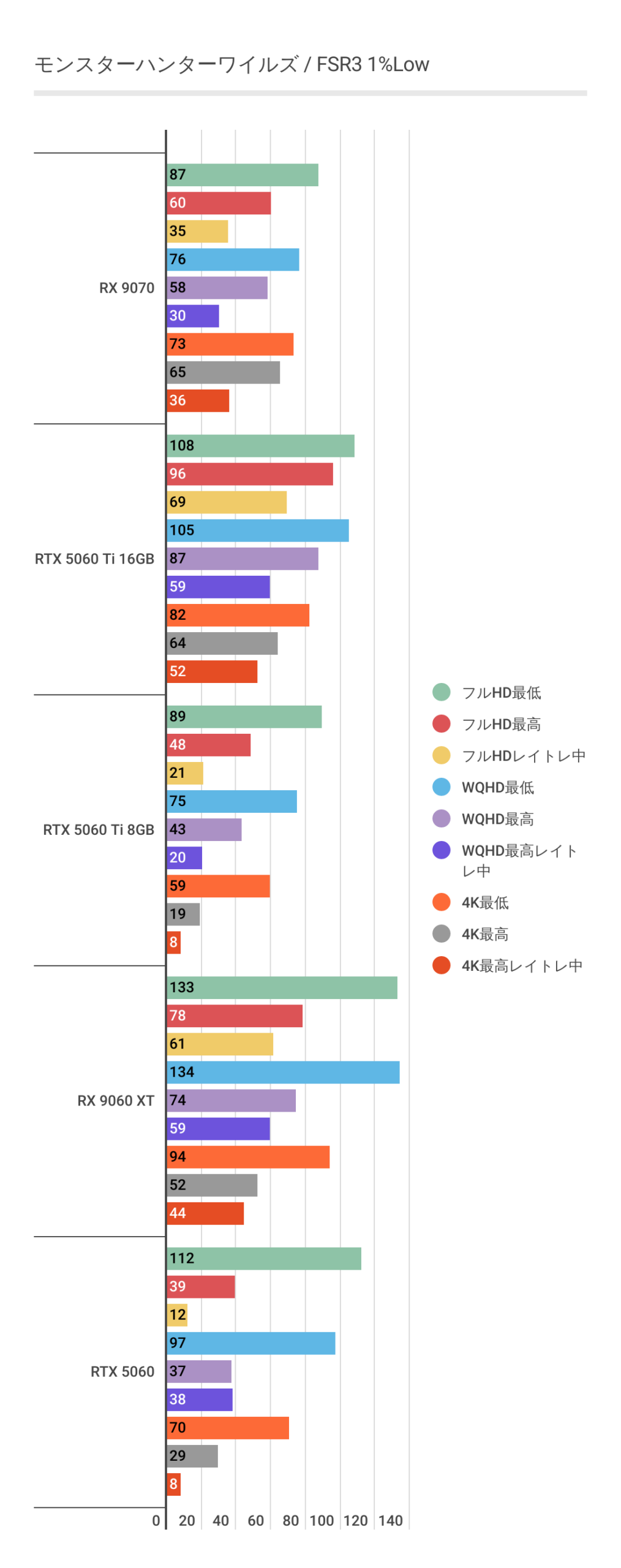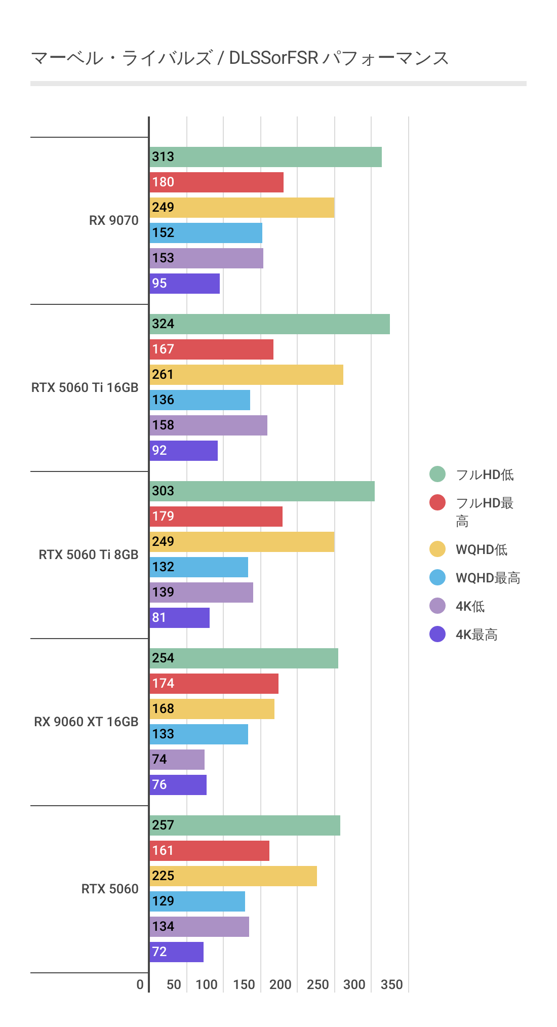 またRTX 5060 Ti 8GBを見るとわかるように高画質領域ではグラボメモリ不足でパフォーマンスが発揮できていません。RX 9060 XT 16GBは高画質領域でも安定しています。