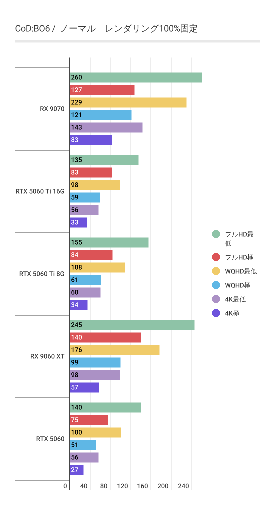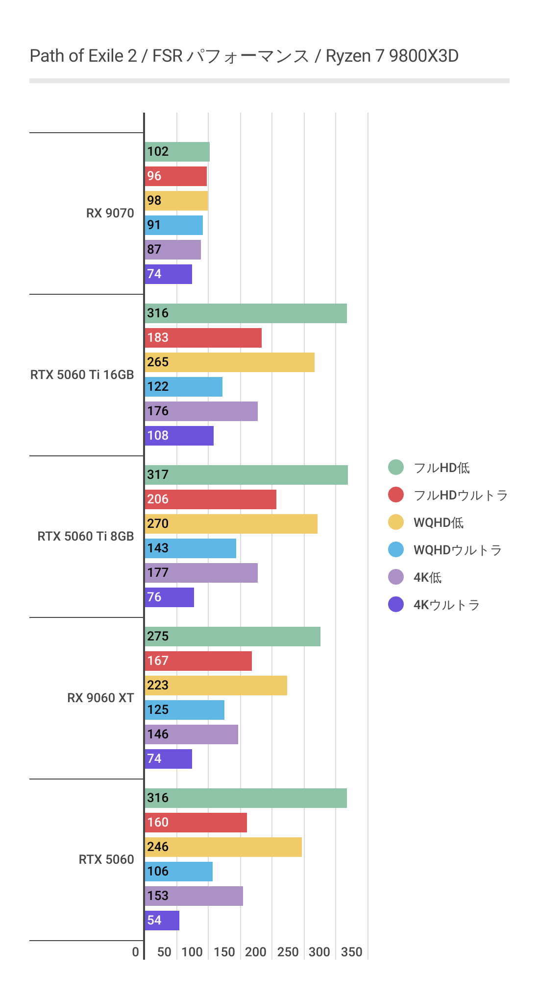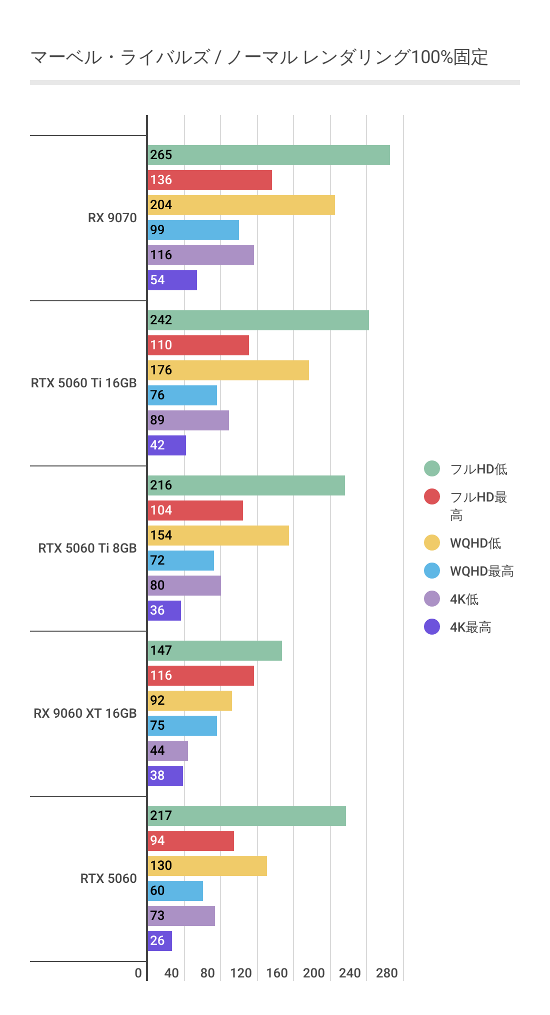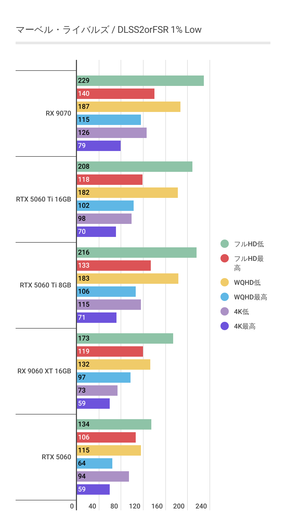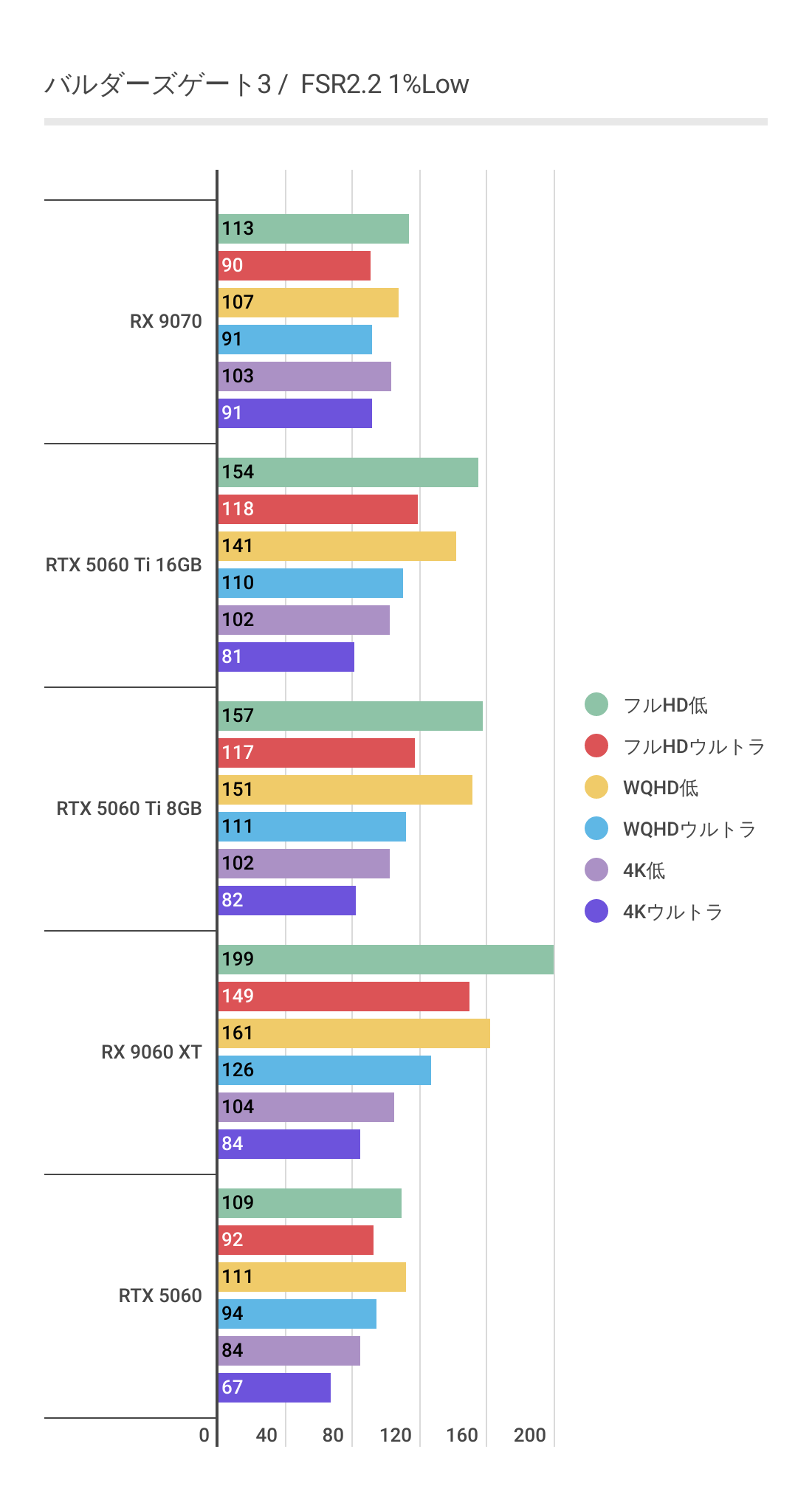 またRTX 5060 Ti 8GBを見るとわかるように高画質領域ではグラボメモリ不足でパフォーマンスが発揮できていません。RX 9060 XT 16GBは高画質領域でも安定しています。