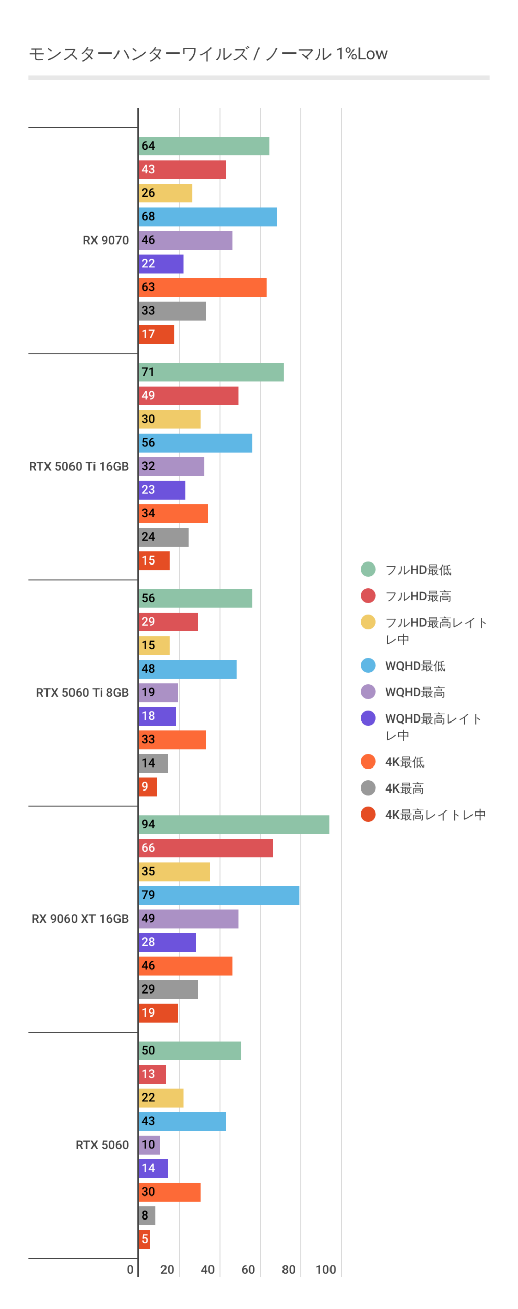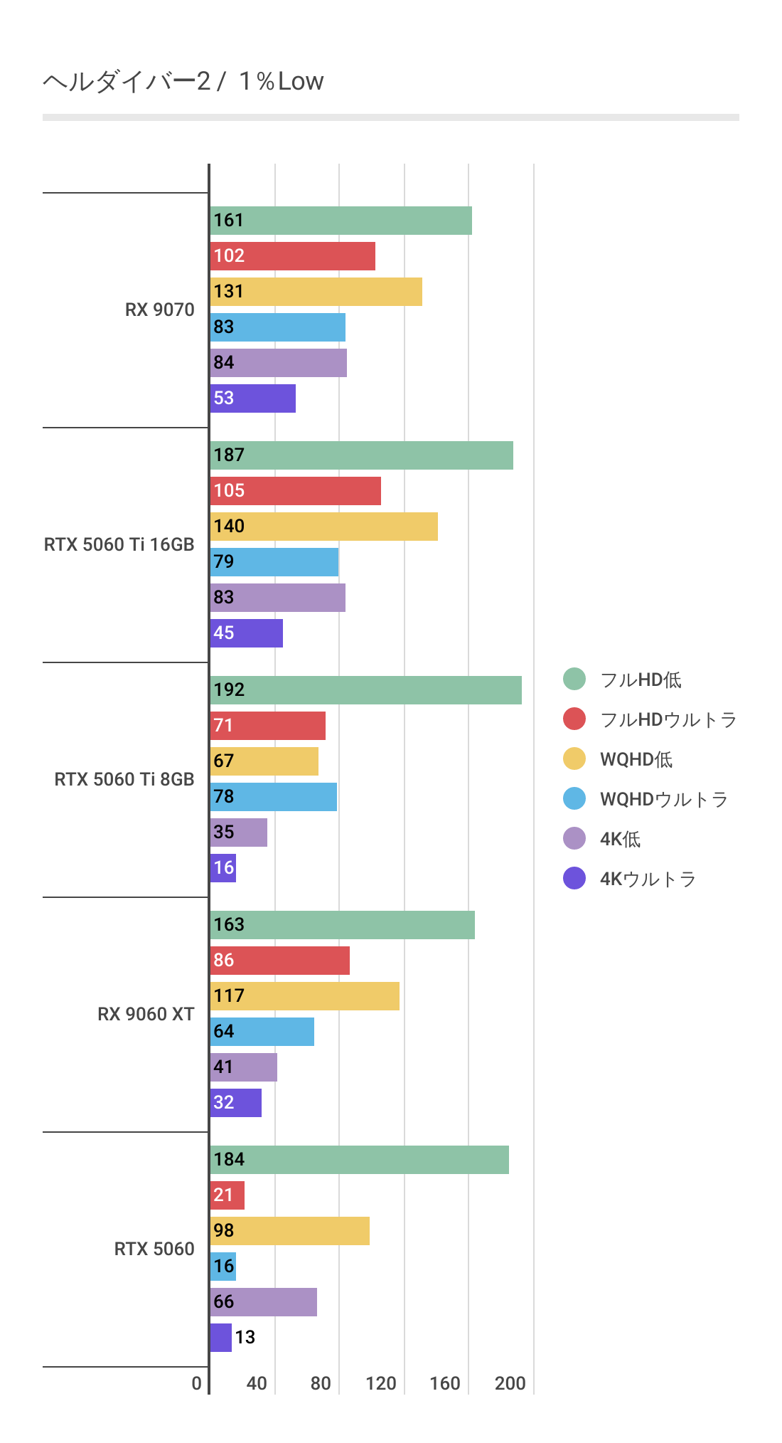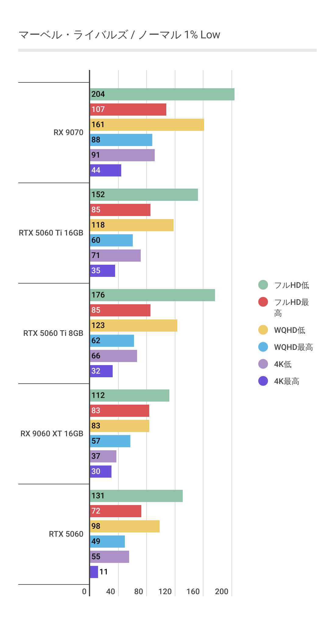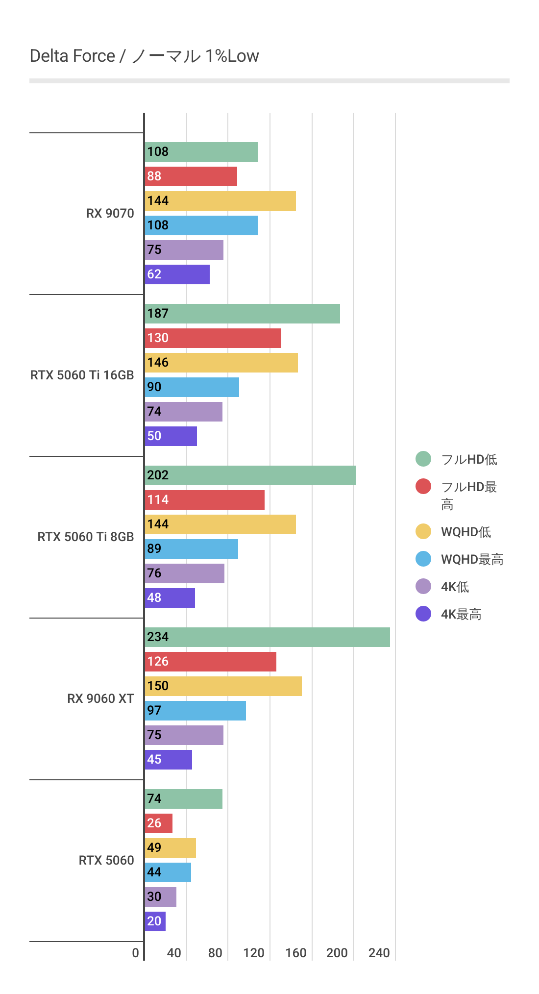またRTX 5060 Ti 8GBを見るとわかるように高画質領域ではグラボメモリ不足でパフォーマンスが発揮できていません。RX 9060 XT 16GBは高画質領域でも安定しています。