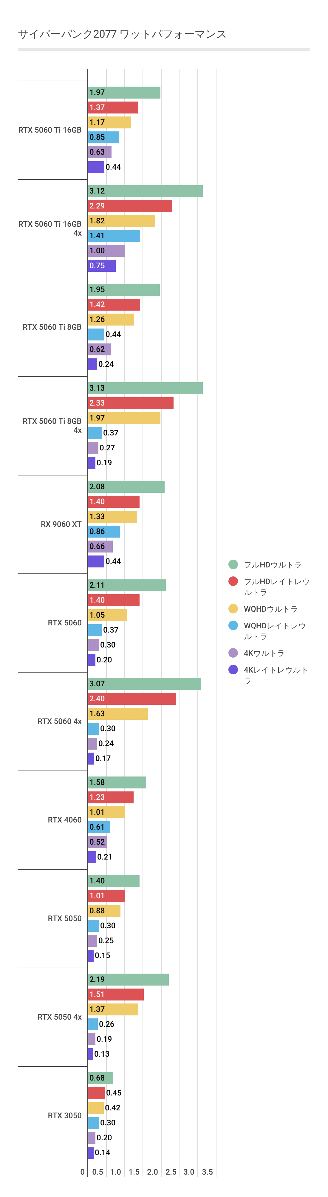 ただこのゲームのDLSS3とFSR3のフレームレート差が大きすぎるのもあり、消費電力が高いRX 9060 XTですが、ワットパフォーマンスではRTX 5060 Ti系よりも圧倒的に良い結果となっています。