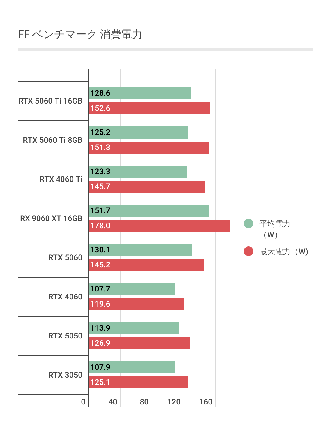 消費電力はやはりRX 9060 XTのほうがRTX 5060 Ti系より圧倒的に高く、平均は20Wくらい最大では30Wくらいは違います。