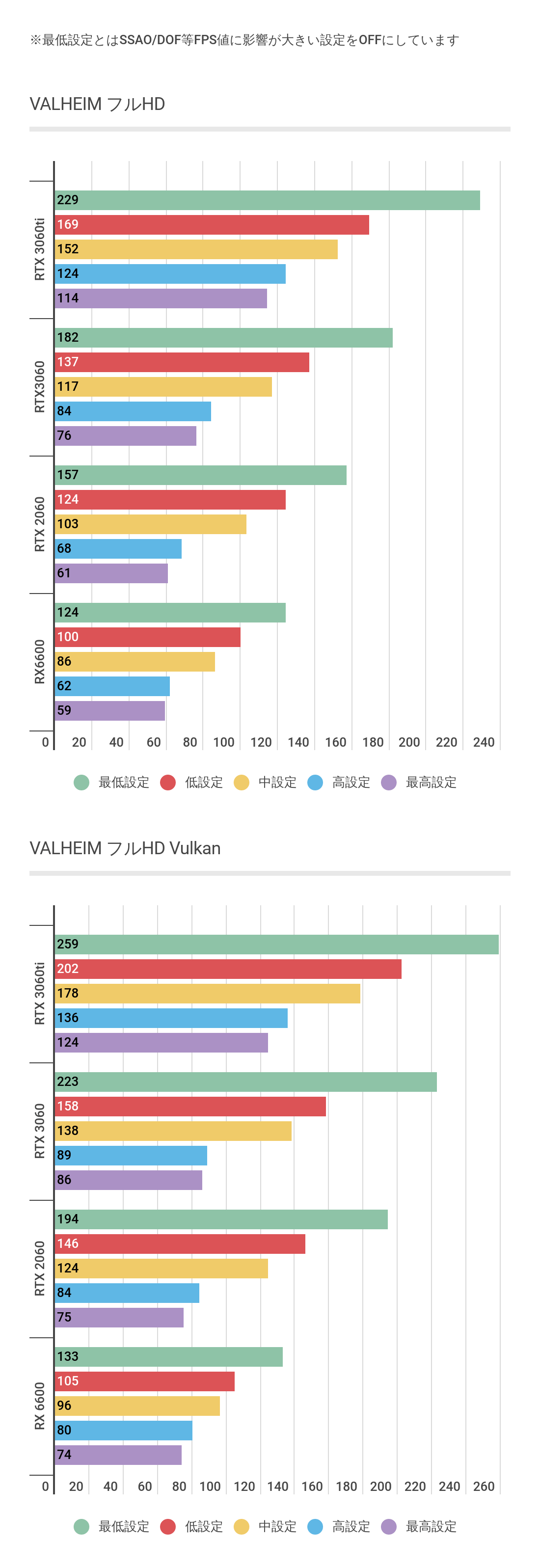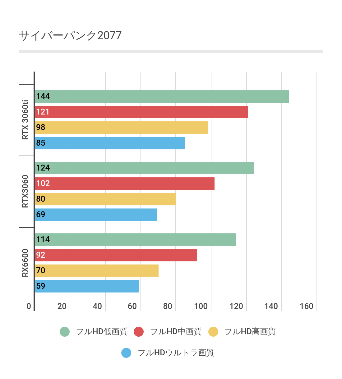 RTX3060に対して最低画質では約60fps(46.8%)、最高設定で約16fps(28.9%)ほど低く、