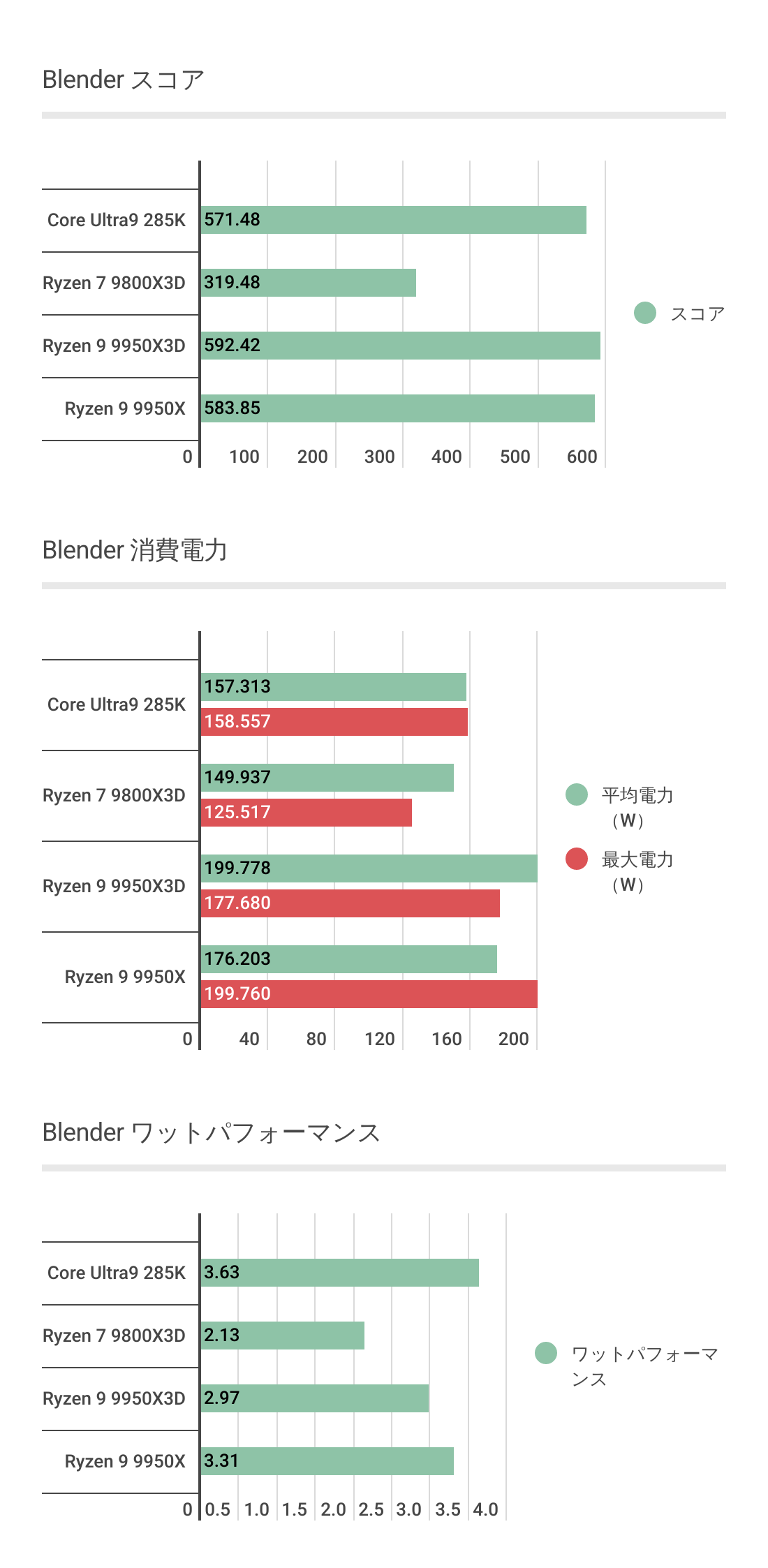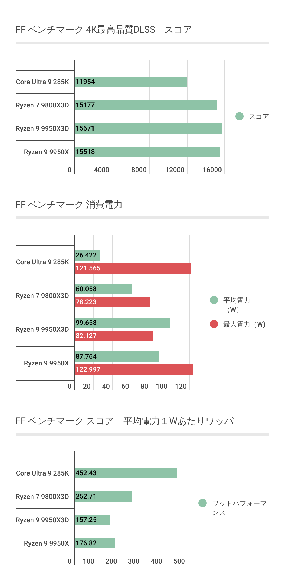 Ryzen 9 9950X3DはRyzen 7 9800X3DやCore Ultra 9 285Kよりは高いものの、Ryzen 9 9950Xには負ける結果に。