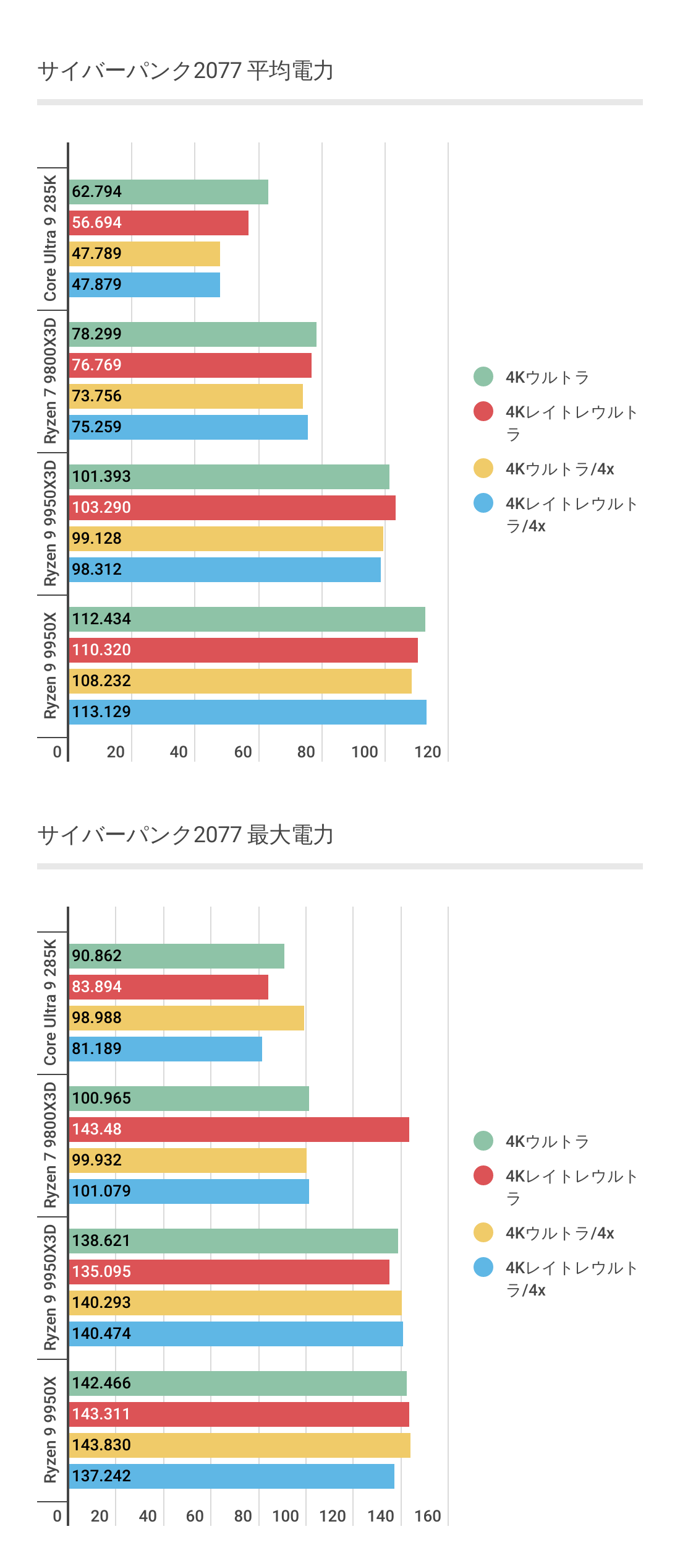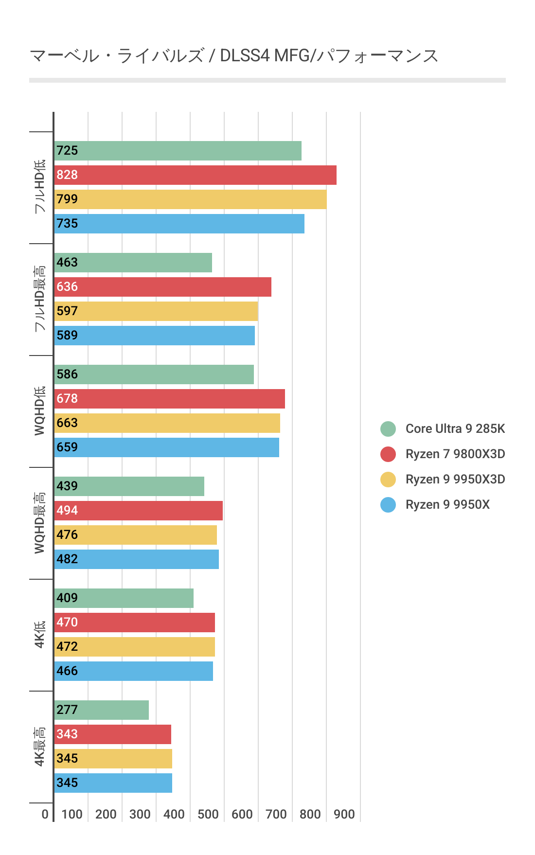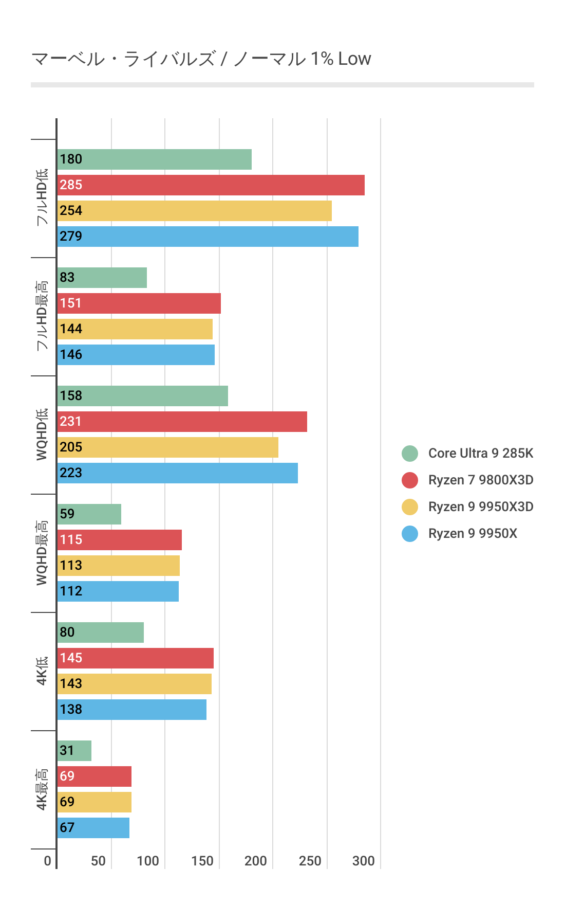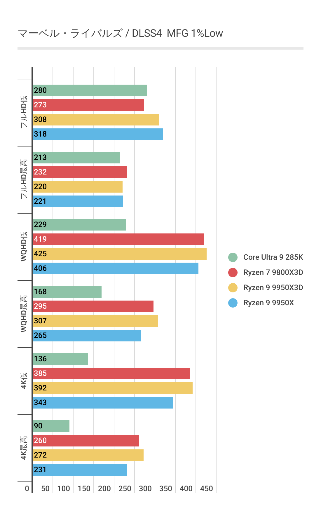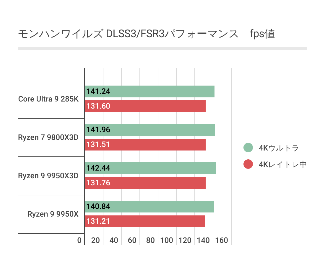 ただCore Ultra 9 285Kには低解像度では優っていますが、4Kになると微差ですが負ける結果。やはり最強とはなりませんでした。