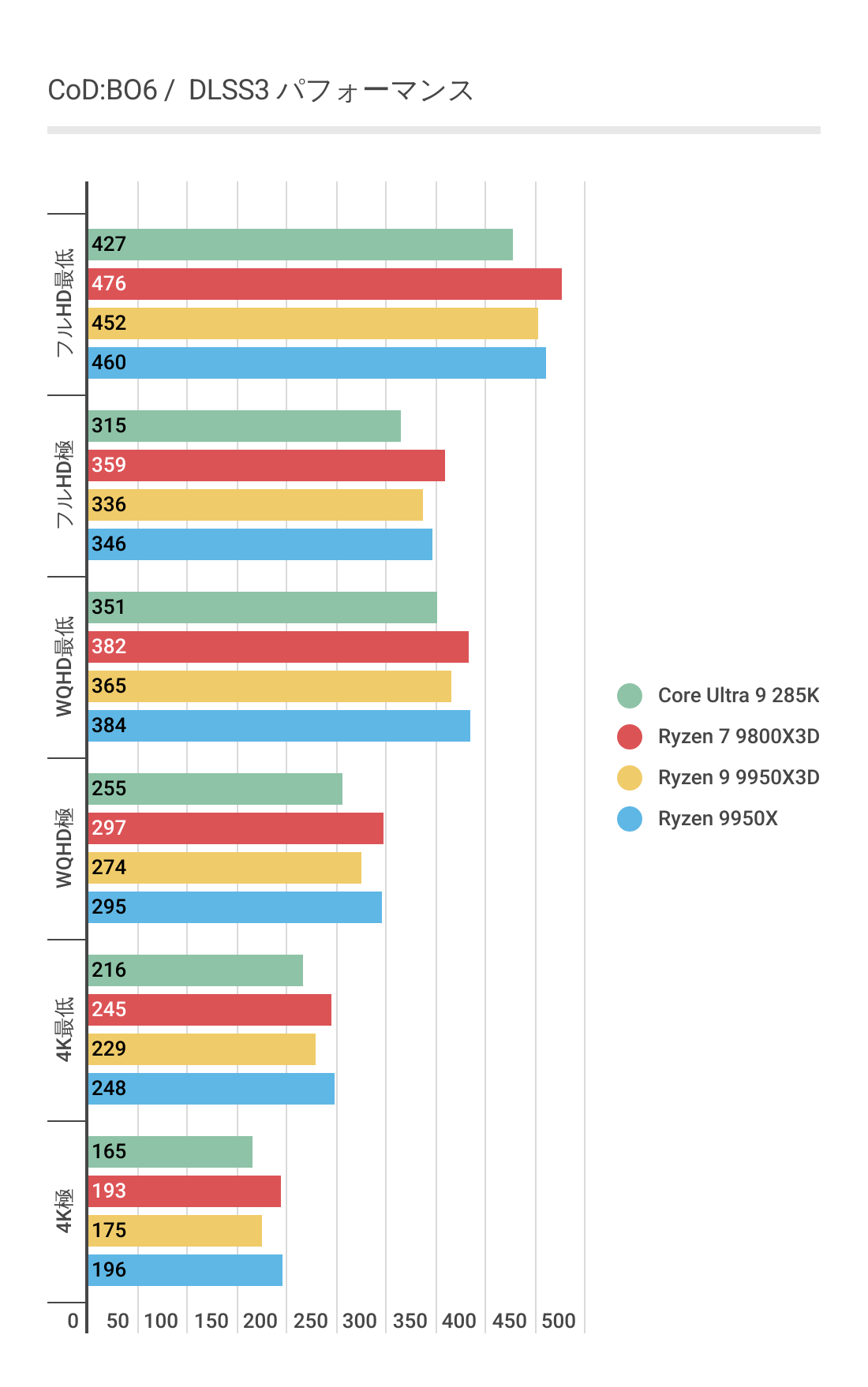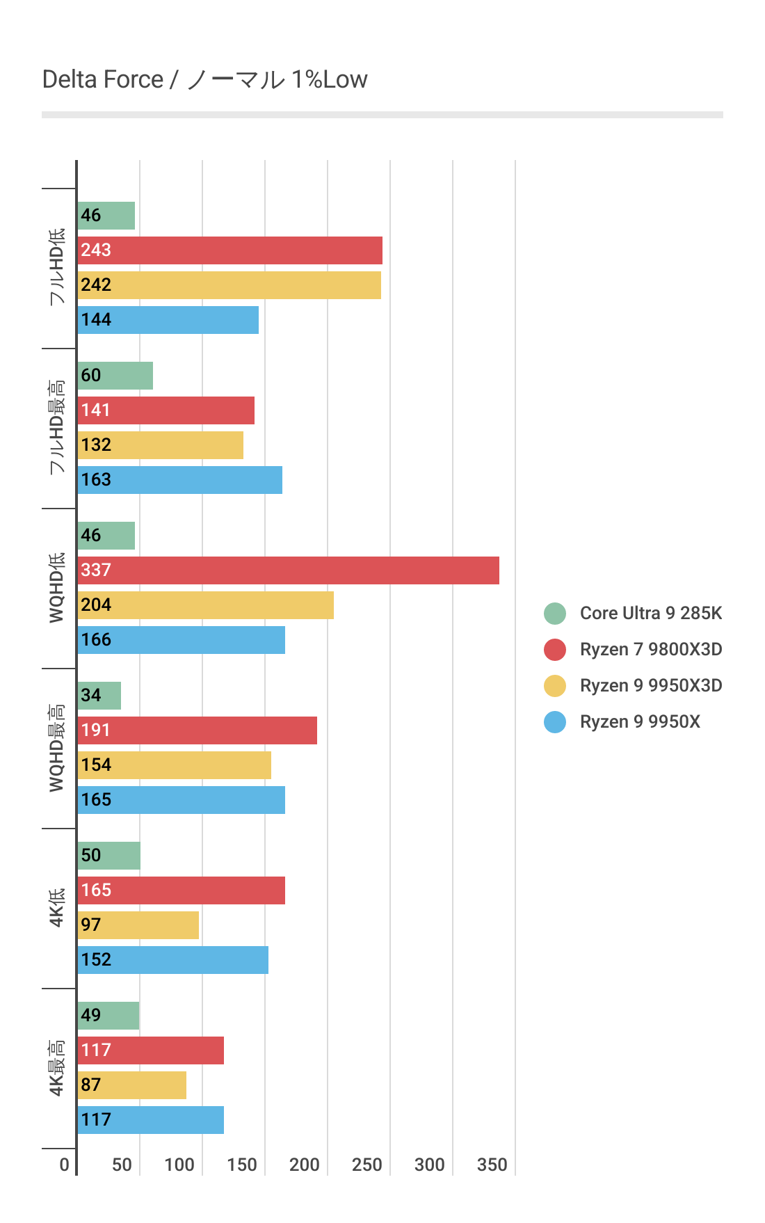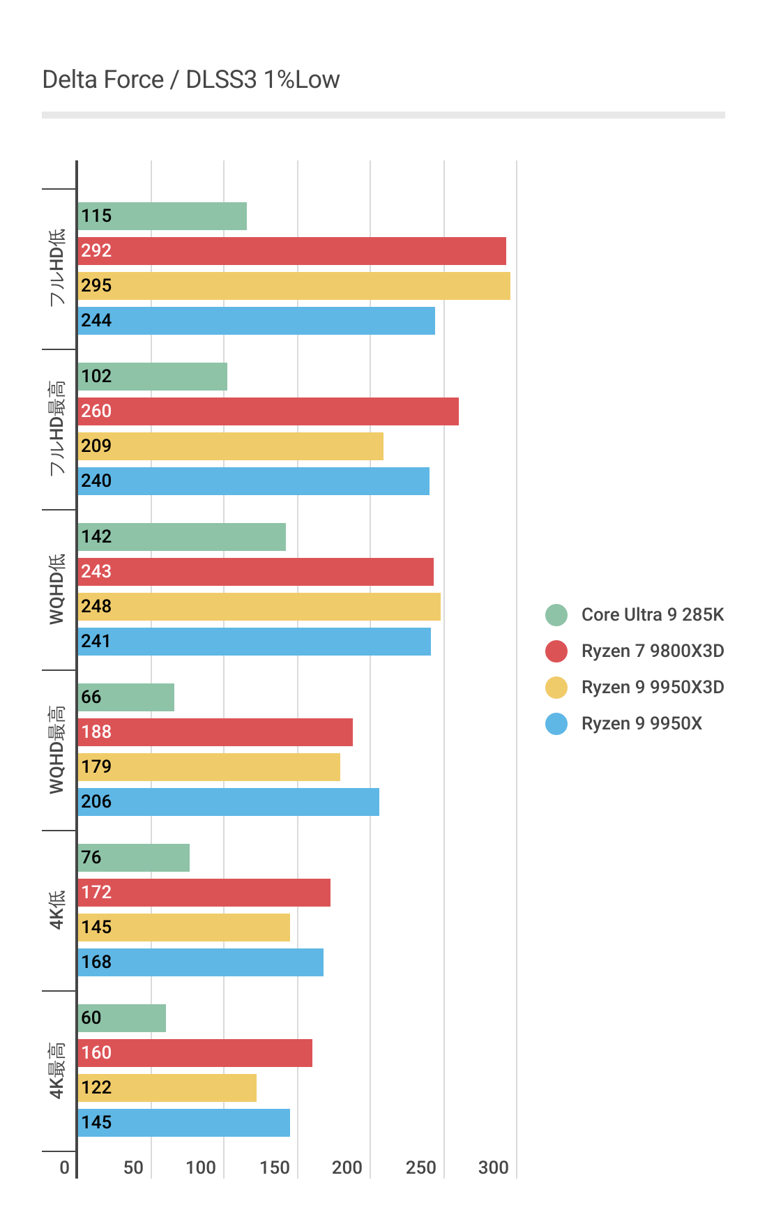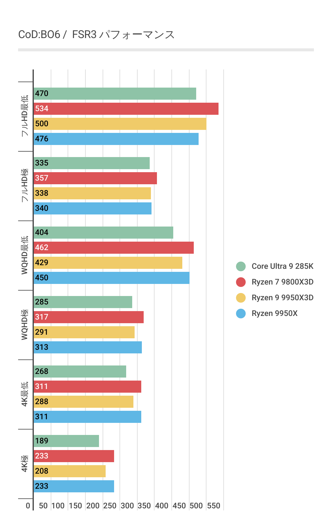 基本的にはCPUによるフレームレートの差はあまりない傾向にありますが、Ryzen 7 9800X3D対しては微差ですが上回るフレームレートがでています。