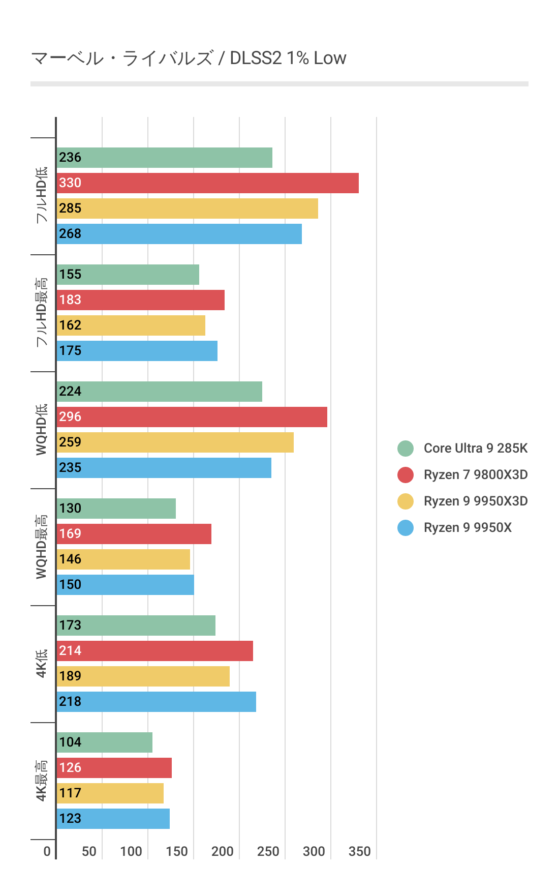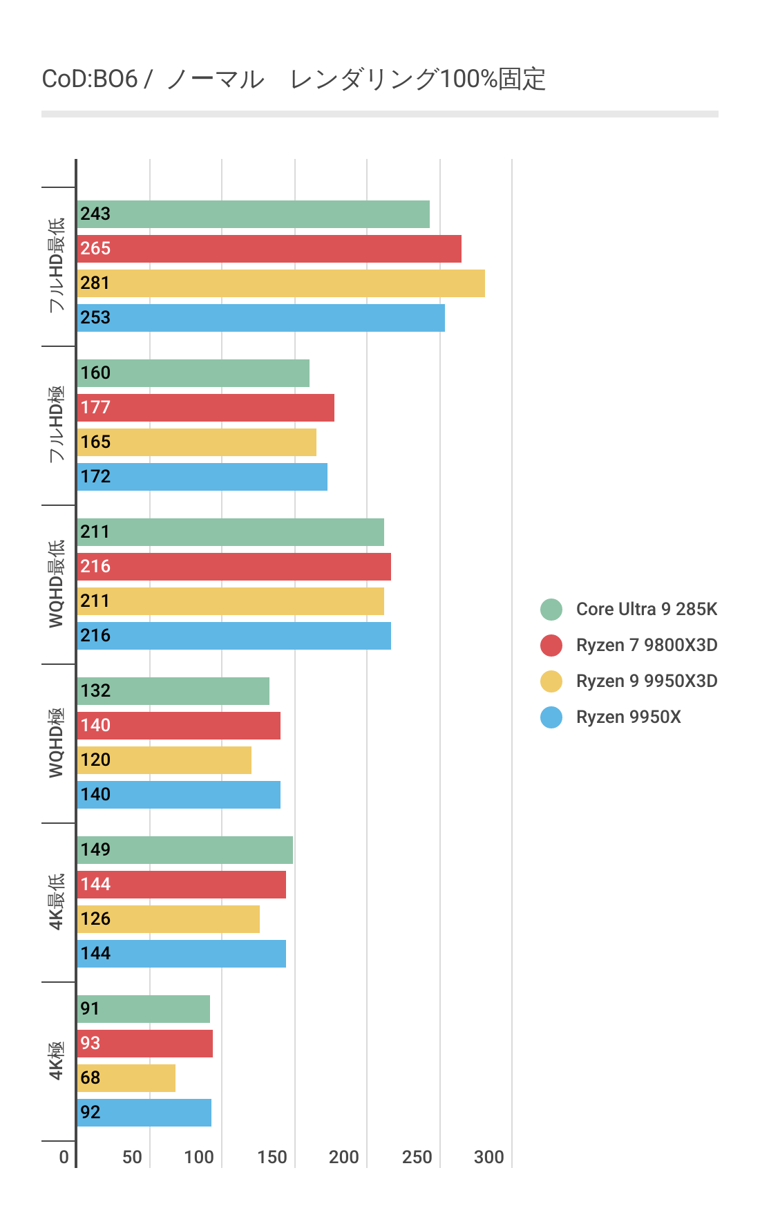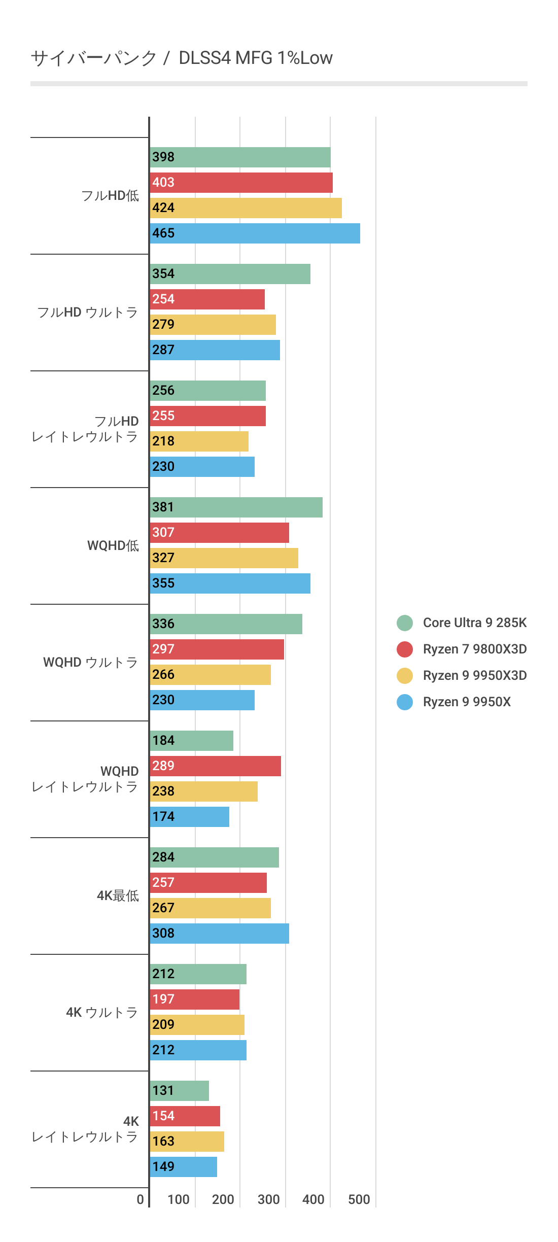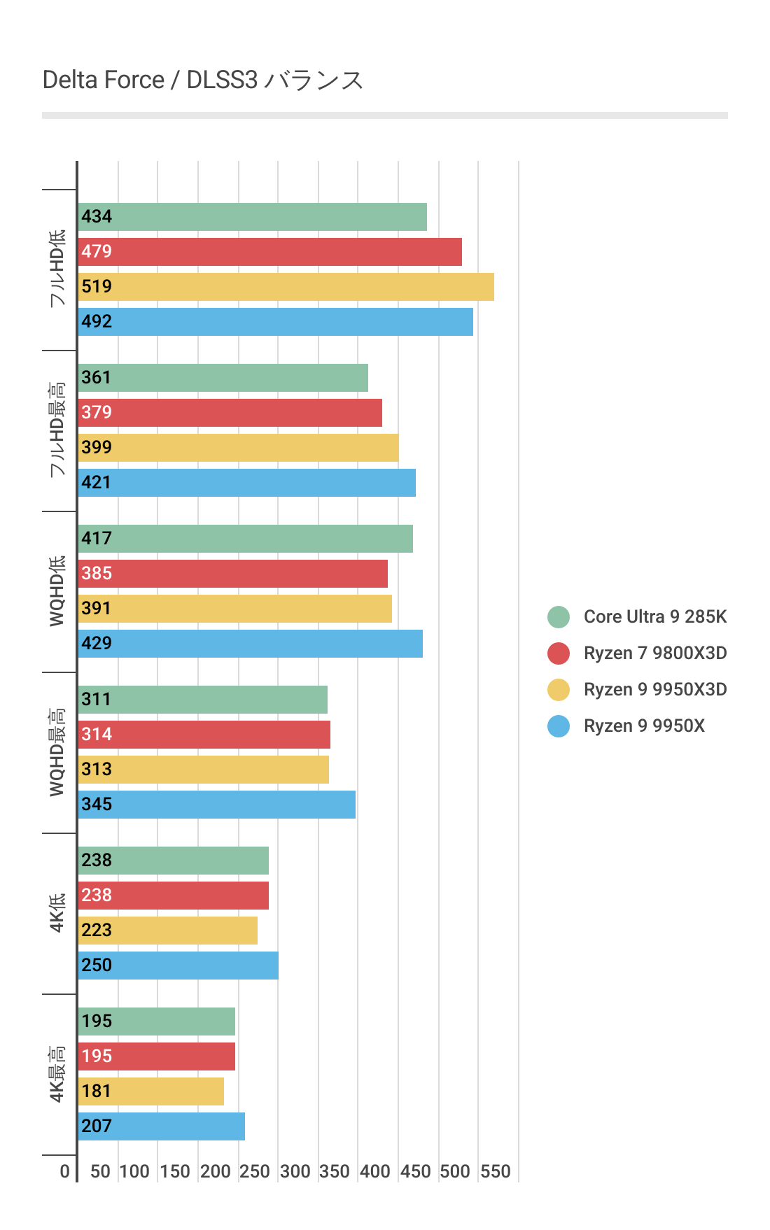 基本的にはCPUによるフレームレートの差はあまりない傾向にありますが、Ryzen 7 9800X3D対しては微差ですが上回るフレームレートがでています。