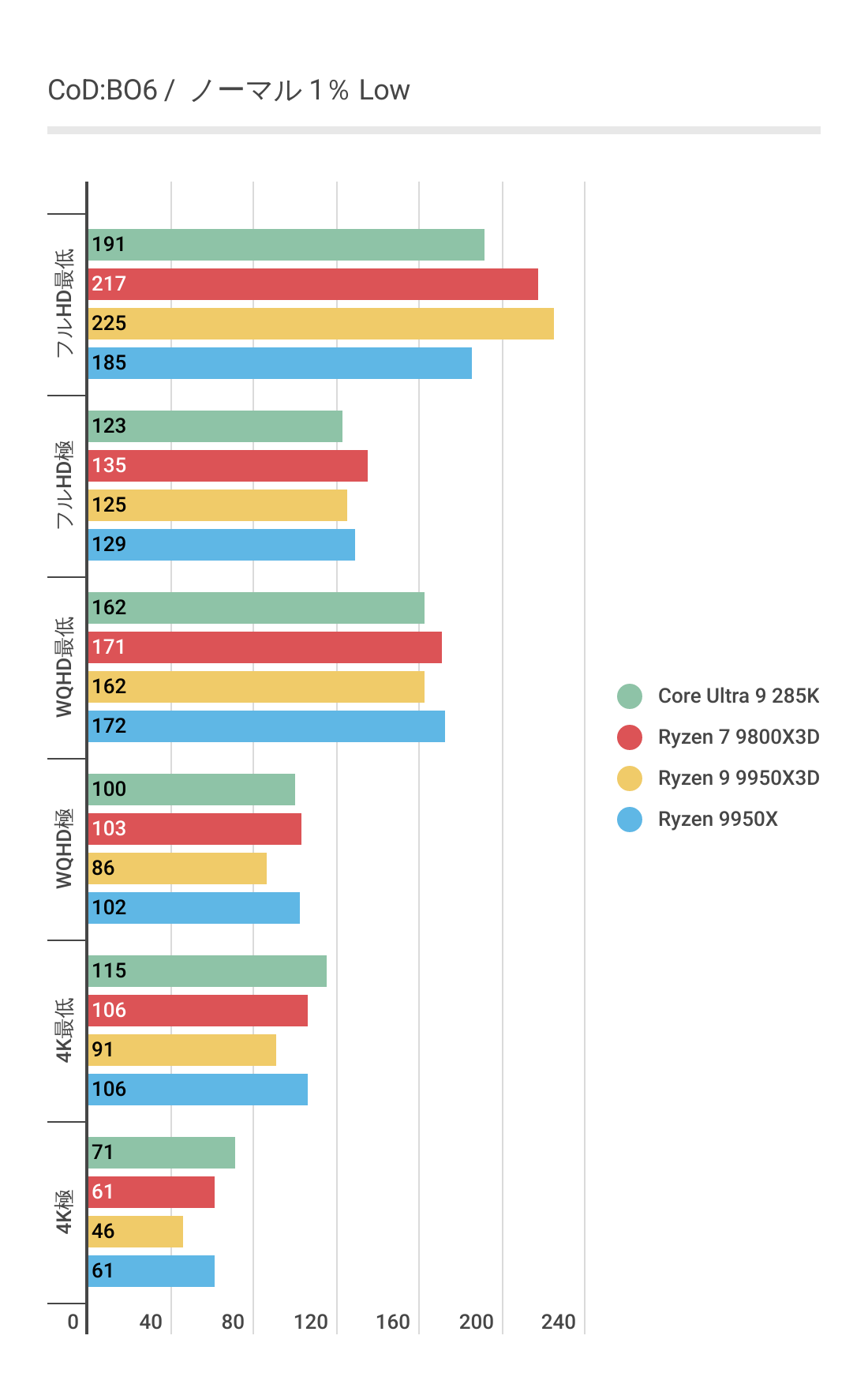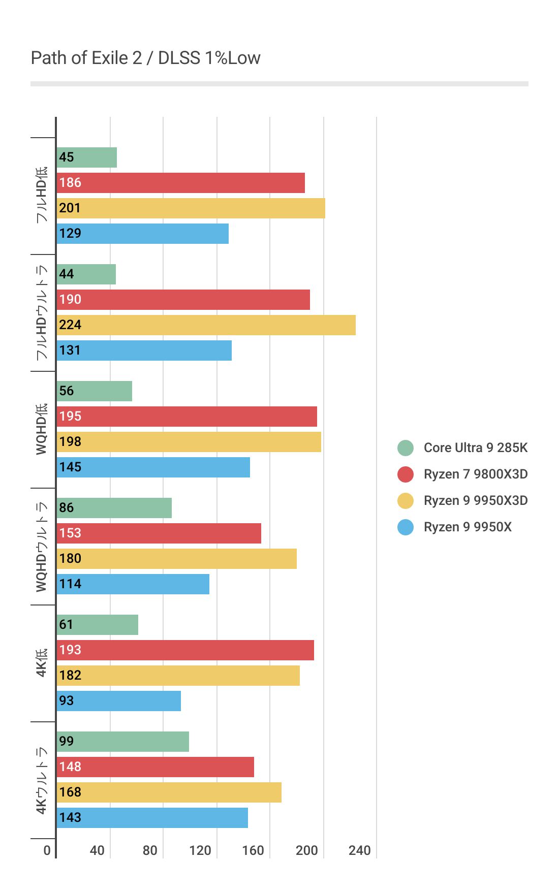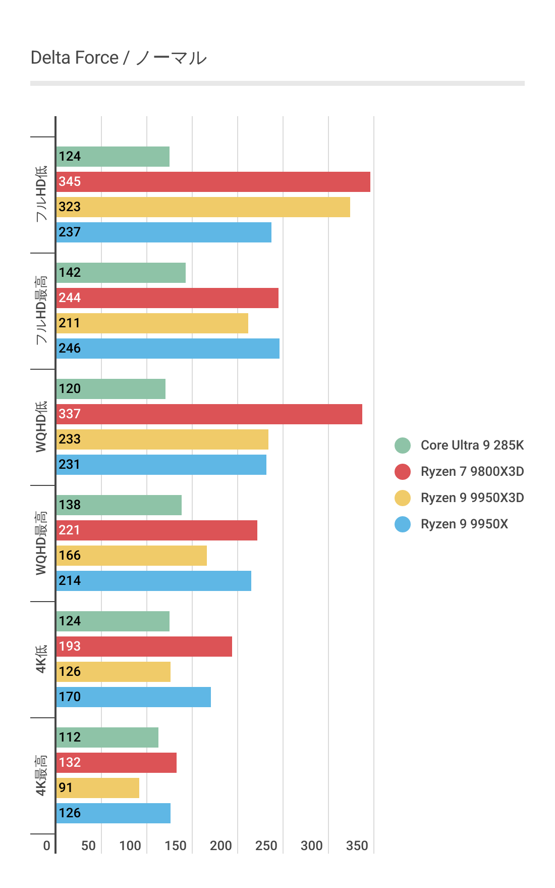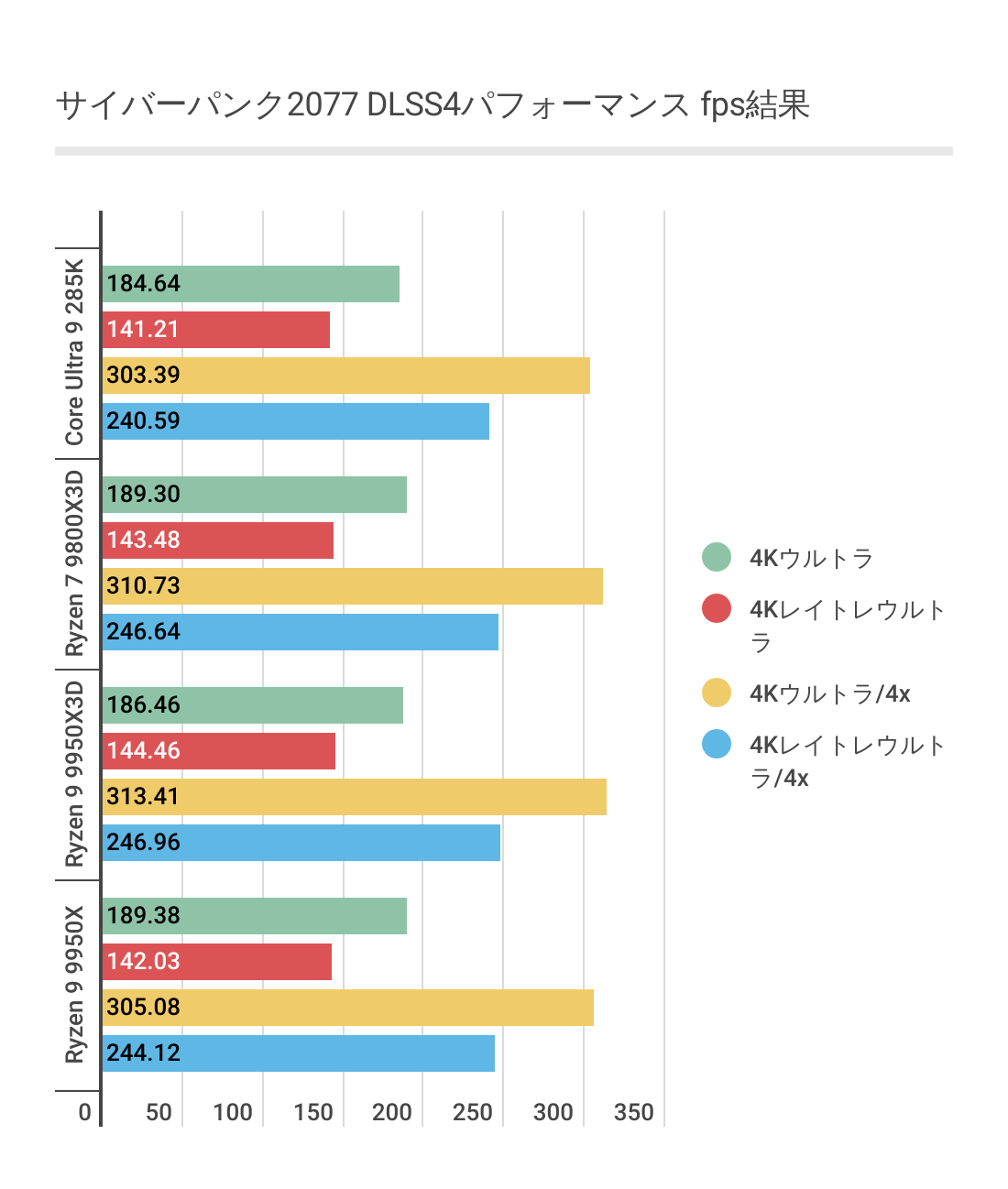 基本的にはCPUによるフレームレートの差はあまりない傾向にありますが、Ryzen 7 9800X3D対しては微差ですが上回るフレームレートがでています。