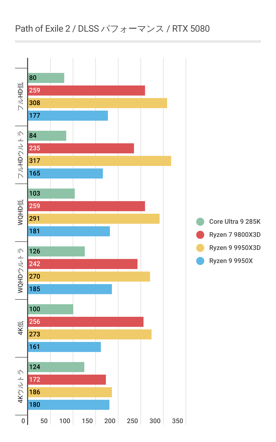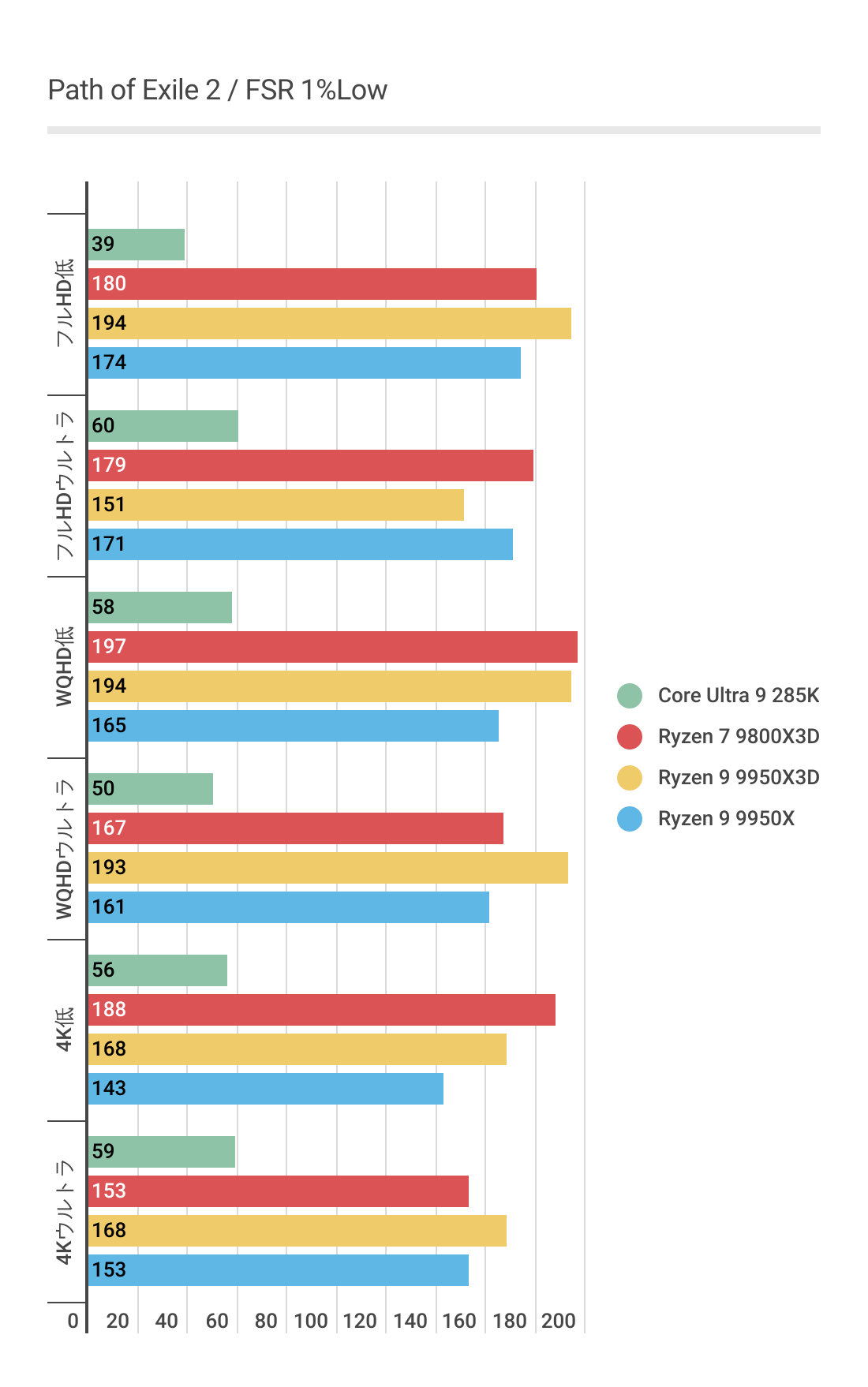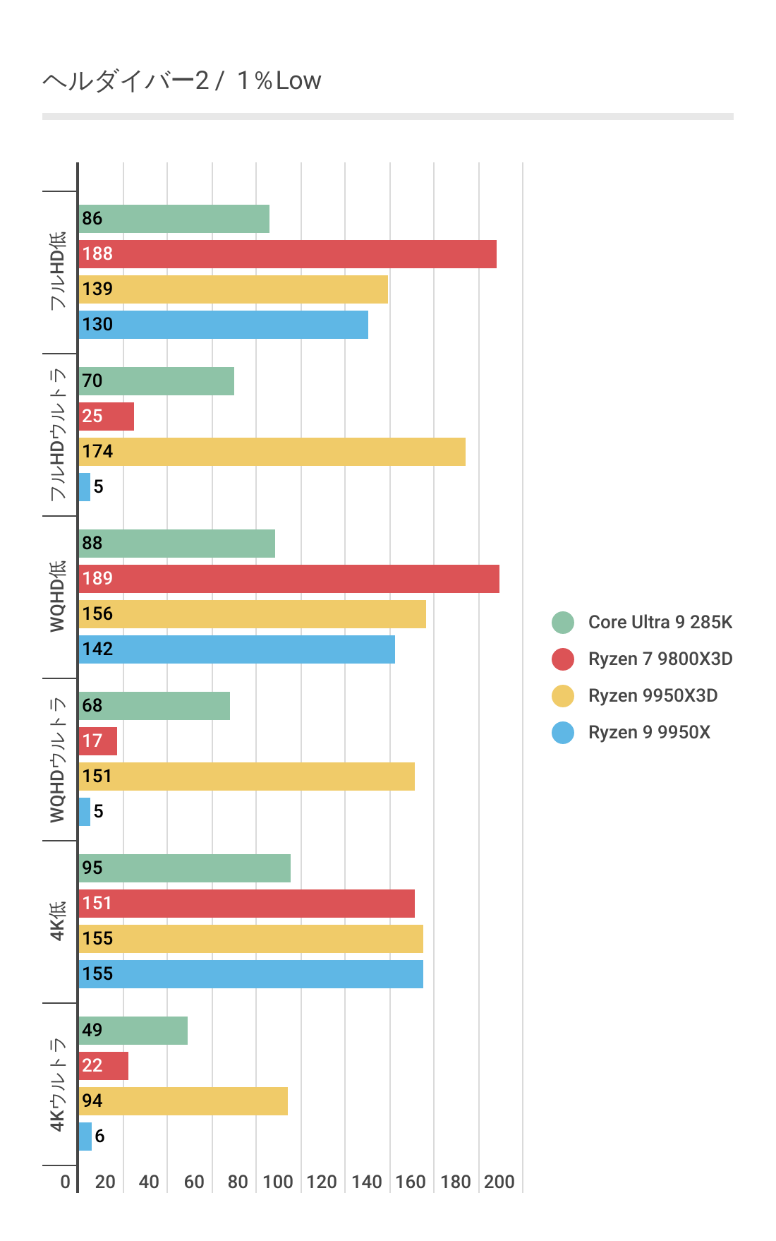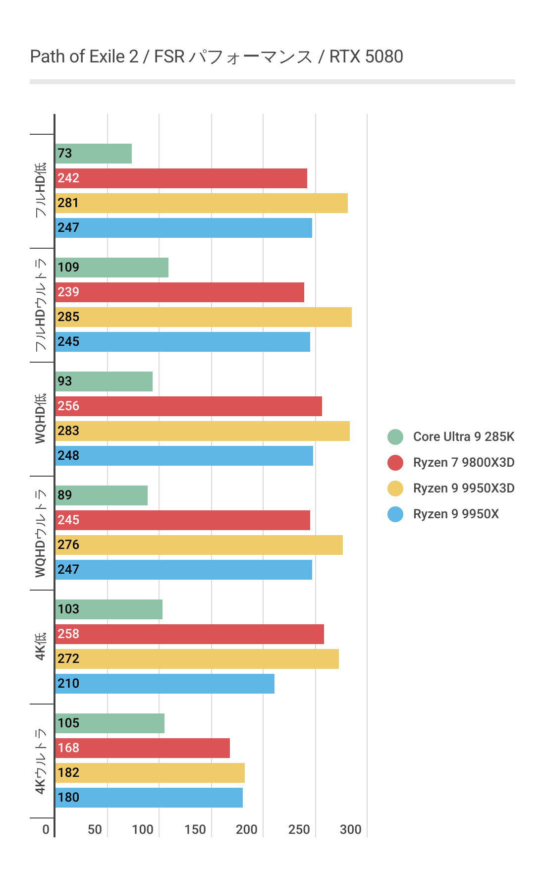 基本的にはCPUによるフレームレートの差はあまりない傾向にありますが、Ryzen 7 9800X3D対しては微差ですが上回るフレームレートがでています。