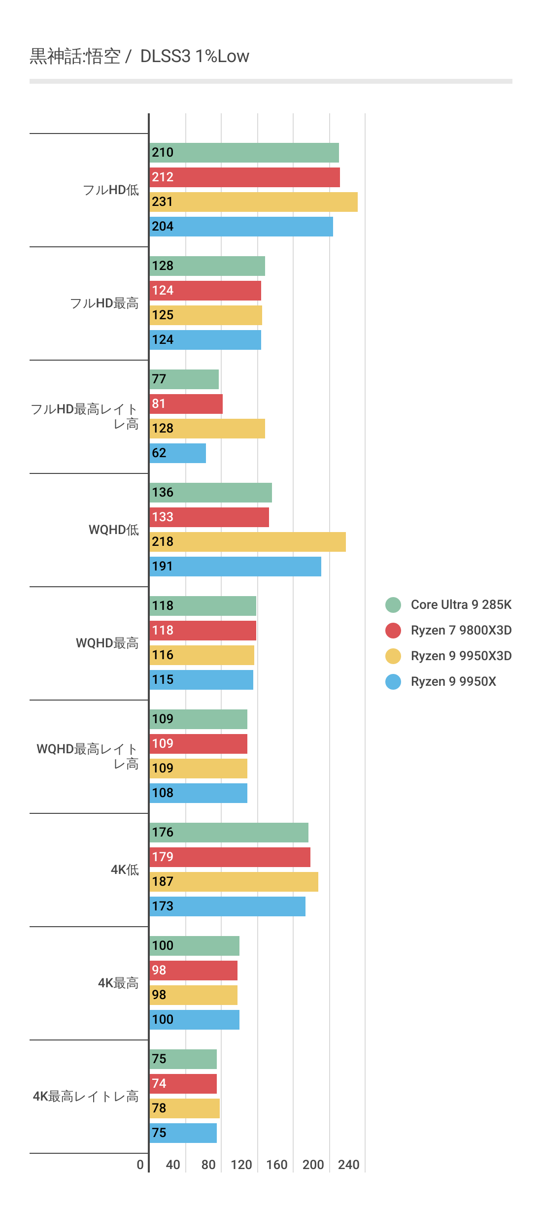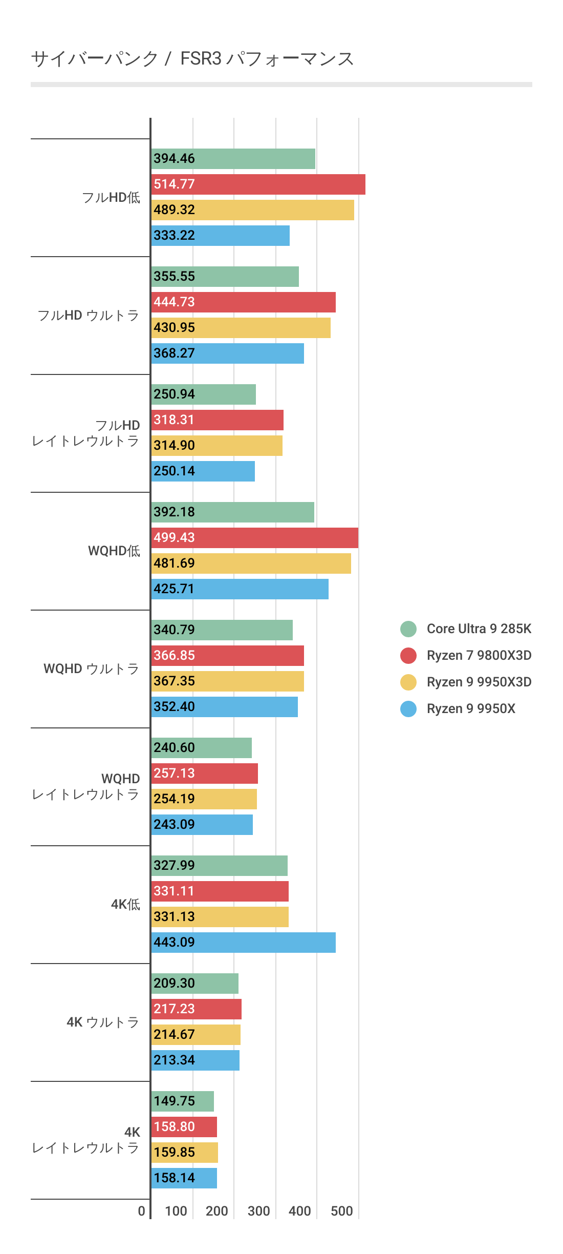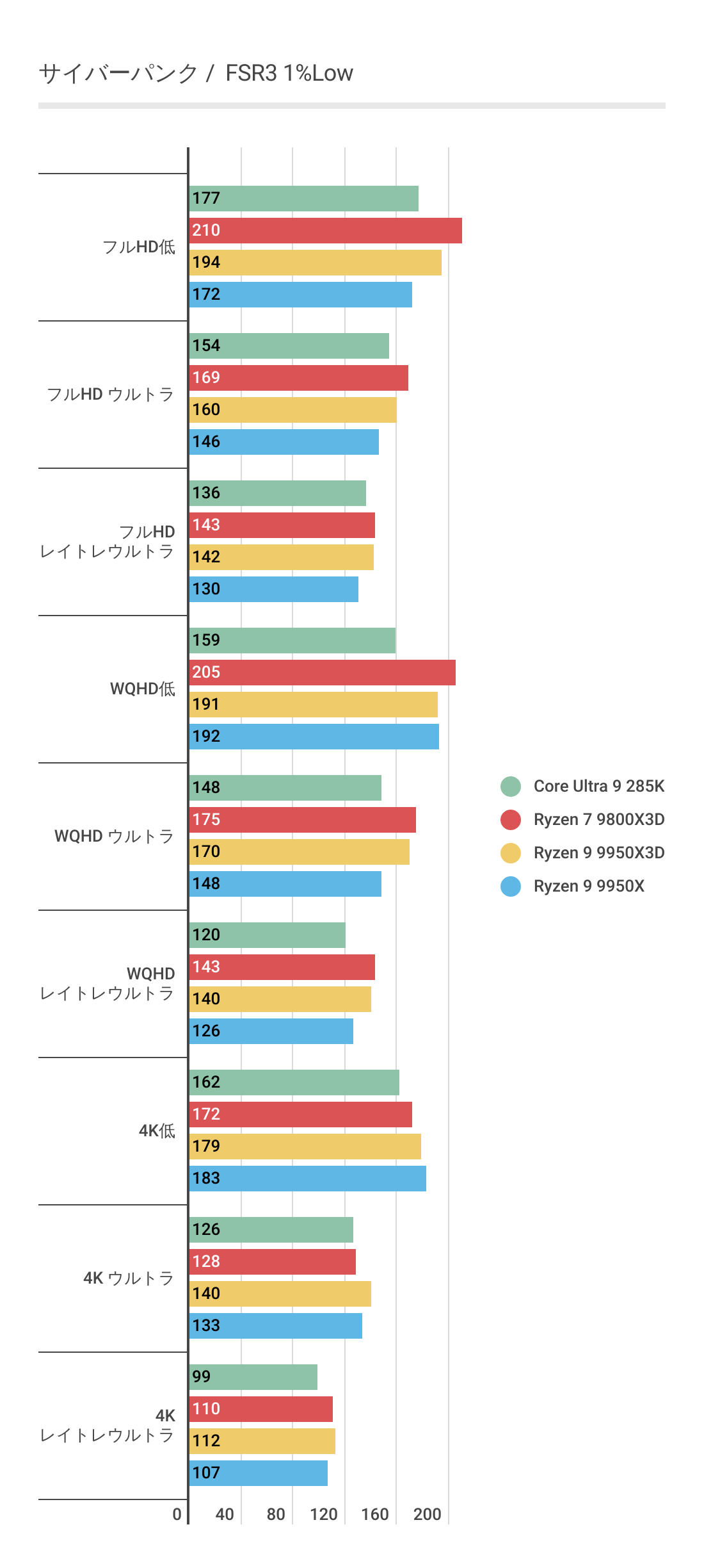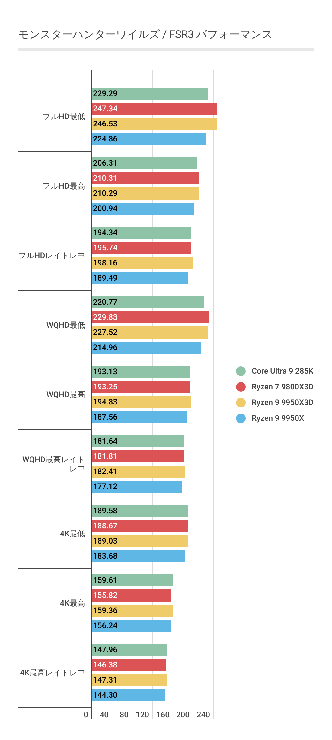 DLSS3ではあまり違いがなかったフレームレートですが、FSR3では若干差がでておりRyzen 9 9950Xと比べればRyzen 9 9950X3Dのほうがフレームレートの伸びが良いです。またRyzen 7 9800X3Dにも基本的にフレームレートが優っています。