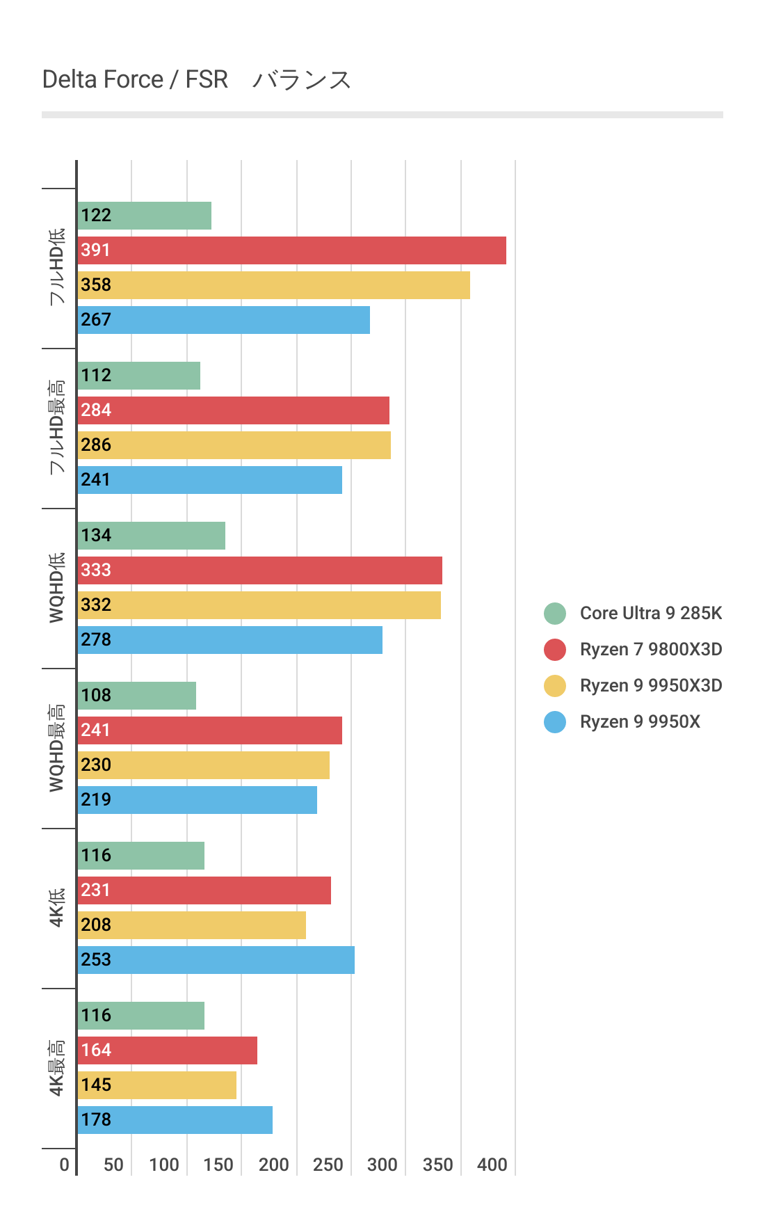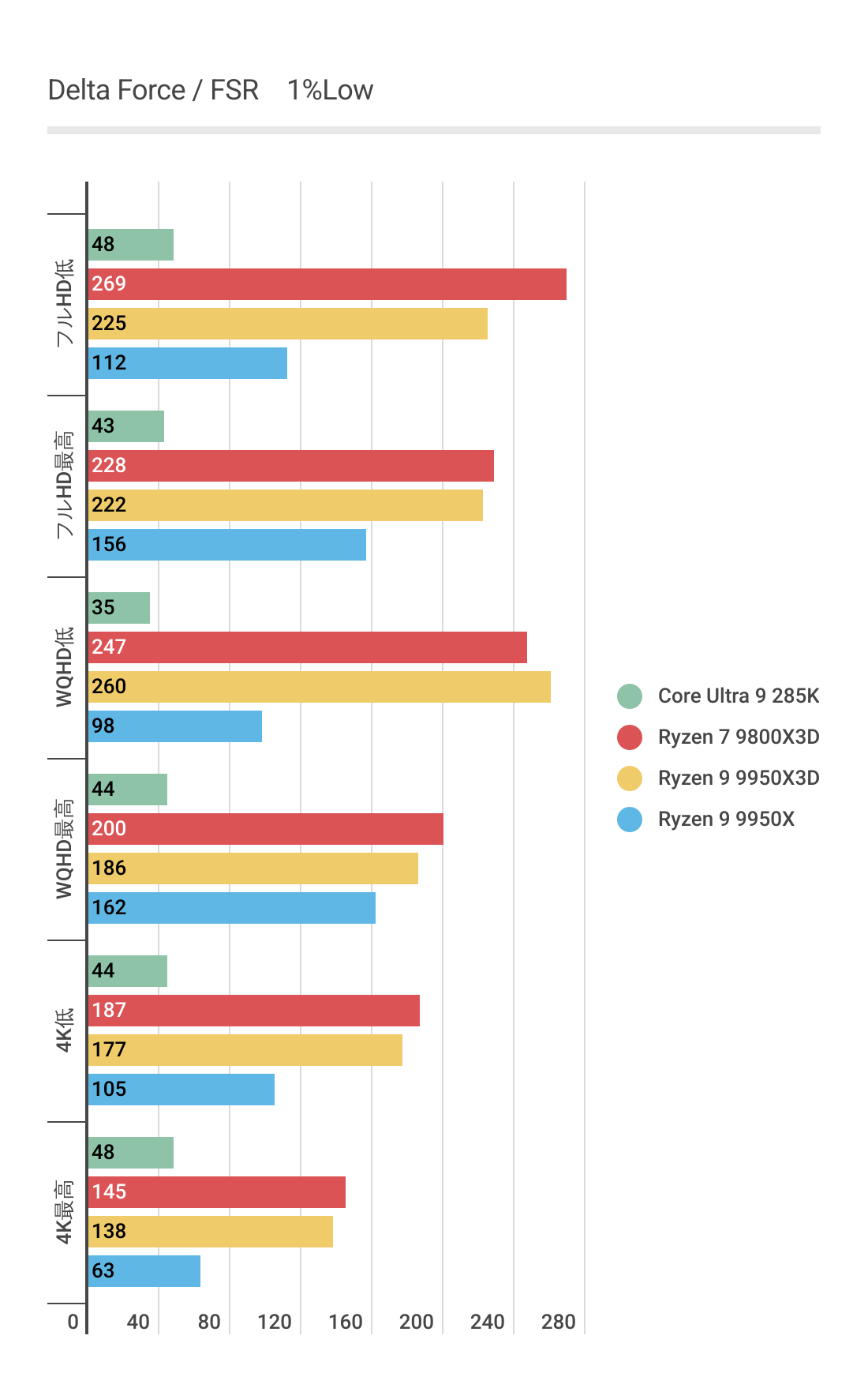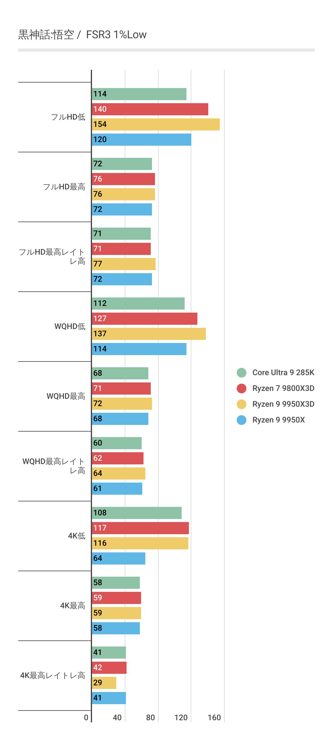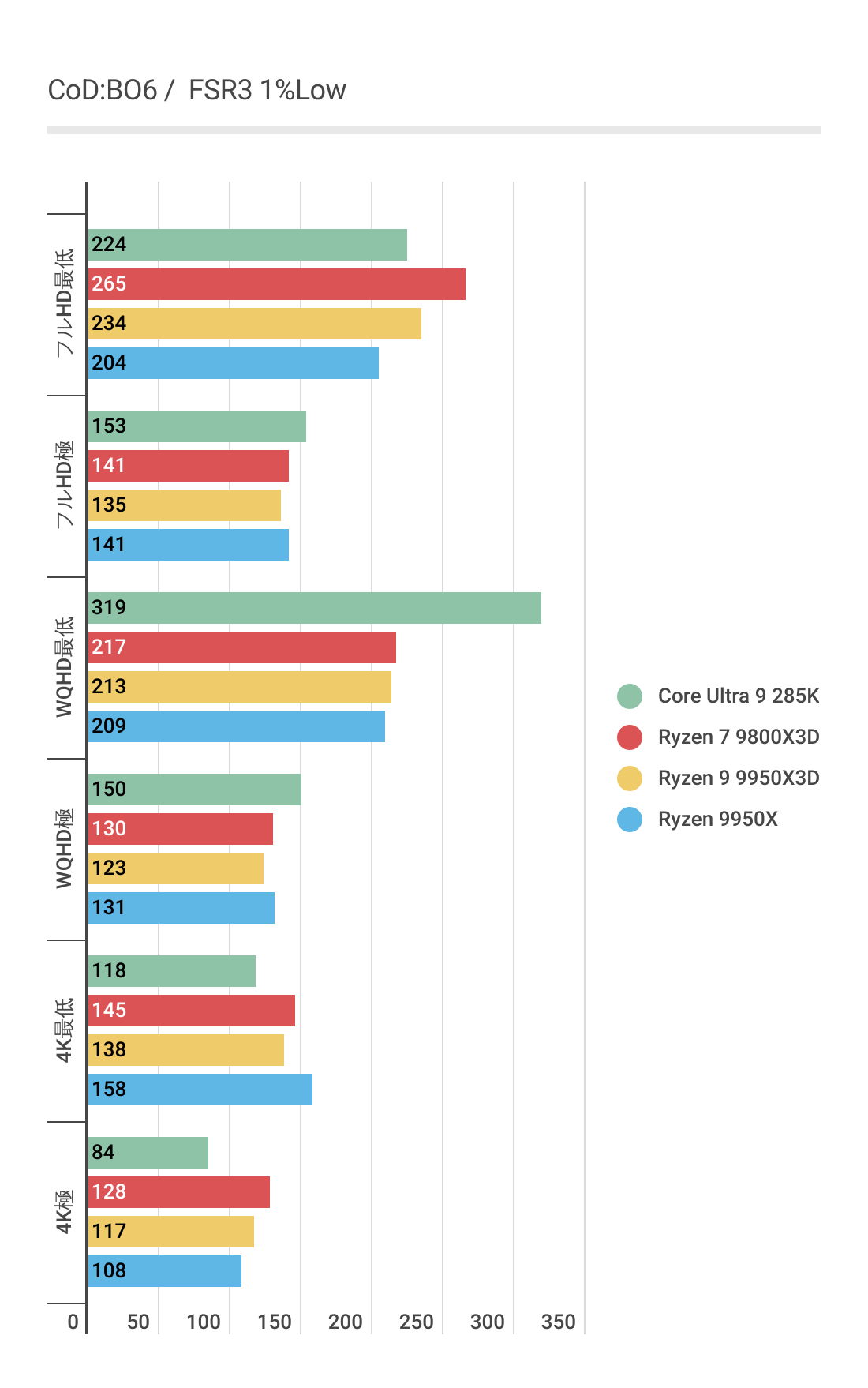 DLSS3ではあまり違いがなかったフレームレートですが、FSR3では若干差がでておりRyzen 9 9950Xと比べればRyzen 9 9950X3Dのほうがフレームレートの伸びが良いです。またRyzen 7 9800X3Dにも基本的にフレームレートが優っています。