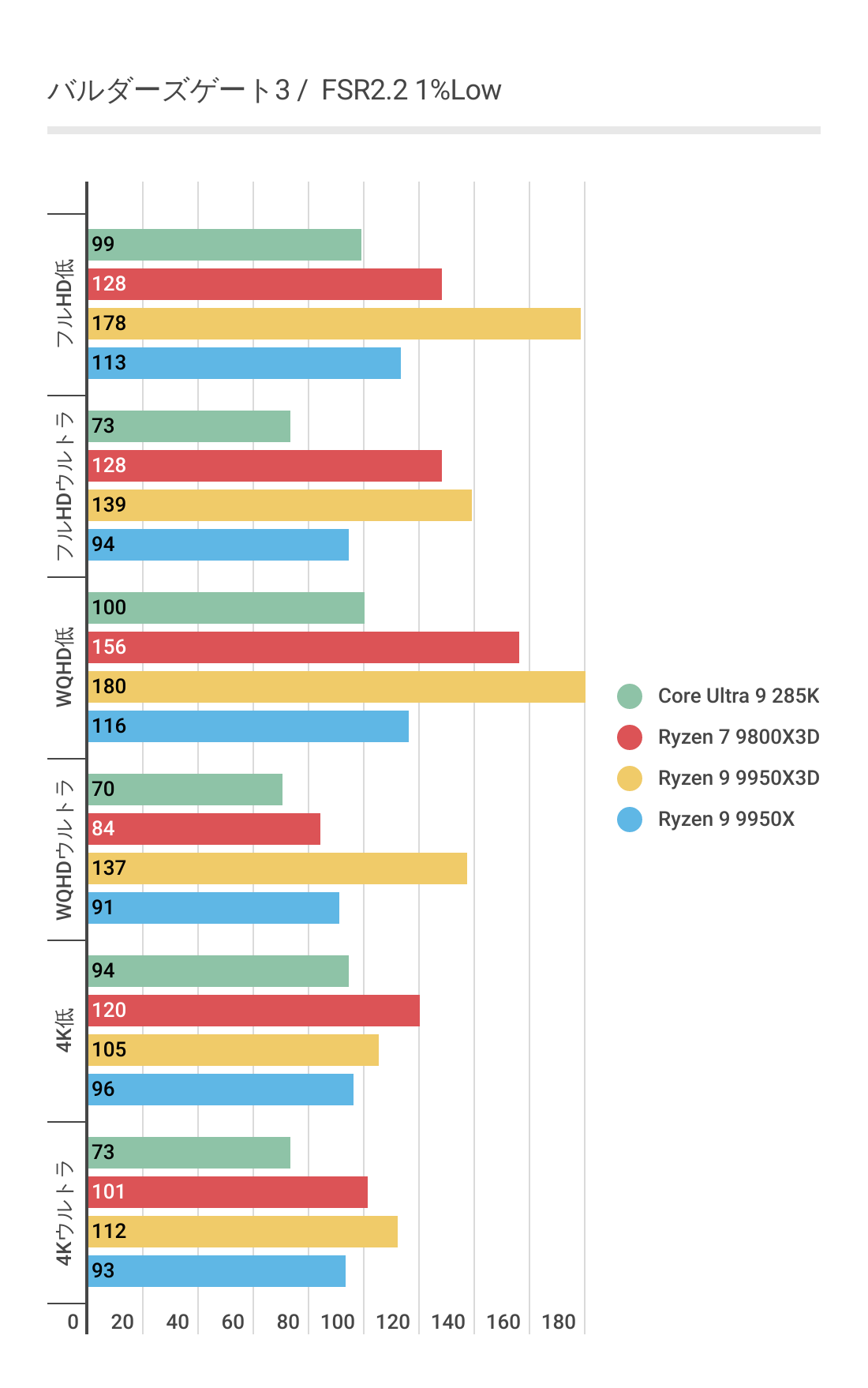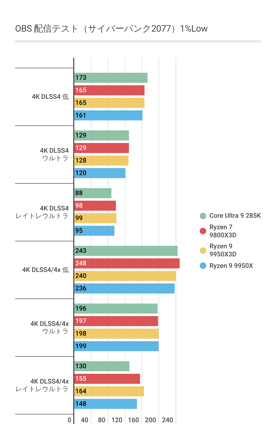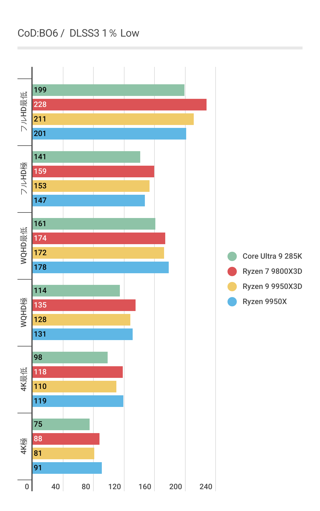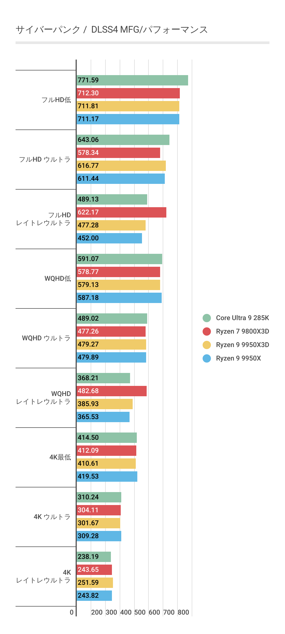 DLSS3ではあまり違いがなかったフレームレートですが、FSR3では若干差がでておりRyzen 9 9950Xと比べればRyzen 9 9950X3Dのほうがフレームレートの伸びが良いです。またRyzen 7 9800X3Dにも基本的にフレームレートが優っています。
