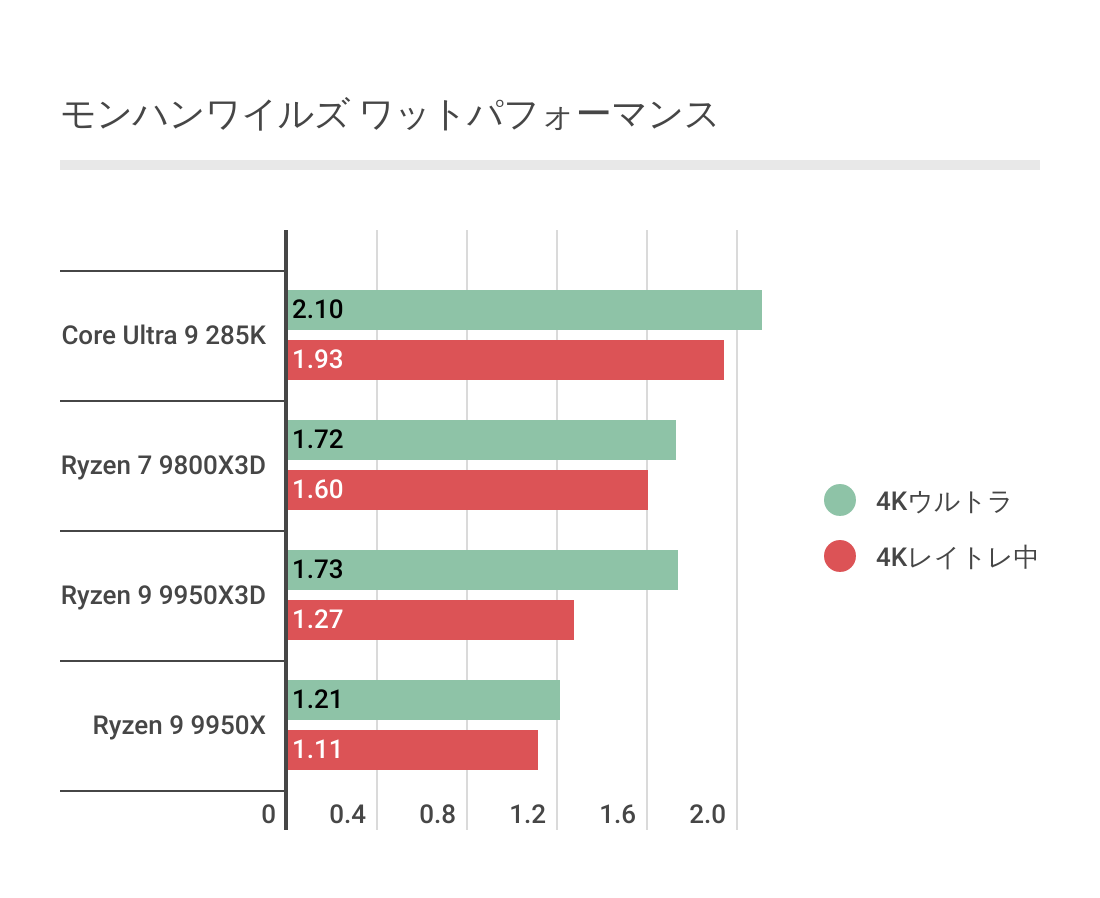 とはいえRyzen 9 9950X3DのゲームパフォーマンスはWindowsの処理による影響が大きいため、ゲームによってはCore Ultra 9 285KやRyzen 9 9950Xに負けることもありますし、ワットパフォーマンスも良くありません。